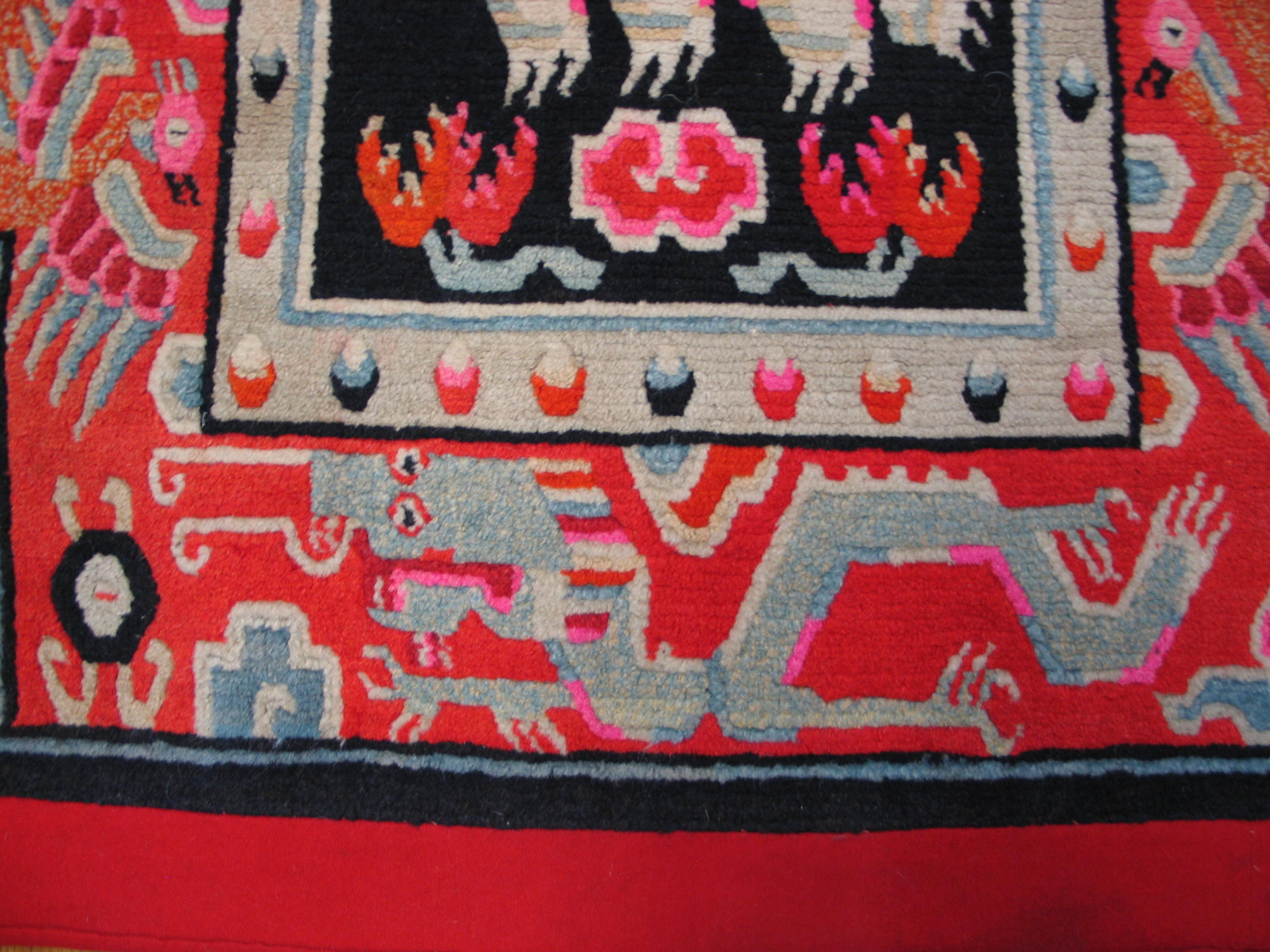 The central motifs, featuring stylized guardian beasts, are framed by complex, angular borders. These borders utilize sharp meanders and stepped elements, contributing to the overall geometric rugs aesthetic often found in regional textiles of this period. The meticulous handwork highlights the cultural significance embedded in every woven line.