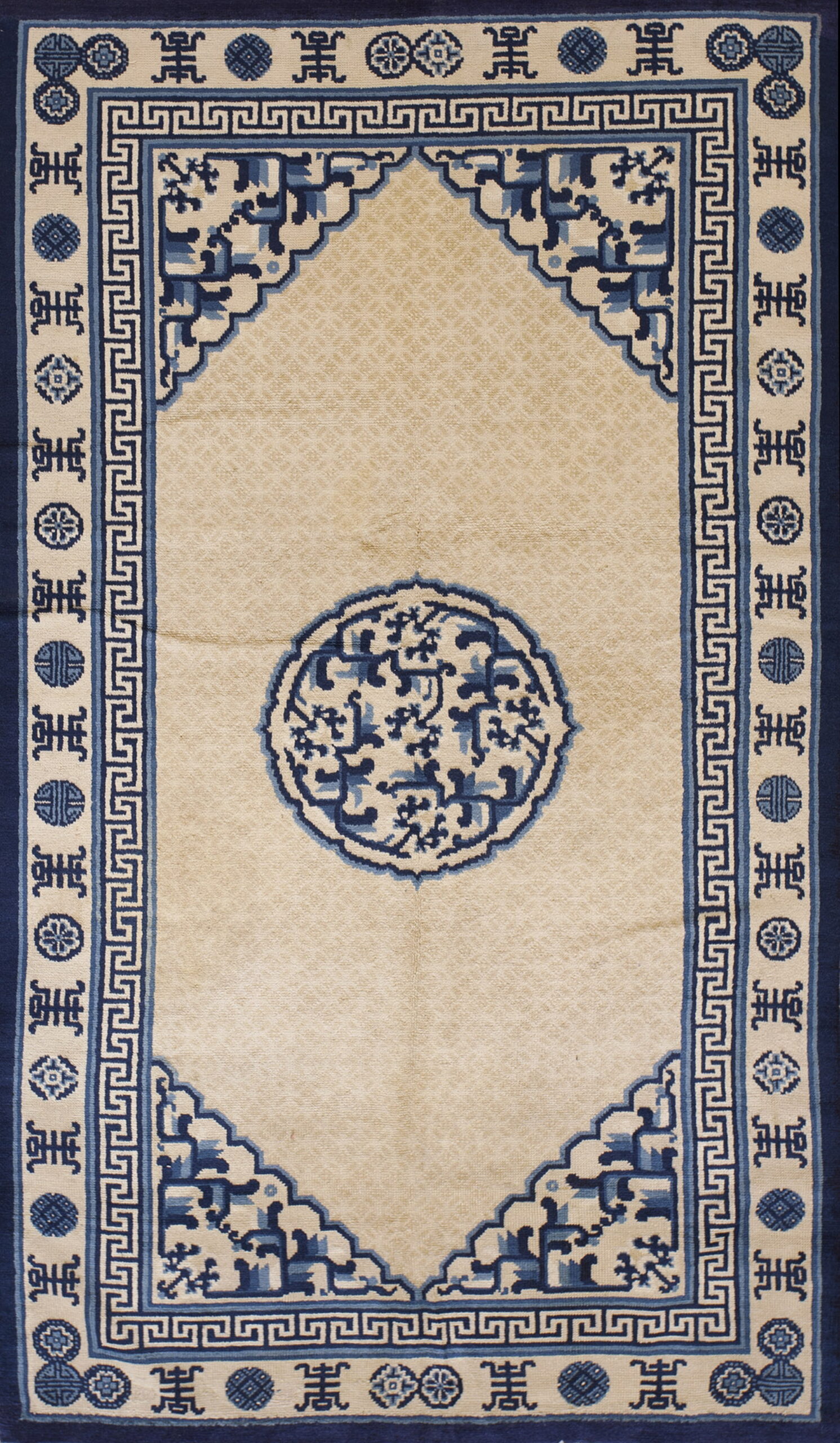 Antique Chinese – Peking Chinese Ivory 1930s Ivory Rug, Circa Date: 1930s. This exceptional example of early 20th-century weaving represents the finest traditions of antique rugs produced in the Peking region. The design exhibits the architectural clarity and restrained palette characteristic of the era, making it a highly desirable piece for collectors seeking museum-quality textiles.