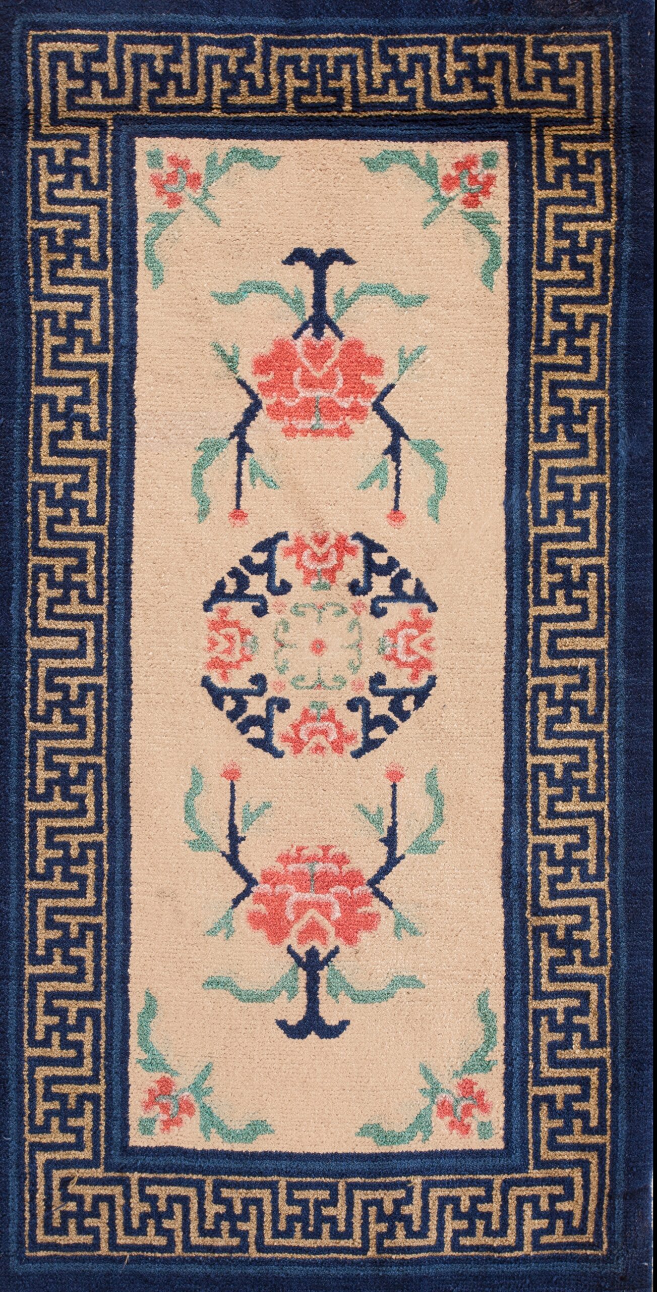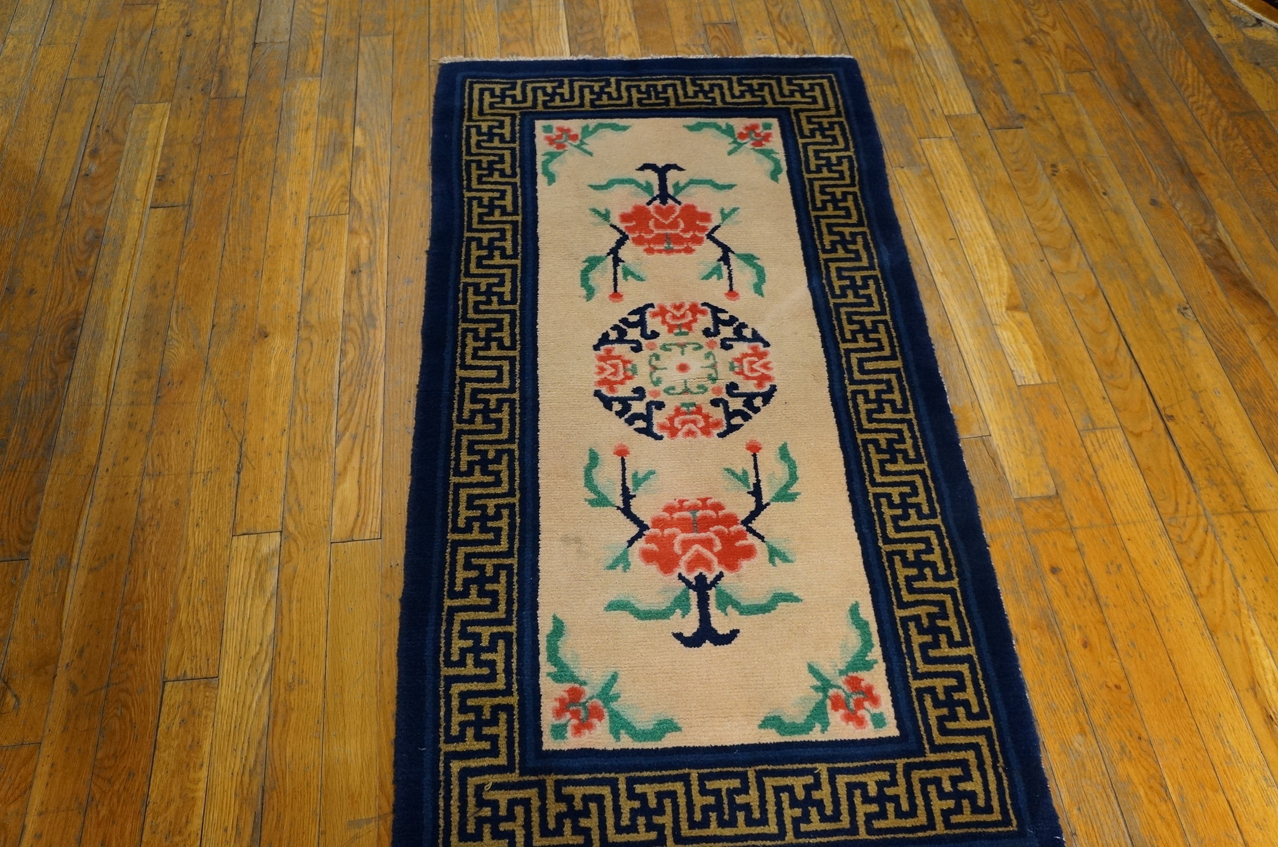 Knotted Wool Ivory 1920s Chinese Small Scatter Size – Peking Rectangle Antique Rug, Circa Date: 1920s. This exceptional Chinese Peking piece, dating from the early Republican era, is presented in a highly desirable small scatter size. Its elongated rectangular format makes it an ideal accent piece for hallways, entryways, or intimate spaces requiring a defined splash of color and historical texture.