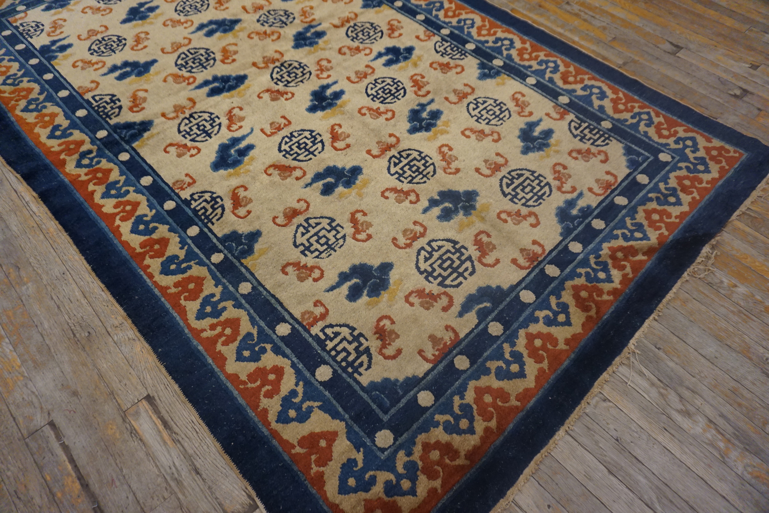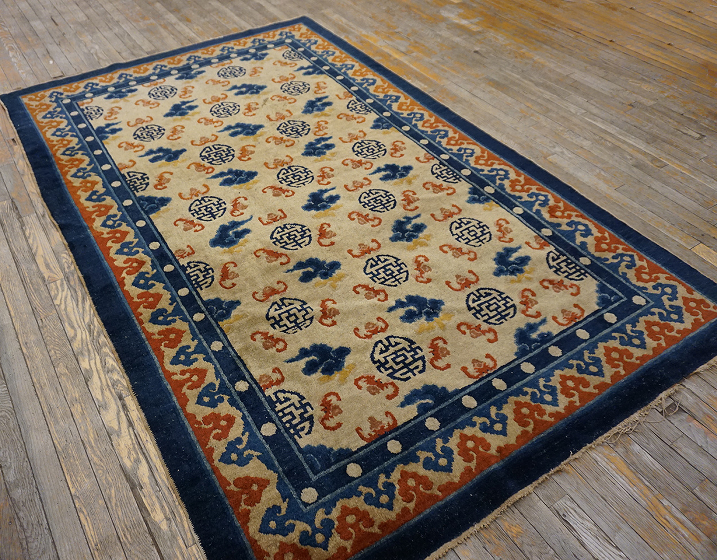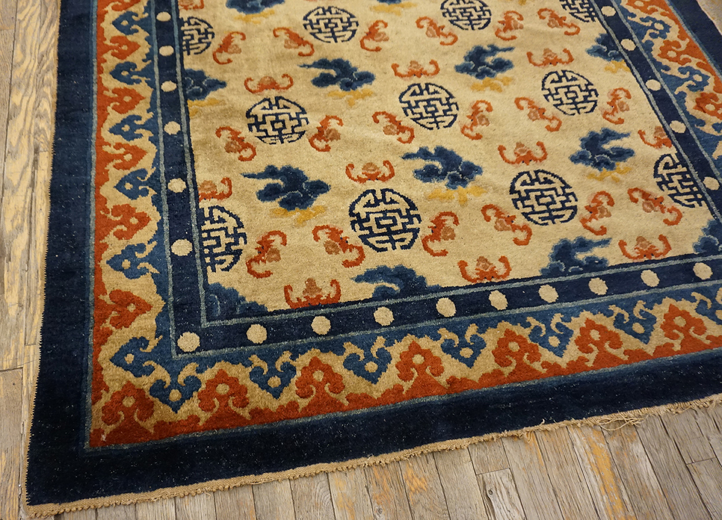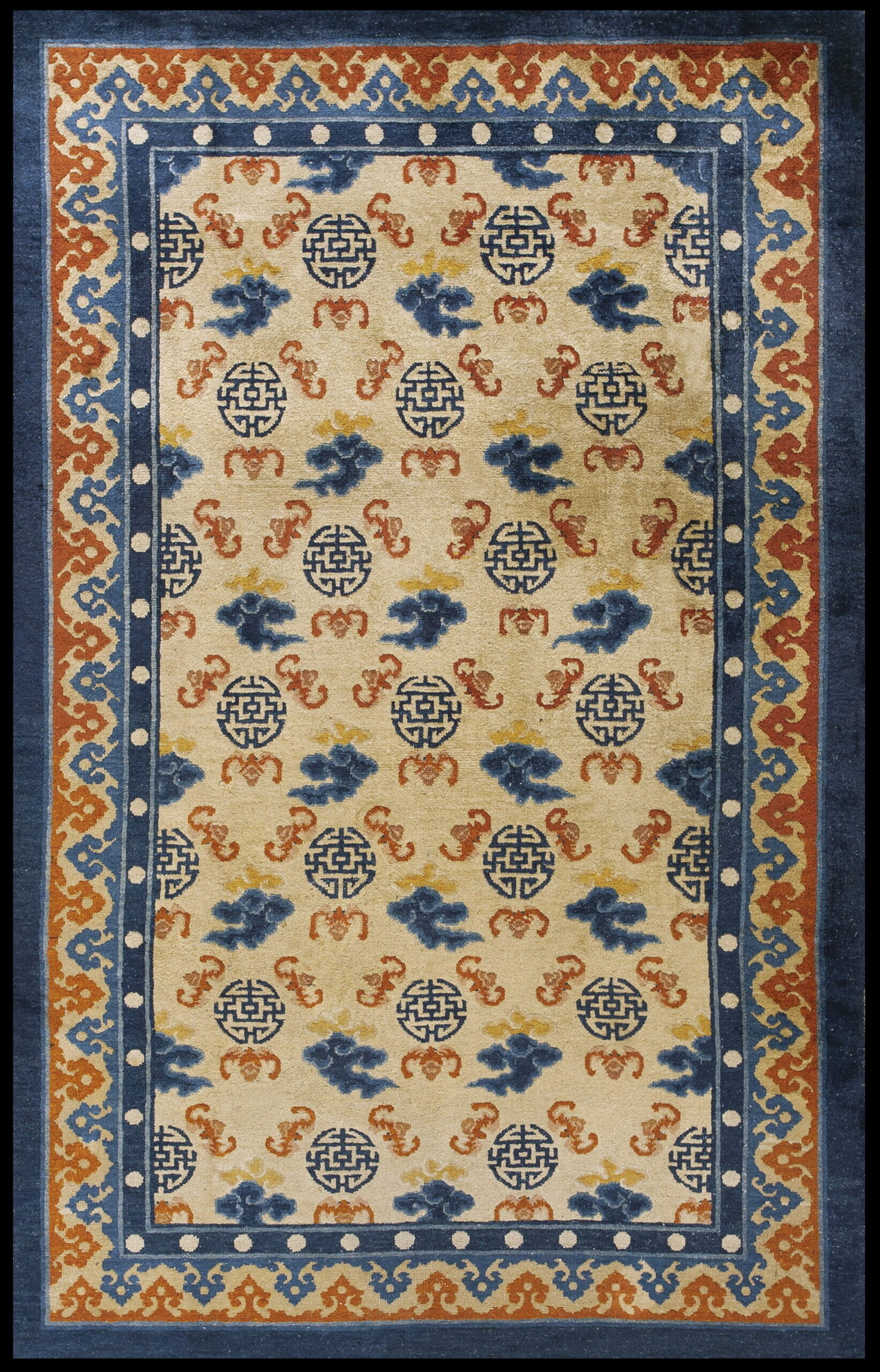 The central field features a carefully balanced allover pattern of auspicious symbols, including Ruyi cloud forms and intricate longevity symbols. This rhythmic repetition creates visual movement, drawing the eye down the length of the piece while maintaining a sense of classical order inherent in Chinese textile design. Given the intended use as a small scatter size rug (5.02ft x 8ft), this piece offers substantial presence.