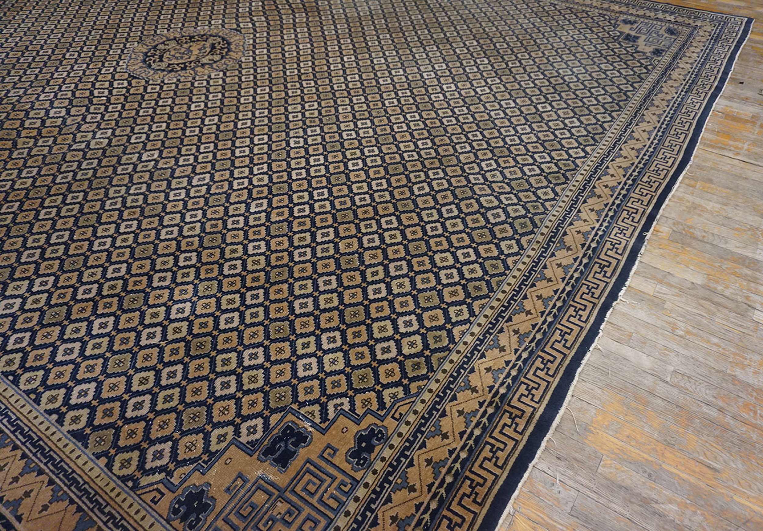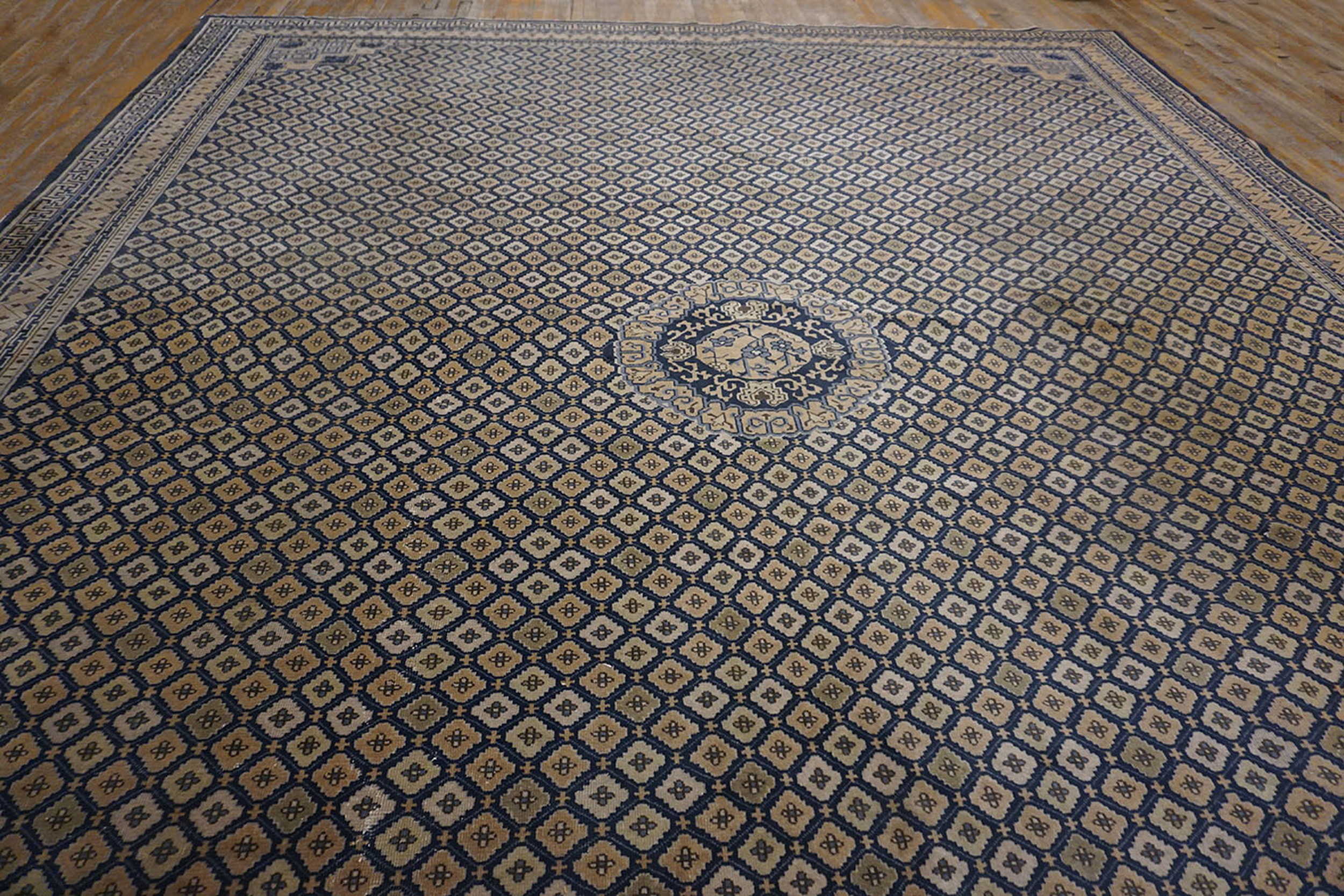 Rectangle Wool Allover Geometric Hand Knotted Pile 1920s Large Antique Blue Rug, Circa Date: 1920s. This exceptional piece, dating from the early 20th century, presents a sophisticated study in geometry and scale. Its generous dimensions classify it as large oversized, making it an ideal anchor for grand architectural spaces requiring both presence and historical depth.