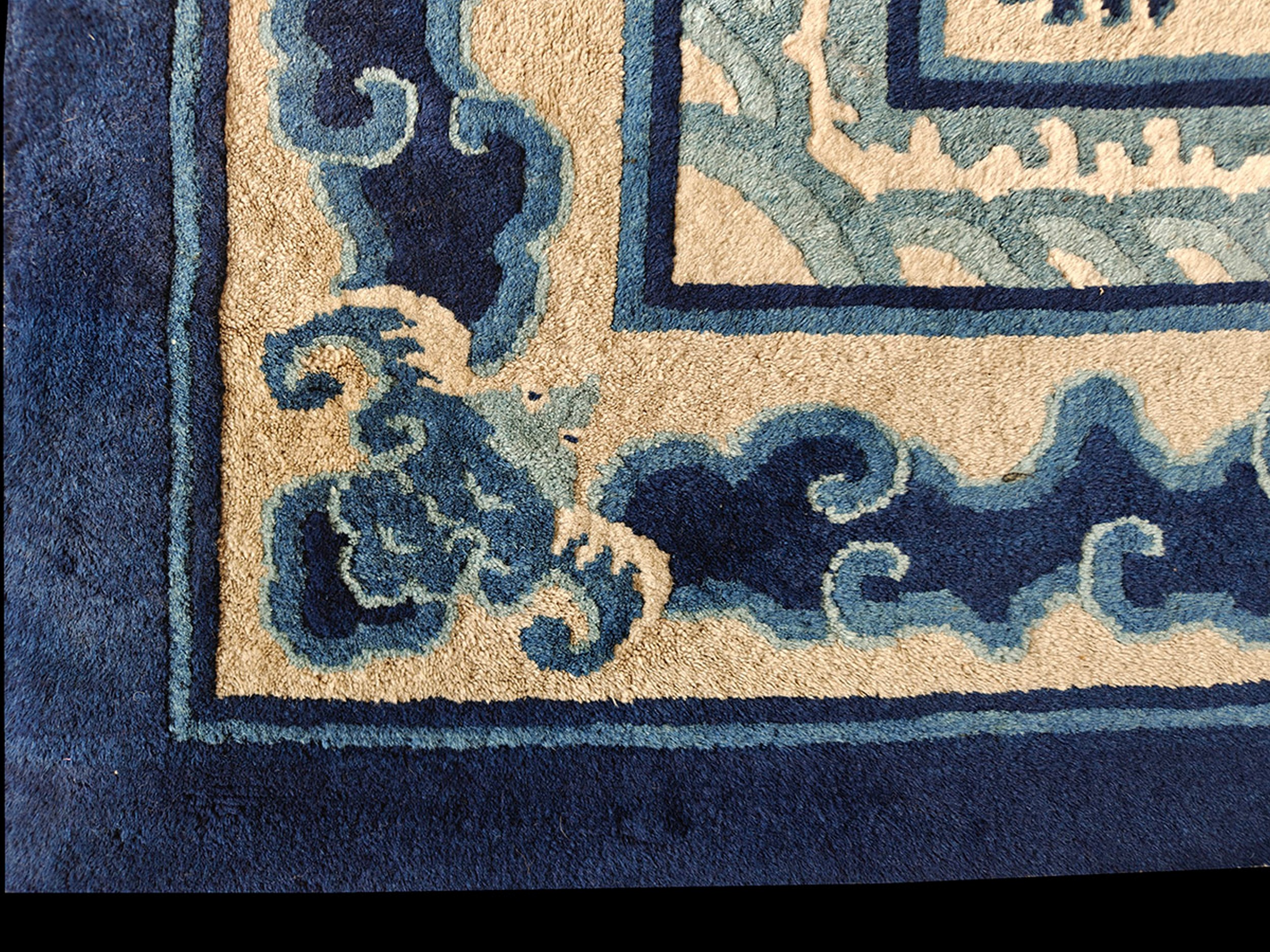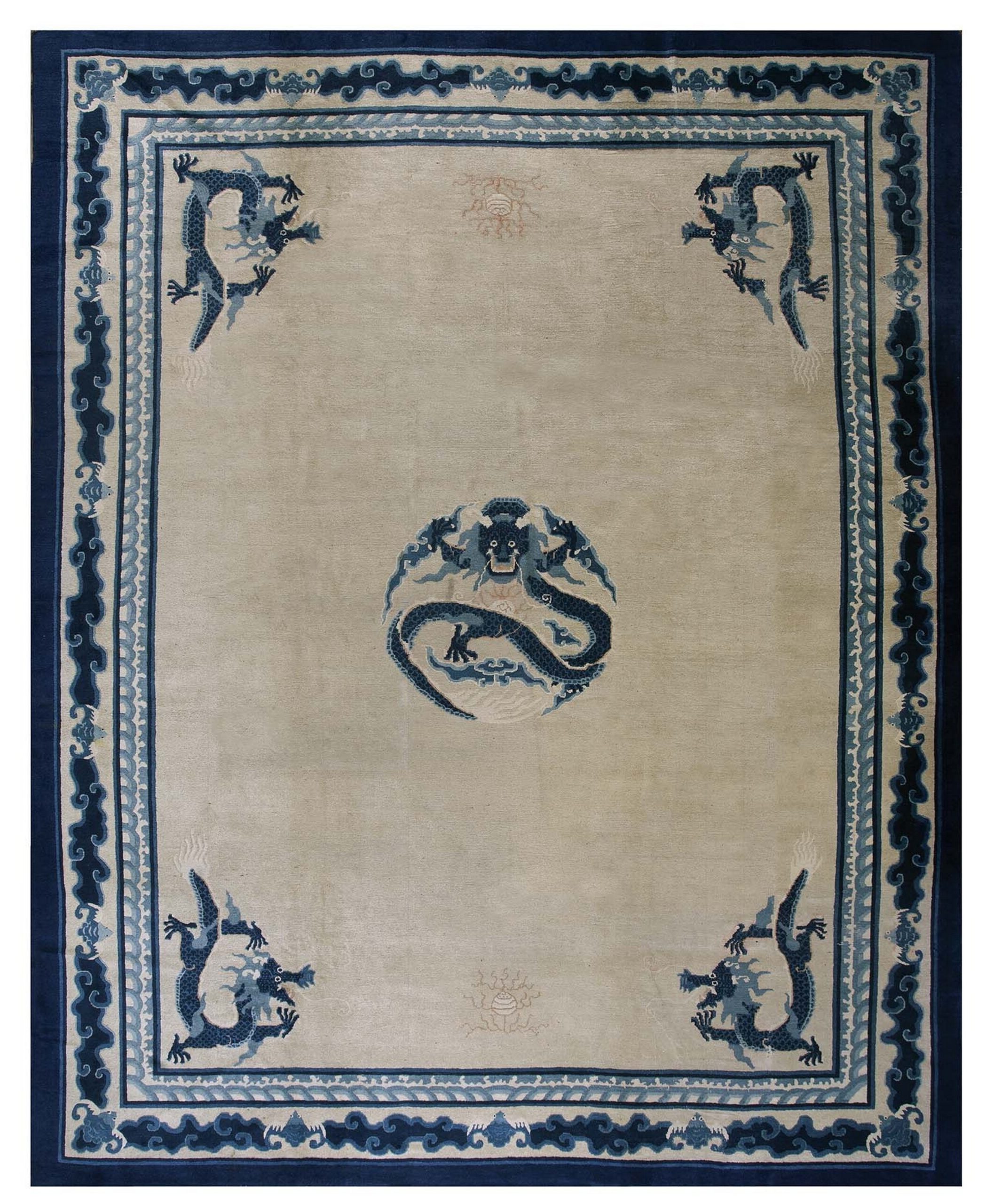 The expansive field is rendered in a soft, luminous beige, typical of high-quality Peking production, providing a perfect neutral backdrop. This subtle ivory color rugs palette allows the dramatic, deep indigo motifs to take prominence without overwhelming the space. Subtle, stylized symbols, perhaps representing the Eight Treasures, are sparsely scattered across the main field, adding textural depth and narrative complexity.
