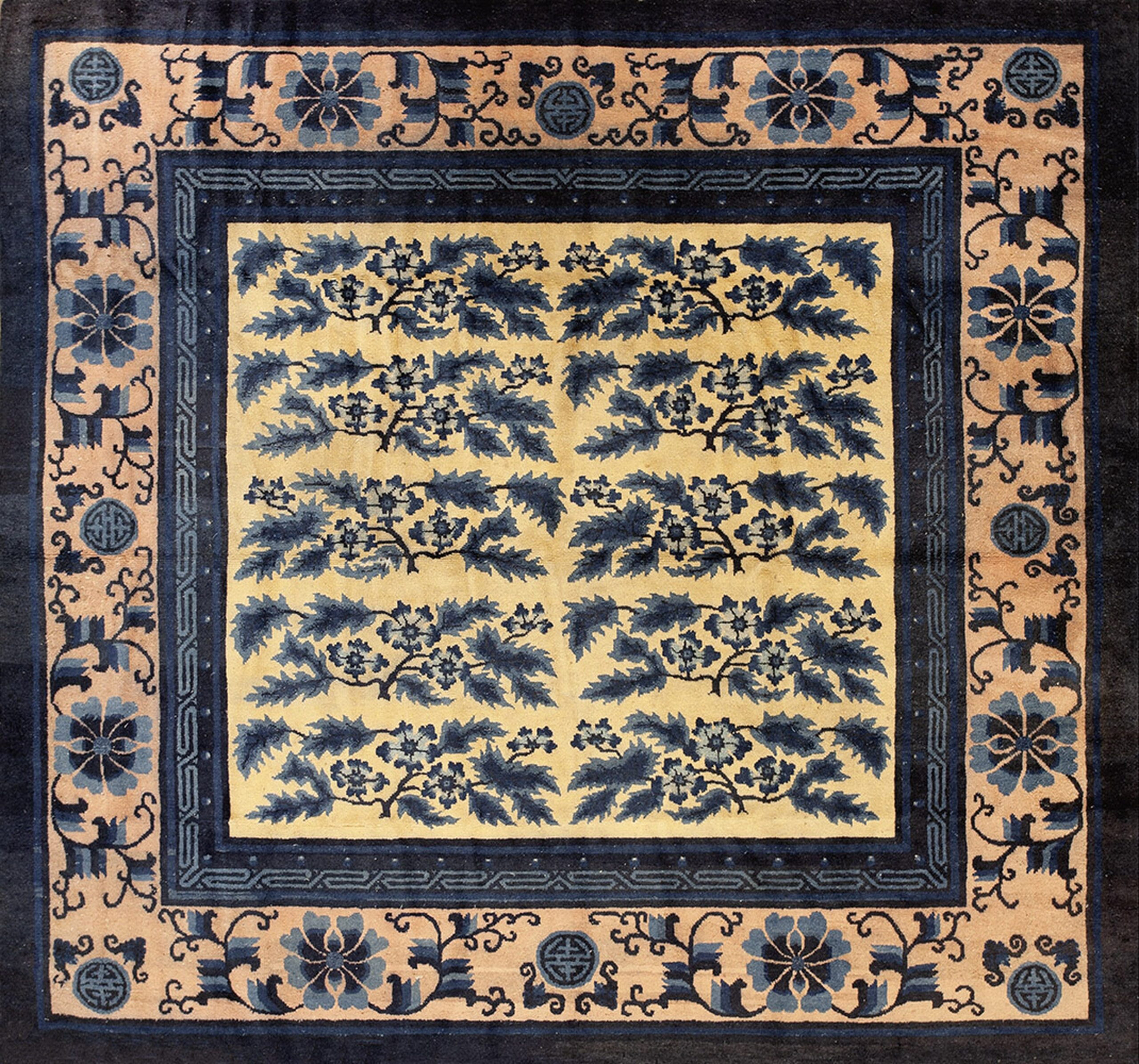Antique Chinese – Mongolian Knotted Rug, Country of Origin: China, Circa Date: 1890s. This exceptional late 19th-century piece exemplifies the refined artistry found in the finest Chinese rugs of the period. Its square format and bold, graphic composition distinguish it among other highly collectible antique rugs.