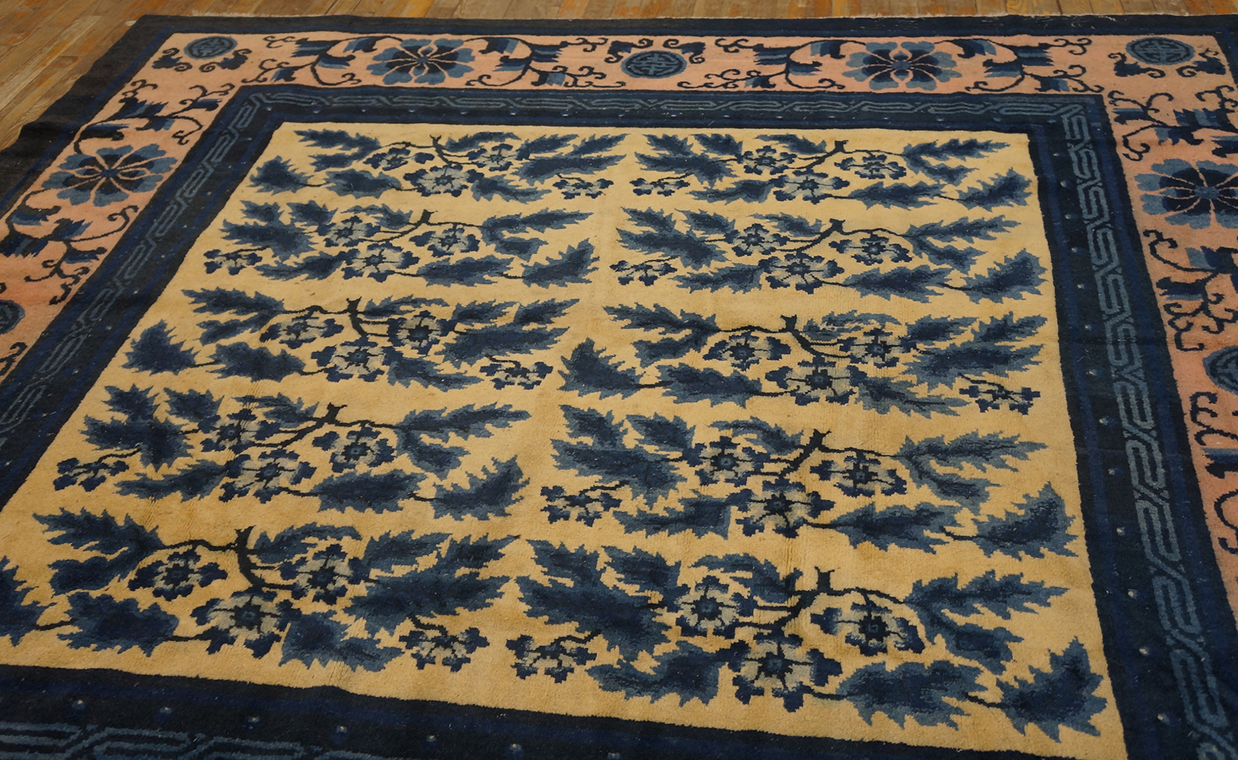 The robust construction and balanced design suggest this piece was intended as a substantial furnishing element. Given its dimensions, it functions perfectly as one of the increasingly sought-after room size rugs from the late Qing Dynasty, offering both historical significance and enduring decorative appeal.