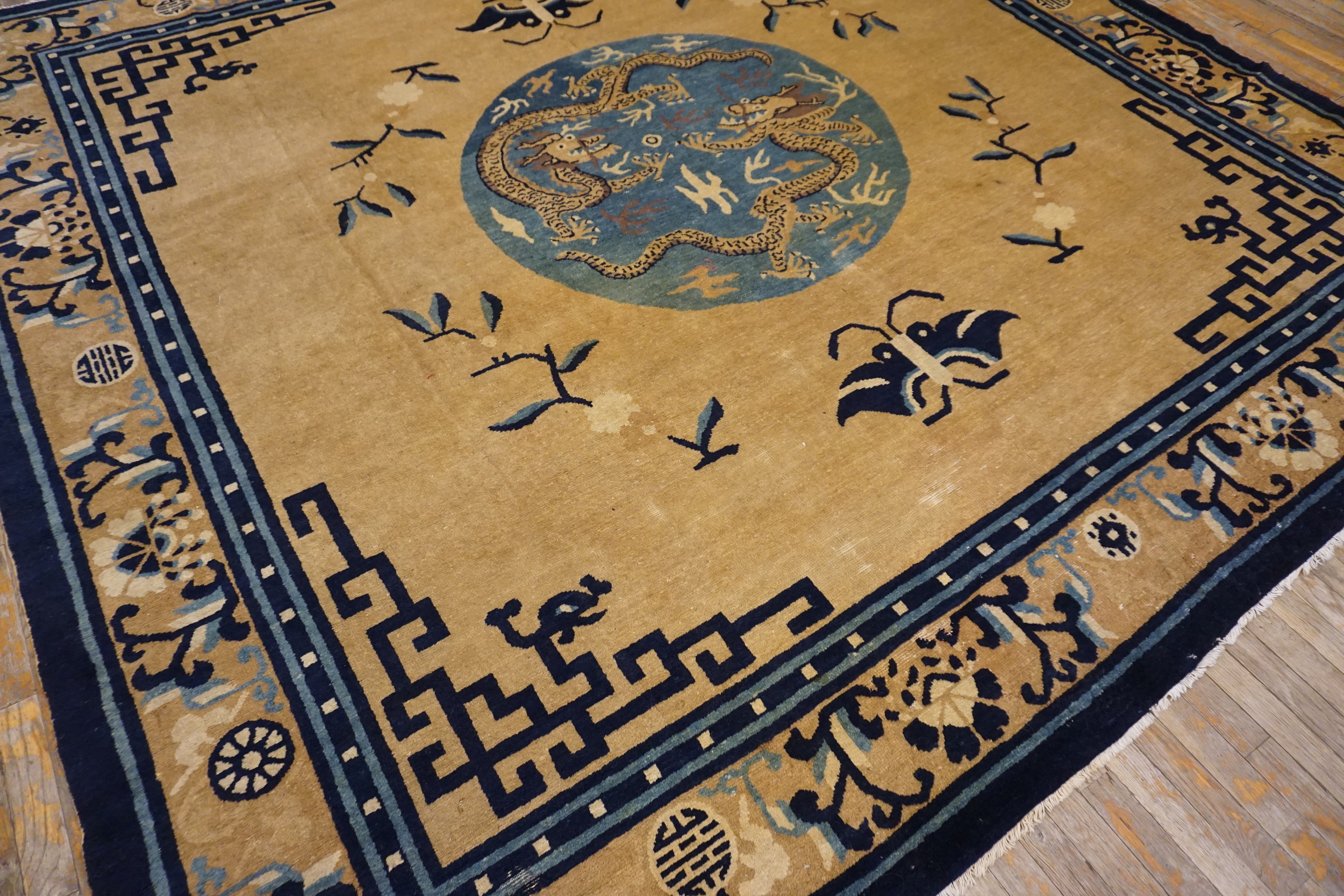 Antique Mongolian Design Chinese Geometric Medallion Hand Knotted Pile Rug, Country of Origin: China, Circa Date: 1890s. This exceptional late 19th-century piece exemplifies the refined artistry of Chinese rugs, blending traditional imperial motifs with the robust structure characteristic of the period. The square format and generous dimensions mark it as a distinguished example of room size rugs intended for a prominent space.