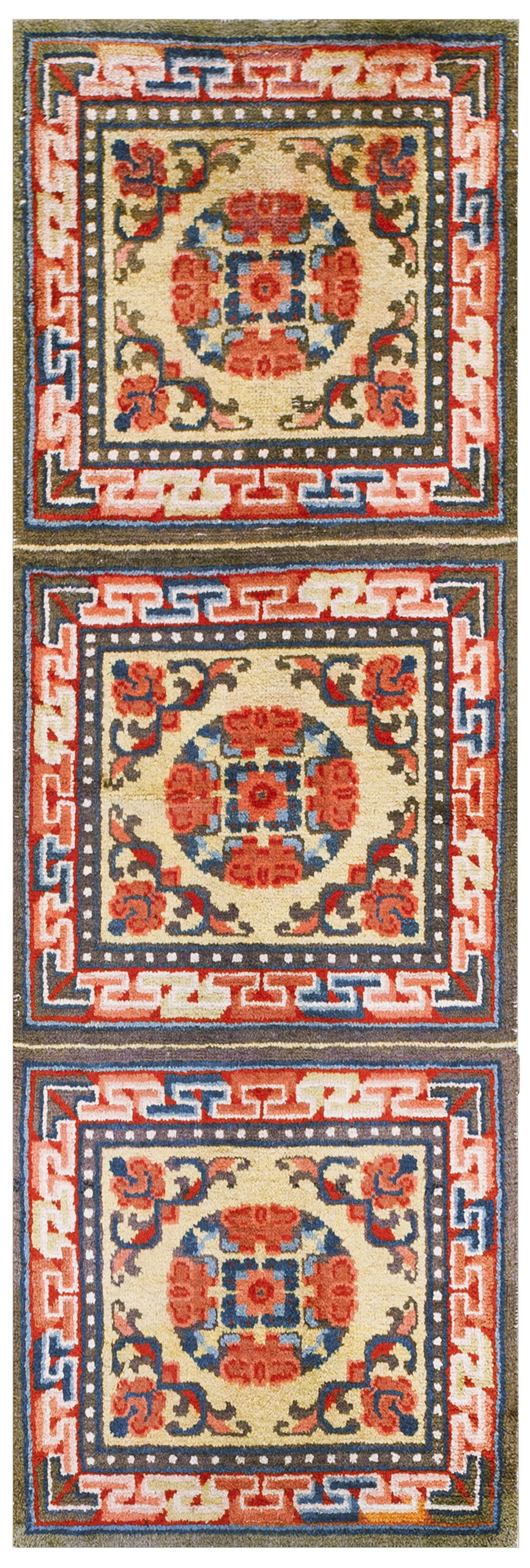 The composition features three distinct, vertically stacked medallions, each anchored by stylized floral forms and surrounded by scrolling vines. While segmented, the continuous repetition of these elements creates a powerful visual flow across the length of the carpet. The dense arrangement of motifs, framed by the classic Greek key or T-fret border, ensures that the eye is engaged across the entire surface, reminiscent of allover designs.