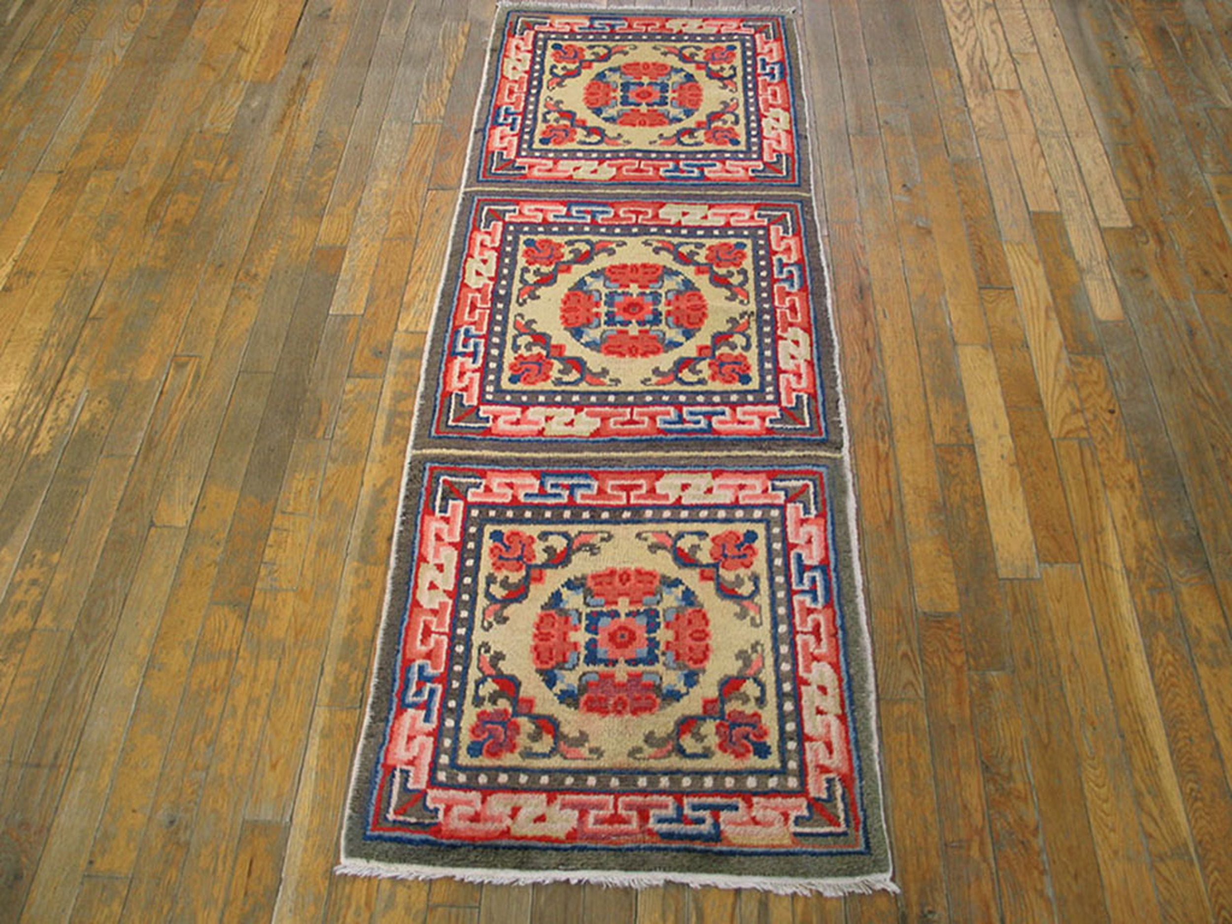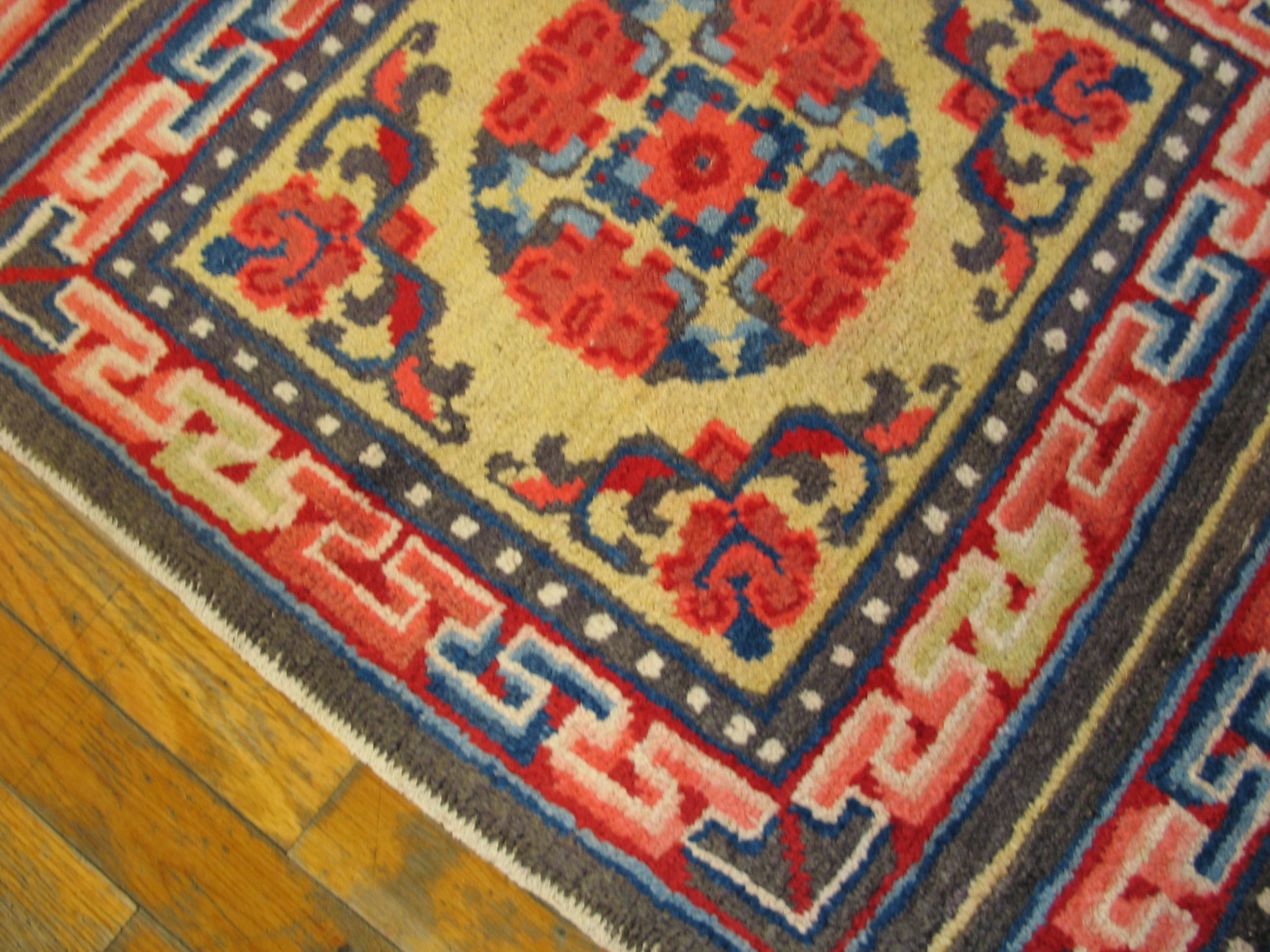 Antique Chinese – Mongolian Small Scatter Size Wool Yellow Rug, Circa Date: 1900s. This exceptional piece from the early 20th century exemplifies the bold, graphic style characteristic of nomadic and northern Chinese weaving traditions. Its highly desirable dimensions classify it perfectly among small scatter size rugs, making it ideal for intimate spaces or as a striking wall hanging.
