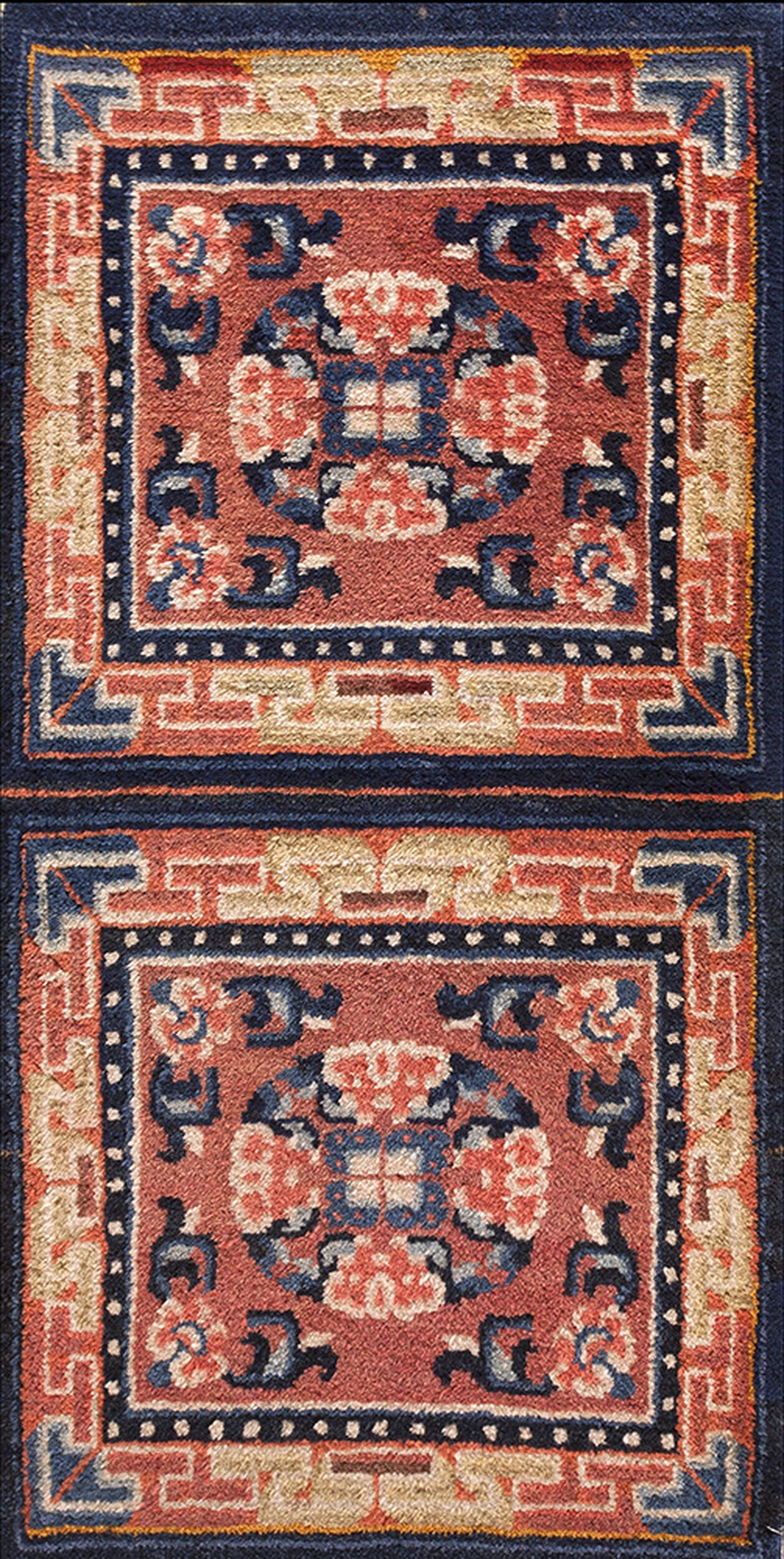 The composition is structured around two distinct, mirrored square medallions, each containing highly abstracted floral elements rendered in shades of cream, blue, and pale orange. The overall design is framed by a secondary border featuring the traditional Chinese meander or T-fret pattern in a striking tan and coral juxtaposition, emphasizing the rug’s architectural symmetry.