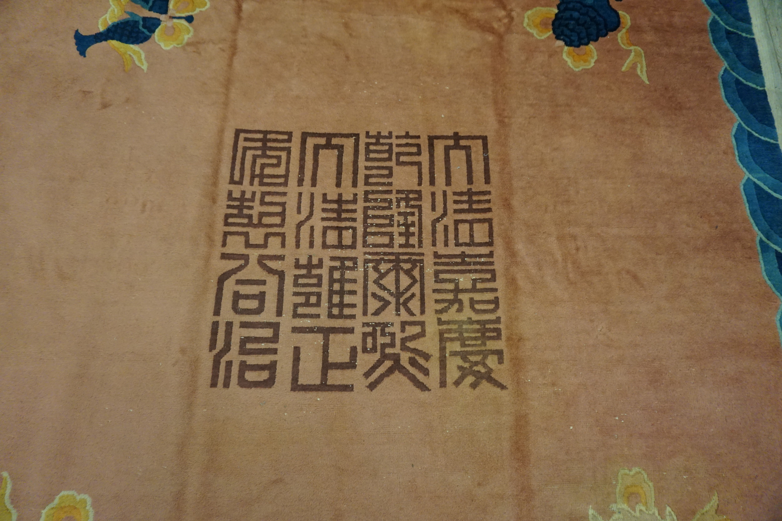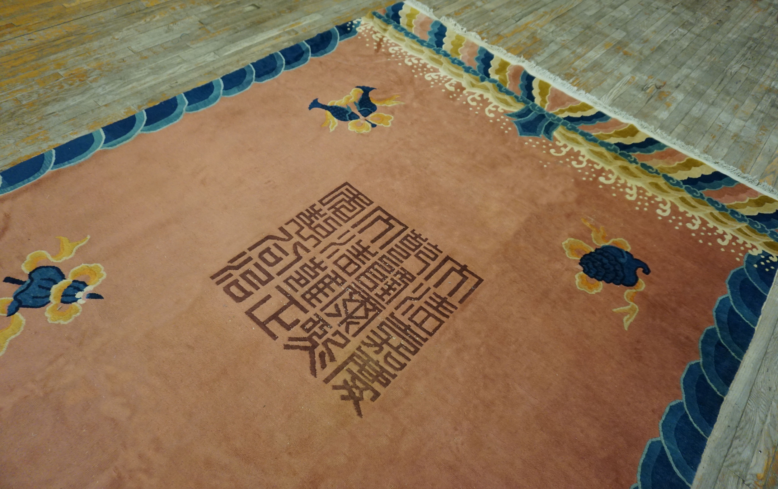 The expansive field is rendered in a luminous, soft tone, characteristic of the period’s preference for subtle yet impactful hues. This distinctive shade of coral pink color provides a striking backdrop for the central, large-scale seal motif, which anchors the composition with historical gravitas and remarkable visual weight.