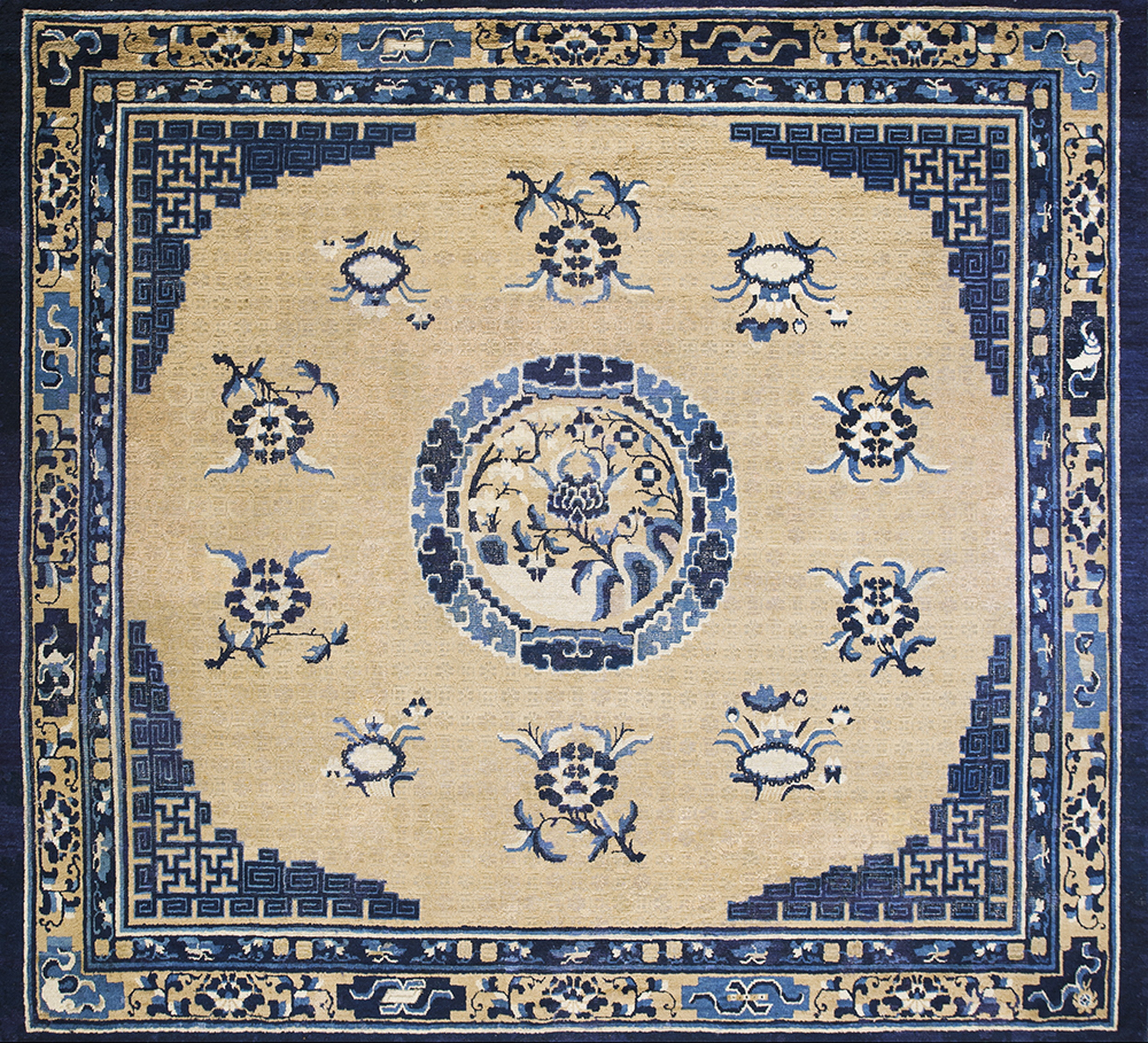 The border structure is intricate, employing a stepped, angular meander pattern—often referred to as a Greek key—which frames the main field. This geometric precision contrasts beautifully with the organic forms within the center. Pieces from this region are highly sought after by collectors of Chinese rugs due to their purity of design and exceptional wool quality.