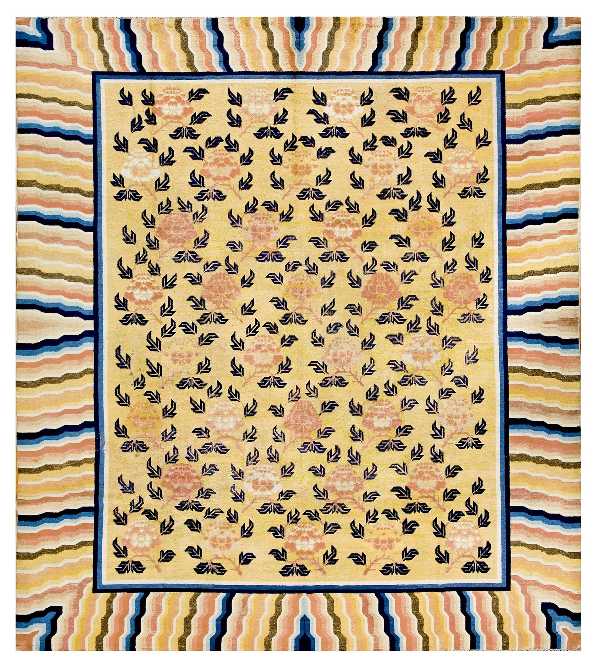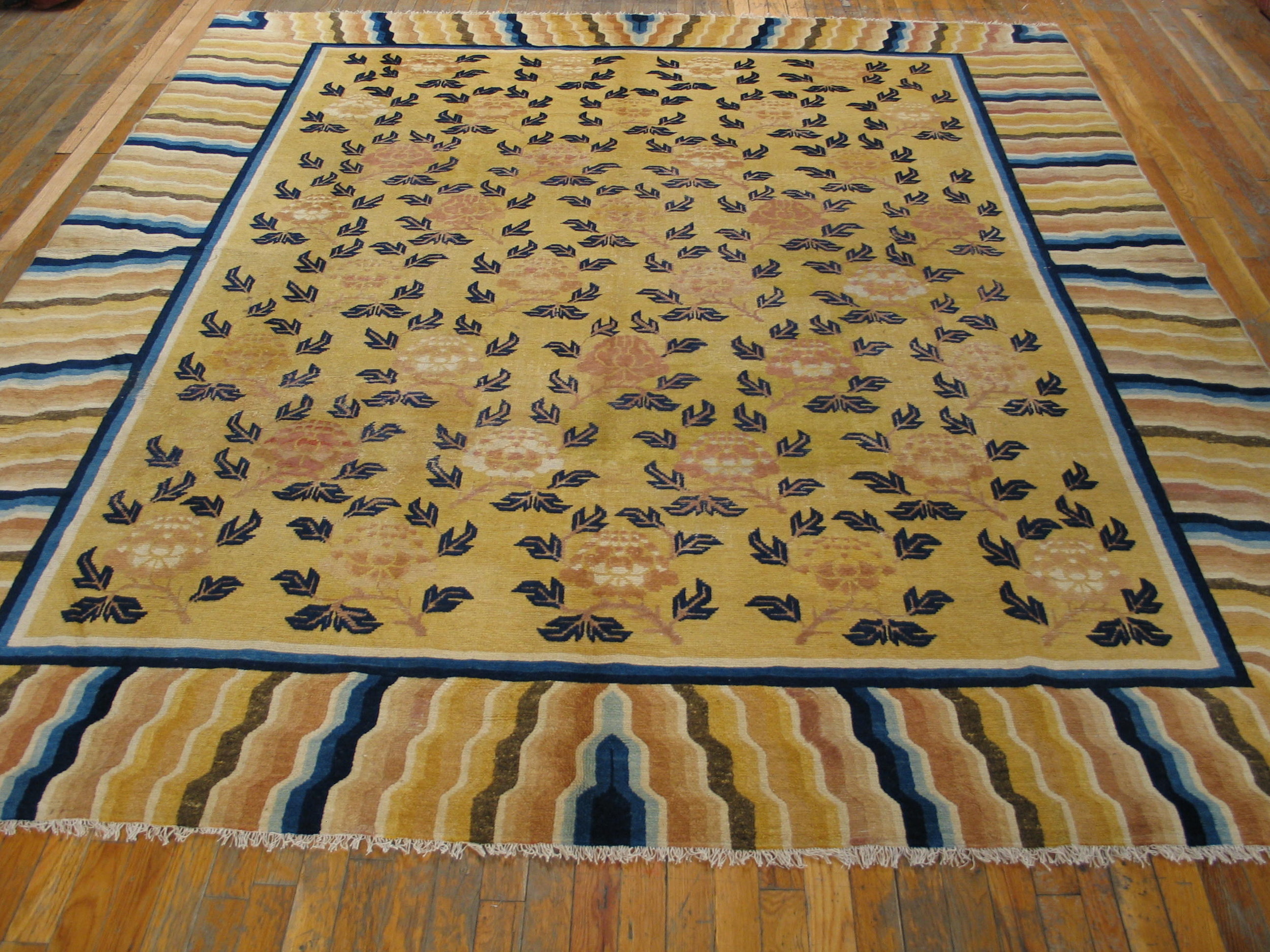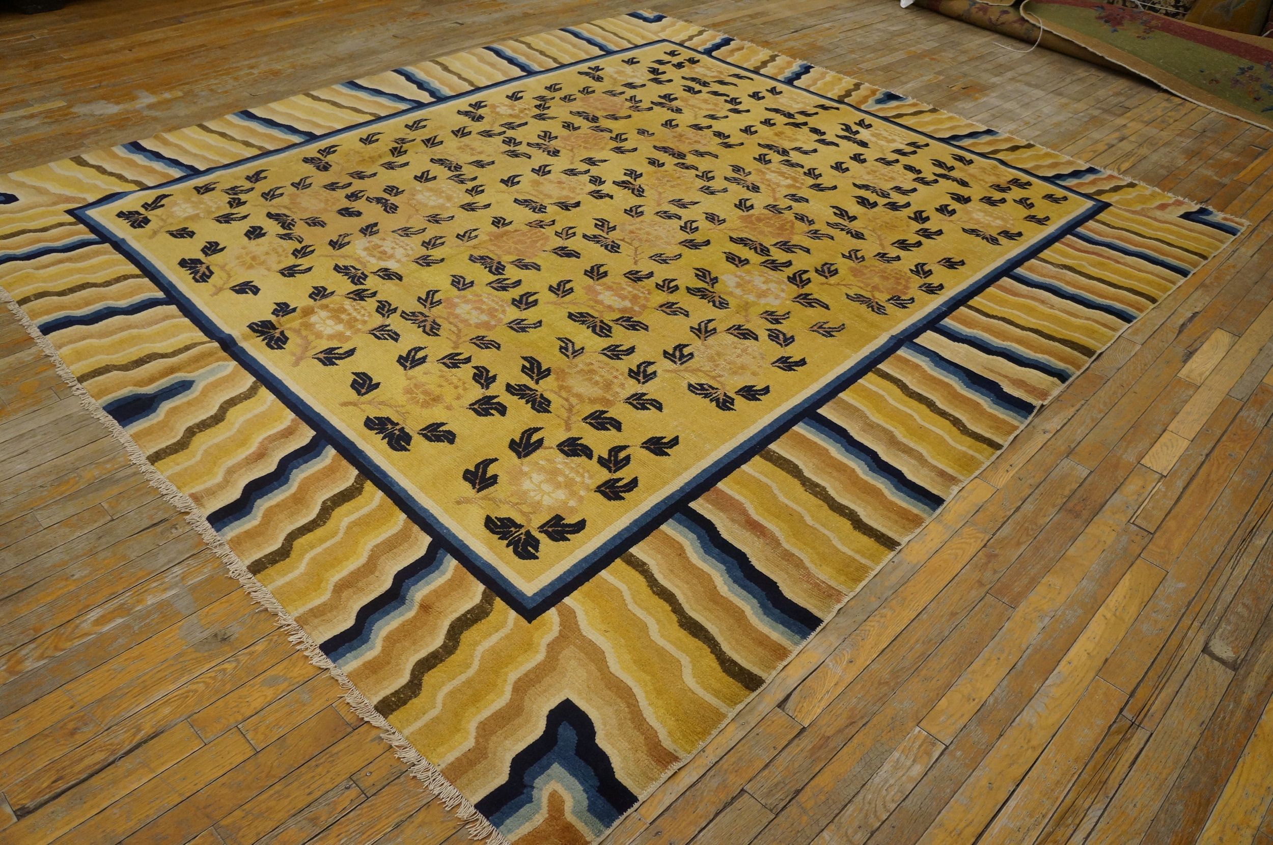 The substantial dimensions of this piece confirm its original intent as one of the grand room size rugs, designed to anchor a formal interior space. Its enduring quality and unique aesthetic make it a remarkable collector’s item, offering both historical depth and sophisticated decorative appeal.
