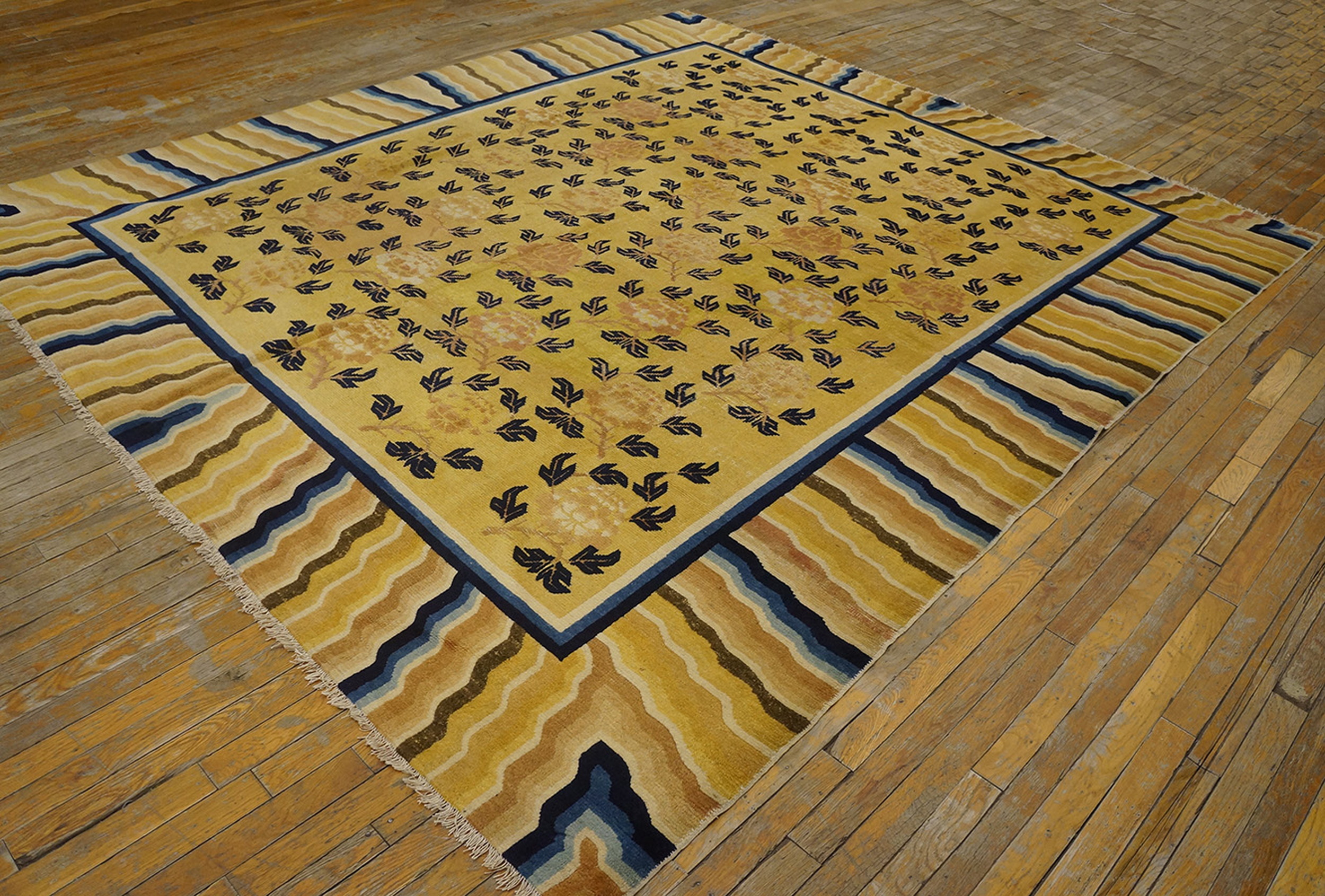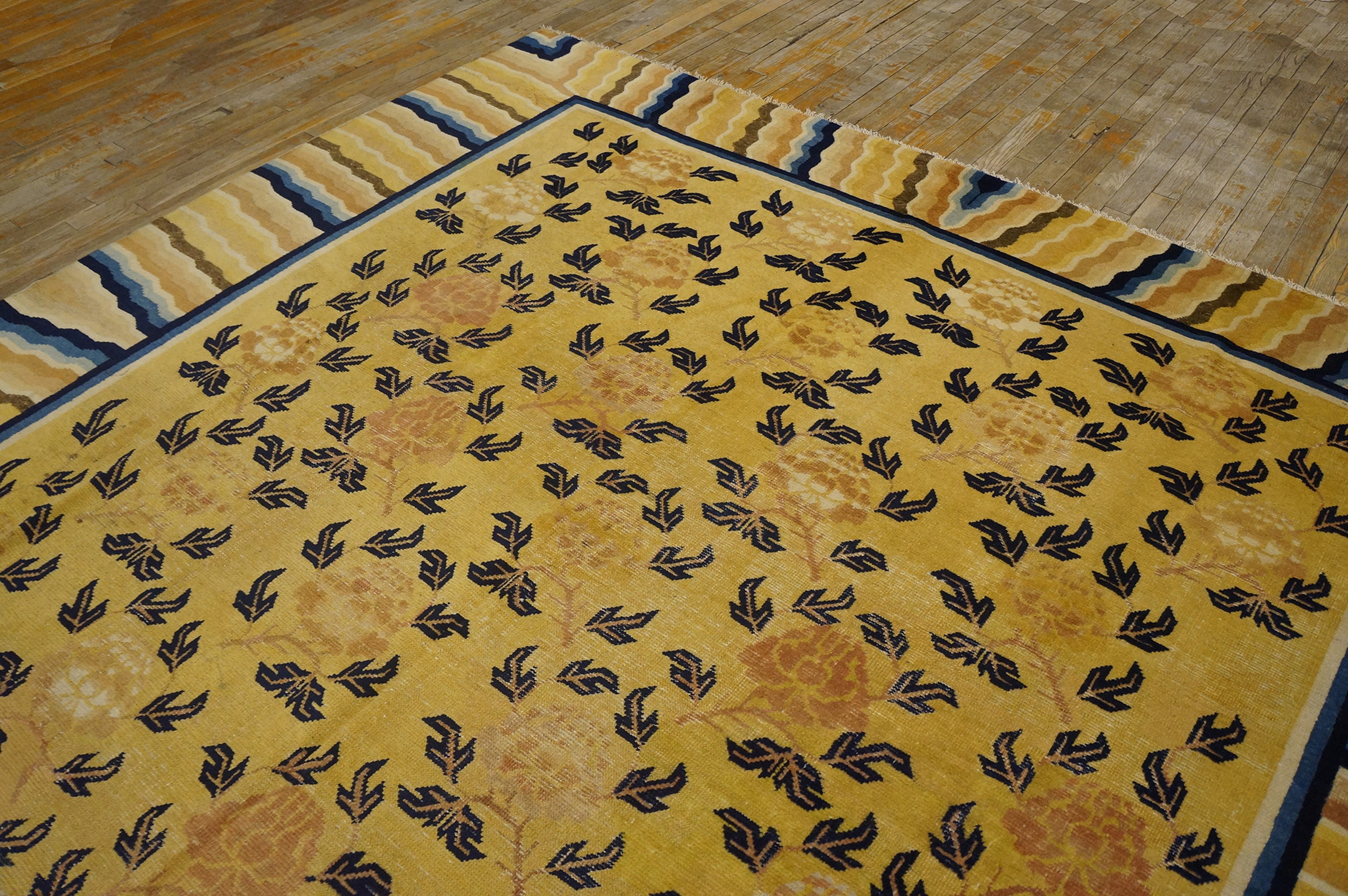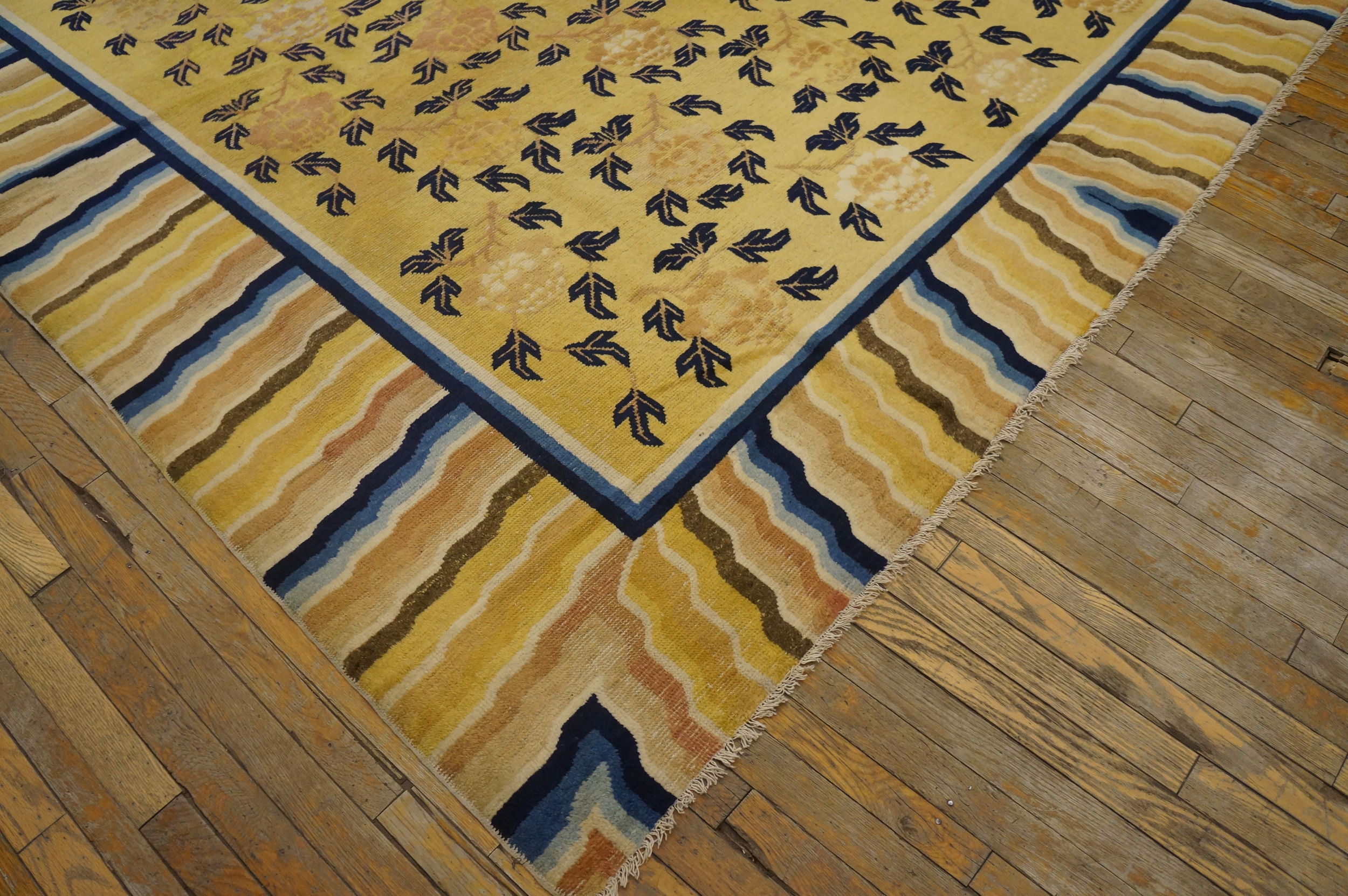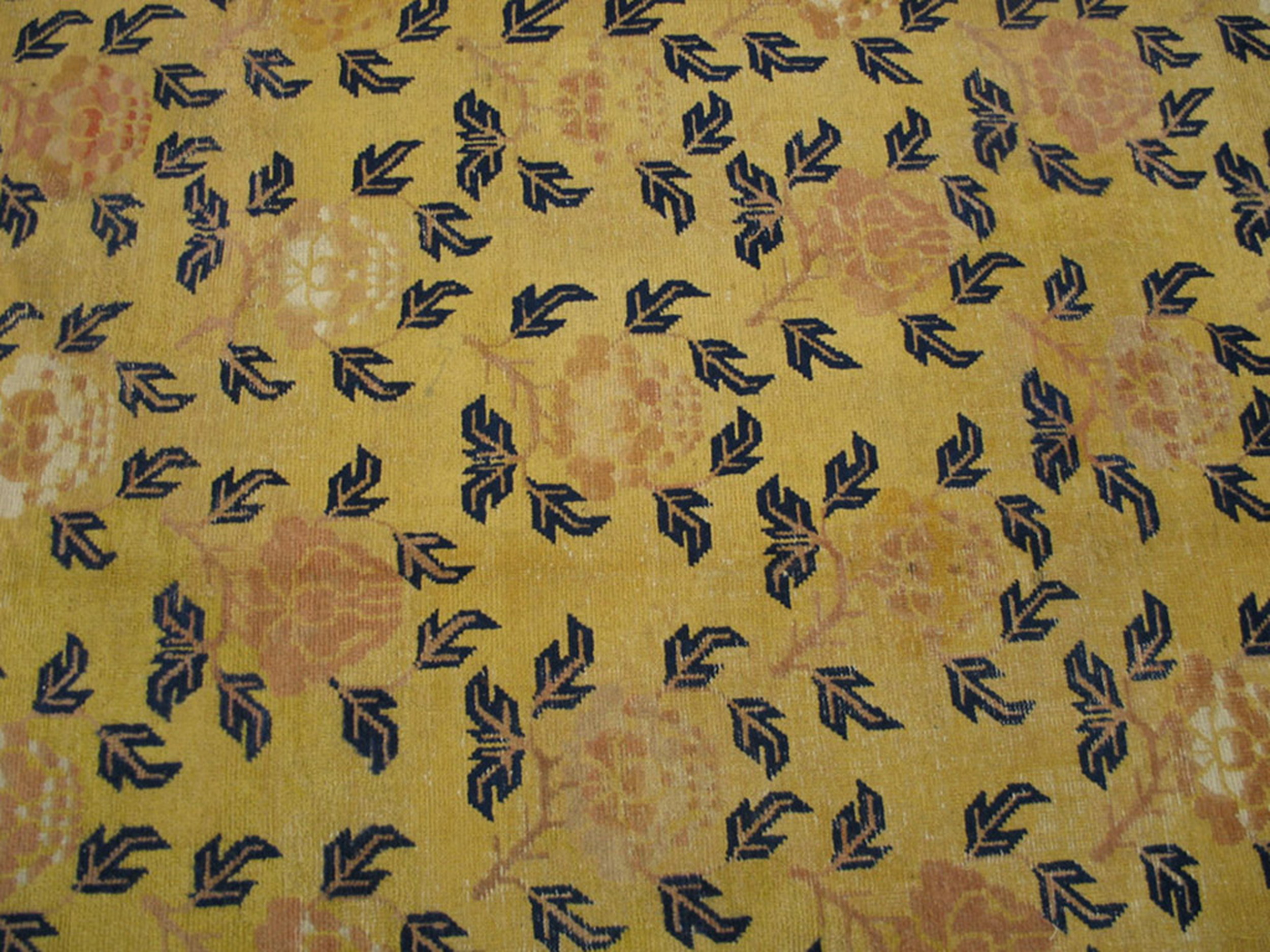 The substantial dimensions of this piece confirm its original intent as one of the grand room size rugs, designed to anchor a formal interior space. Its enduring quality and unique aesthetic make it a remarkable collector’s item, offering both historical depth and sophisticated decorative appeal.