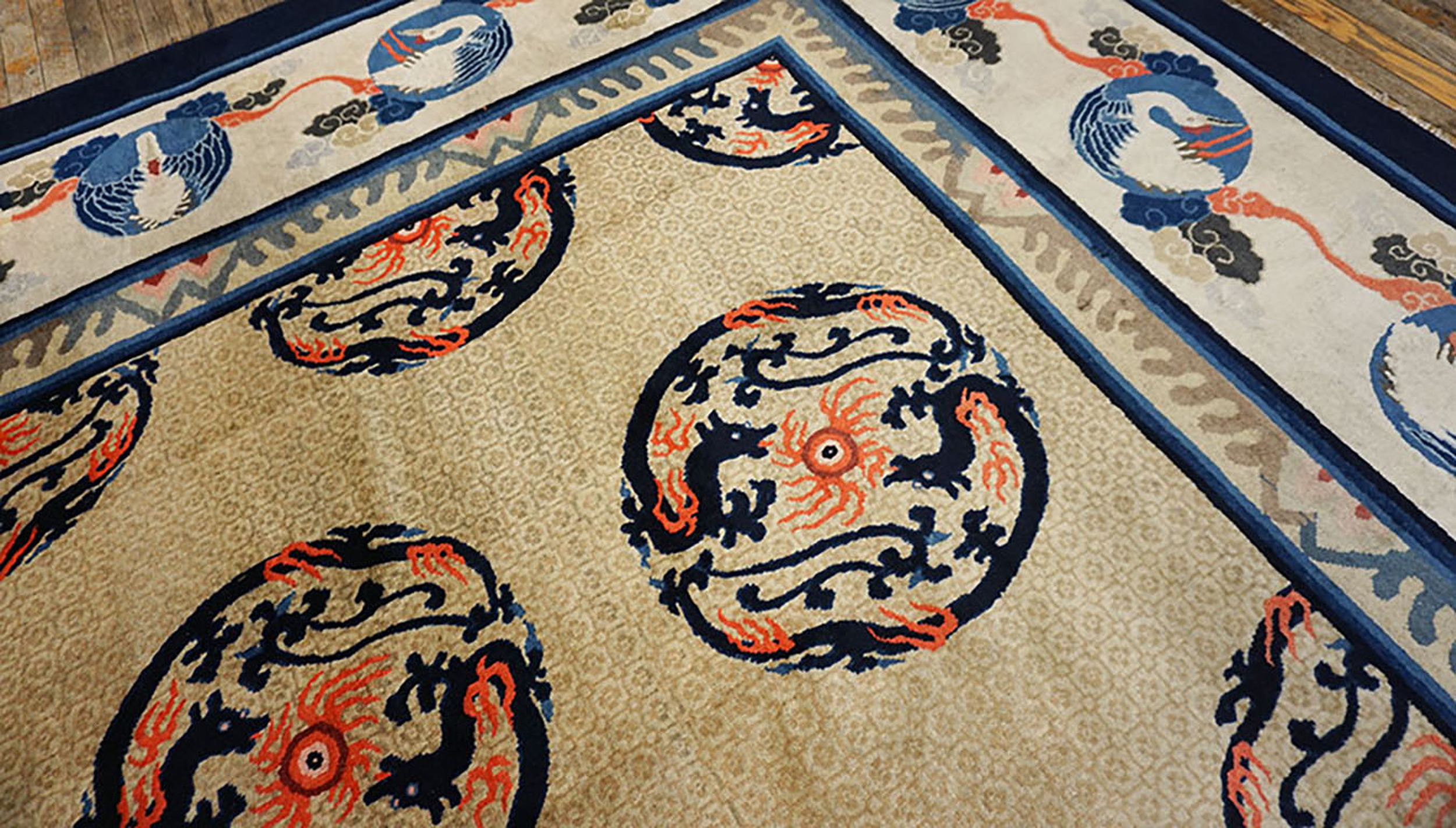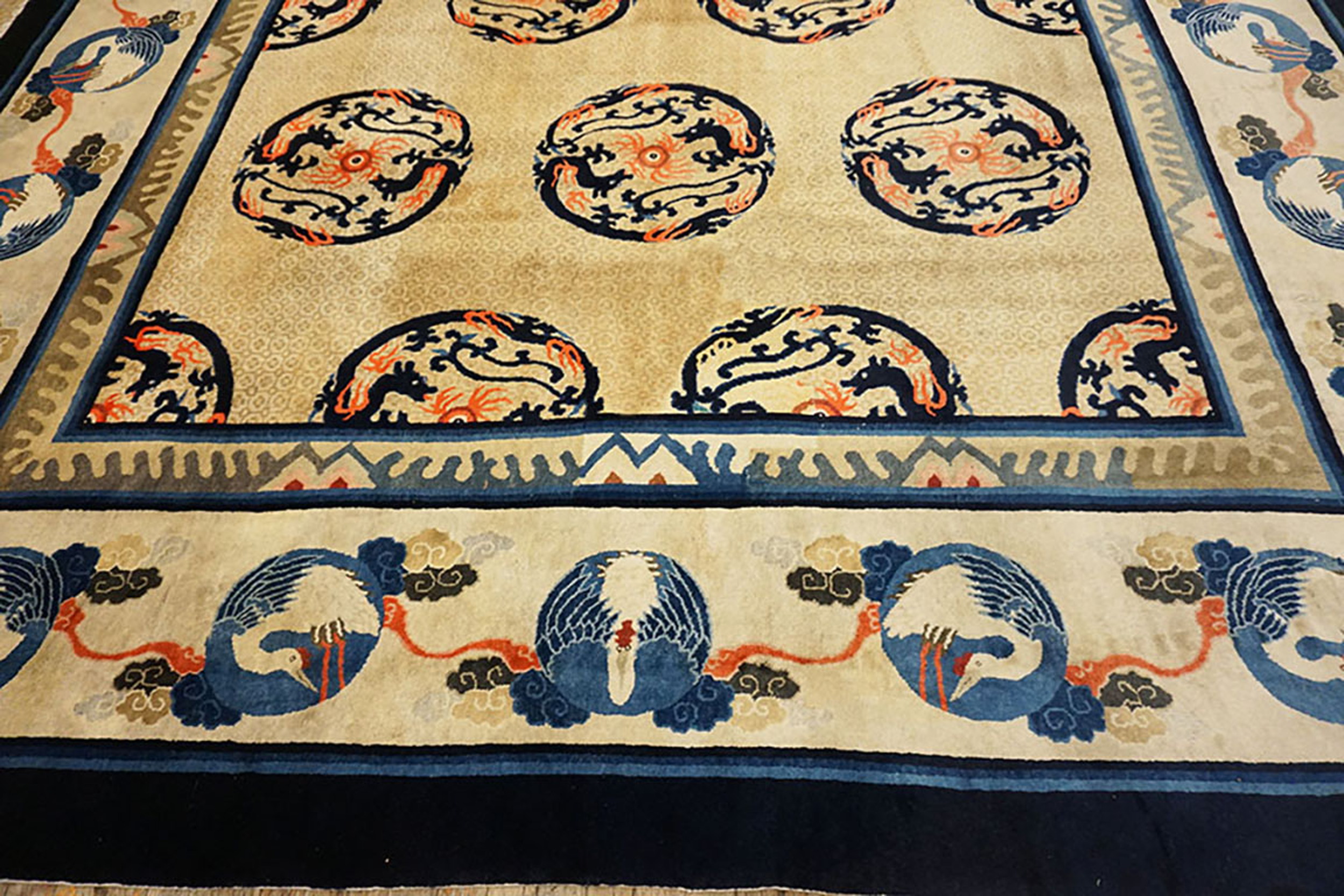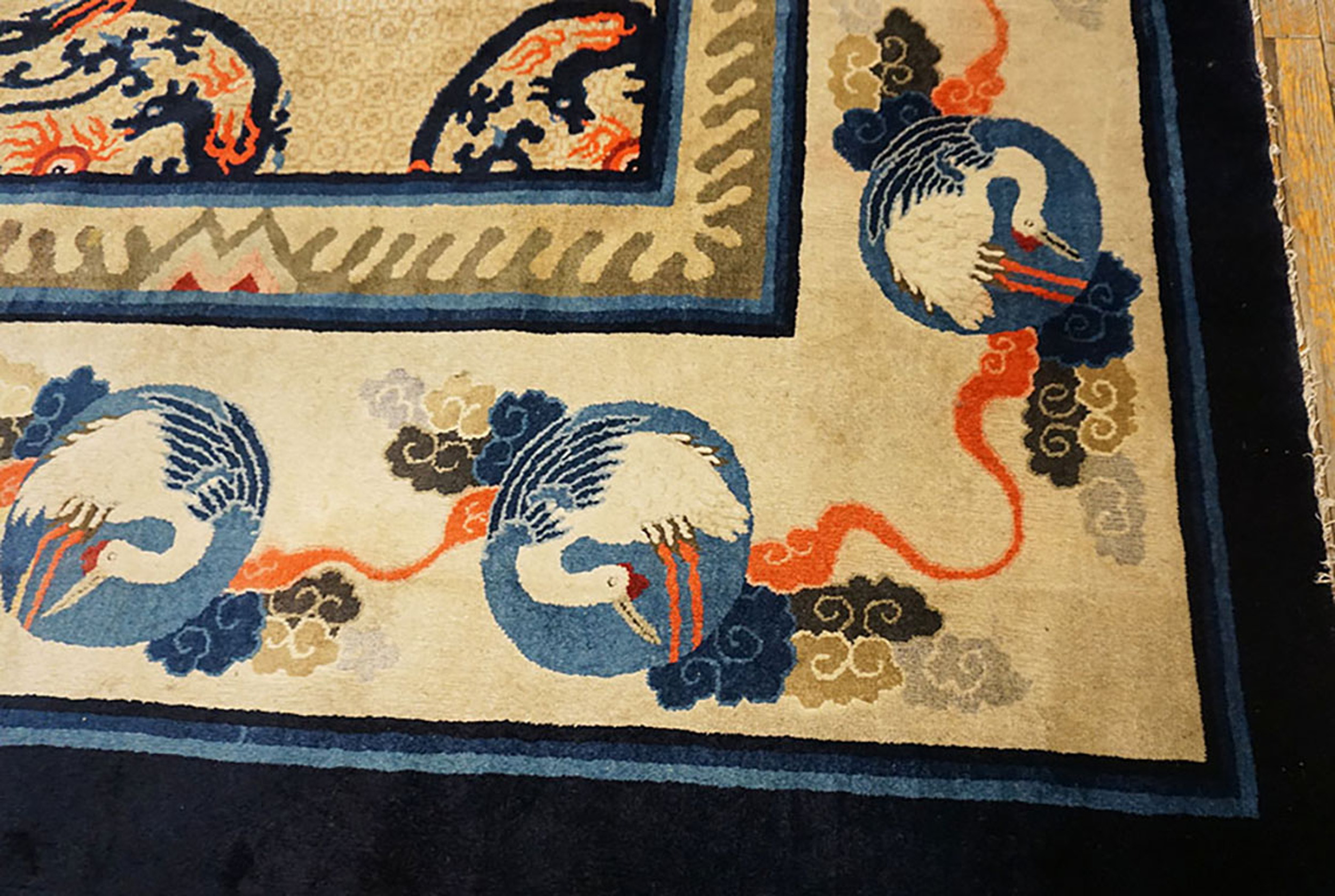 Framing the central field is a magnificent border featuring elegant, stylized cranes interspersed with traditional cloud motifs, rendered in soft blues and coral accents. The substantial dimensions of this piece make it ideal for anchoring large, formal spaces, classifying it as a superb example of room size rugs designed for architectural impact.