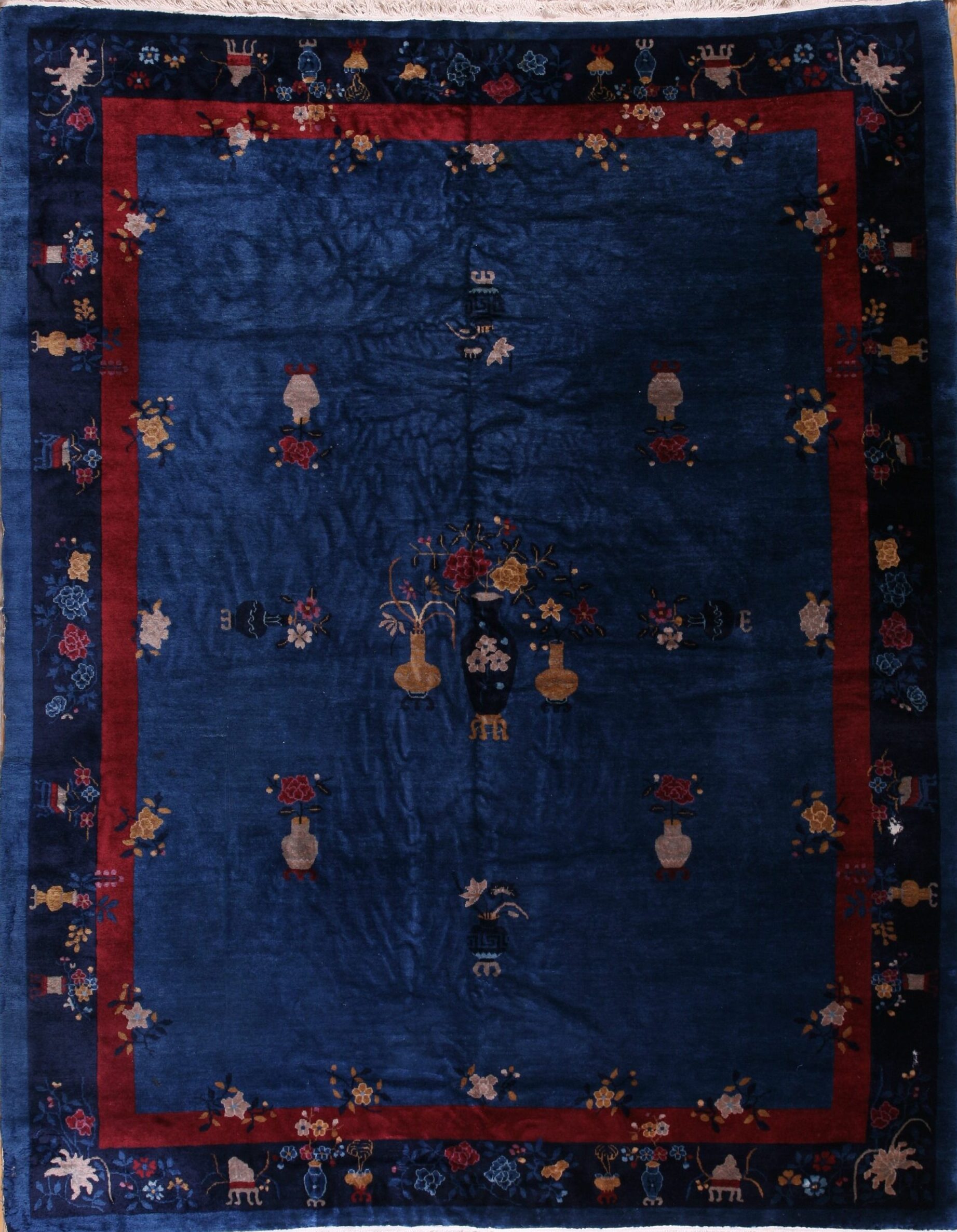 A striking visual contrast is established by the primary border, defined by a broad band of rich, oxidized red—a perfect complement to the primary indigo. The outer guard border features a complex array of stylized symbols and smaller floral sprays, framing the central tableau with meticulous detail and depth, typical of the fine weaving centers near Beijing.