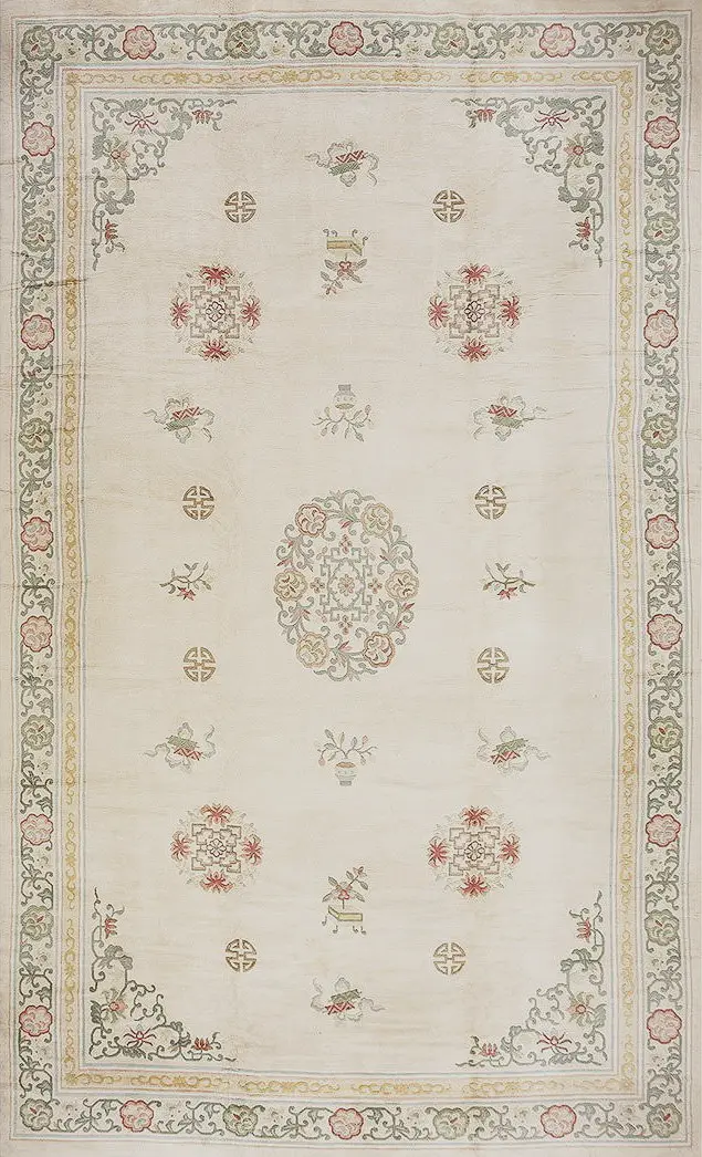 The expansive field is rendered in a luminous, soft cream tone, providing a perfect canvas for the delicate pastel accents. This desirable ivory color palette ensures versatility, allowing the rug to harmonize seamlessly with both traditional and contemporary furnishings. Scattered across the field are stylized medallions and traditional Chinese symbols, including the auspicious Shou character, rendered in soft sage green and pale coral.