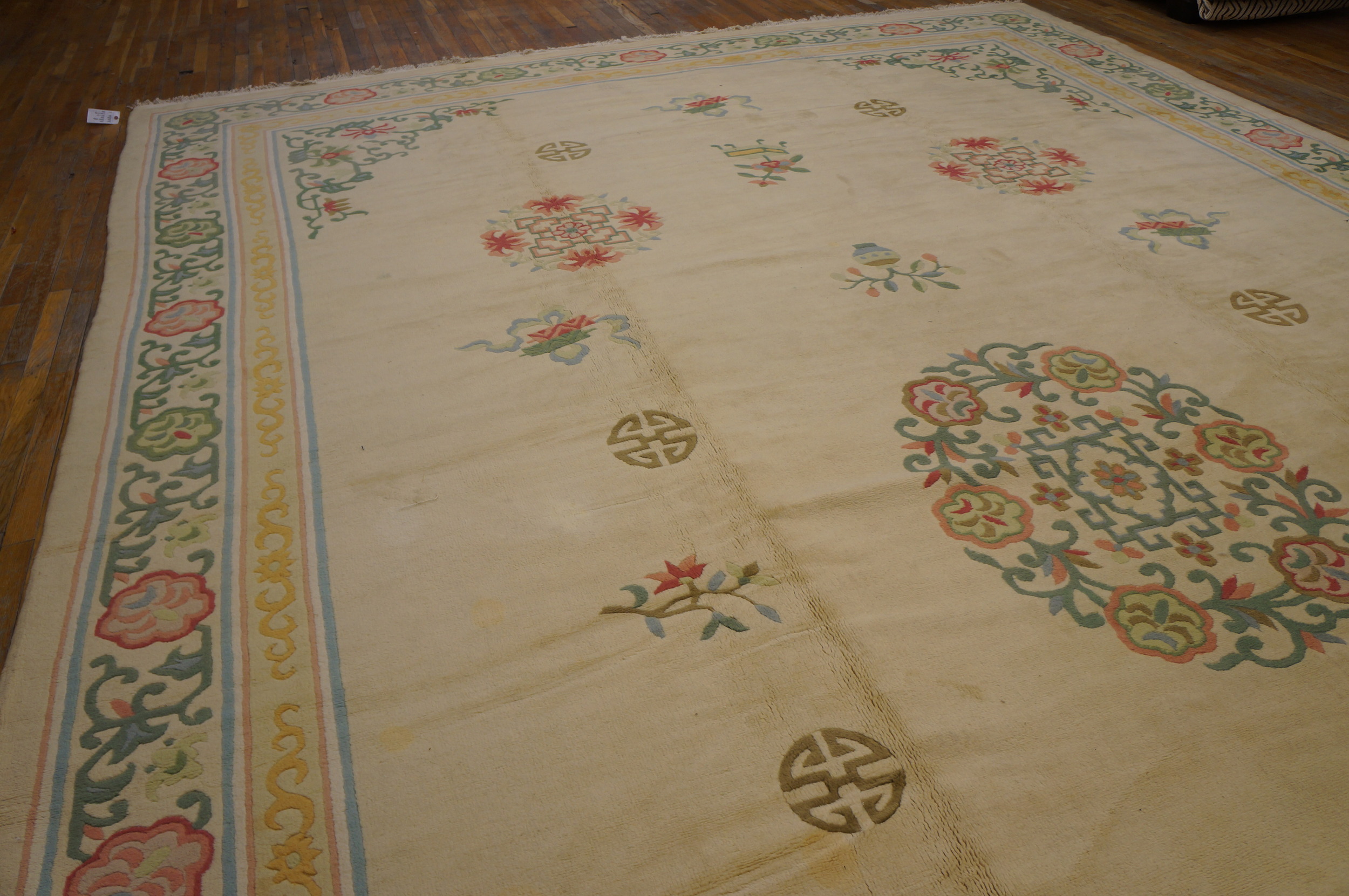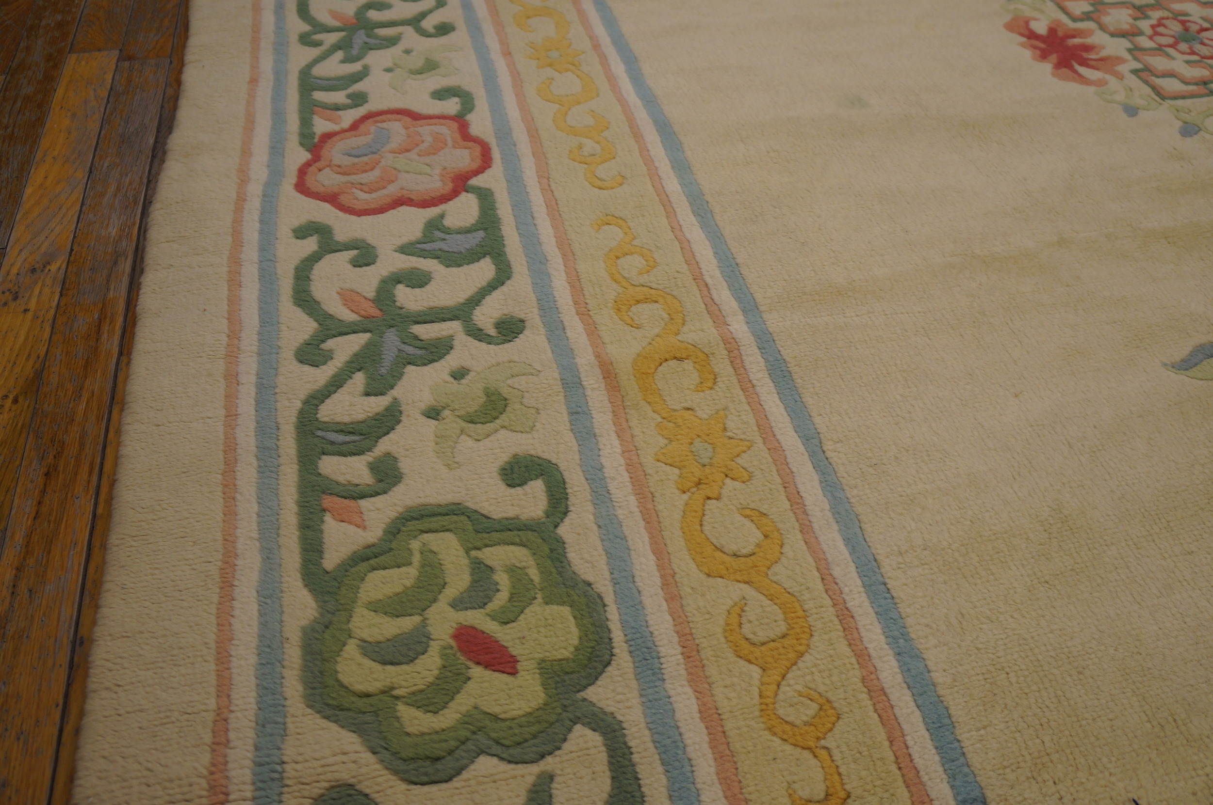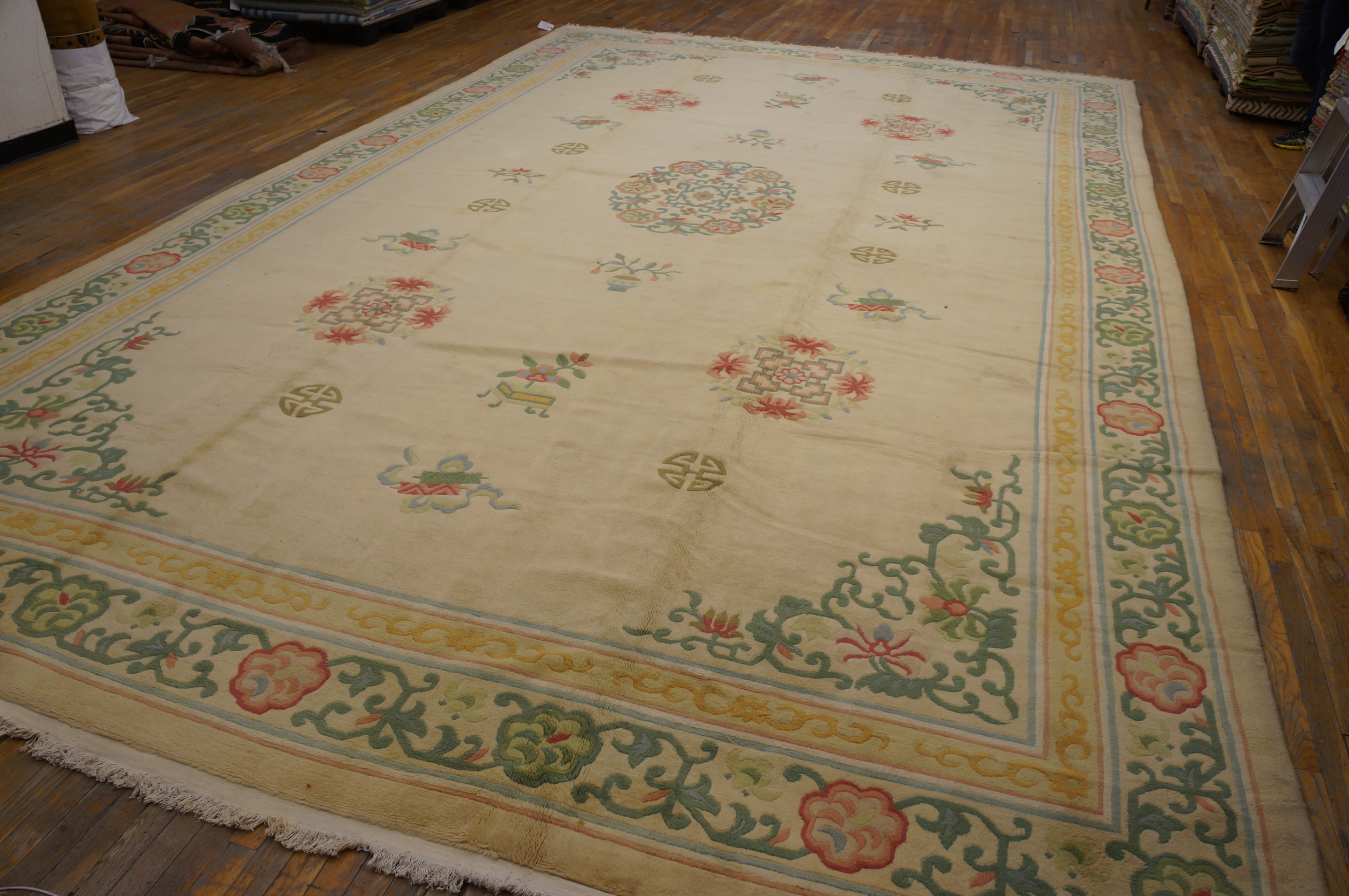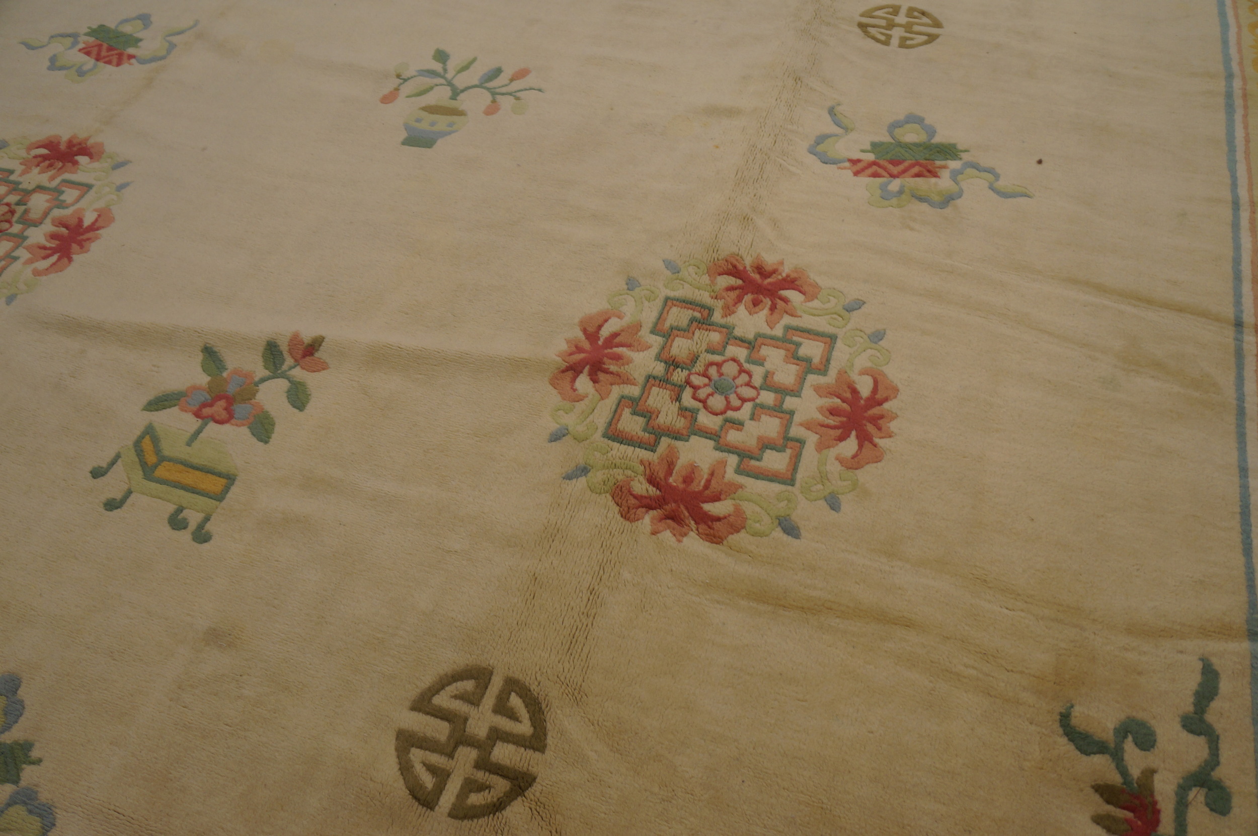 The artistry of the piece is most evident in its complex border system, which frames the central field with layers of scrolling vines and elegant blossoms. The use of soft sage greens, pale blues, and coral pinks highlights the refined craftsmanship. This focus on stylized nature motifs places the piece firmly within the tradition of floral rugs that characterized the finest export quality Chinese textiles of the era.