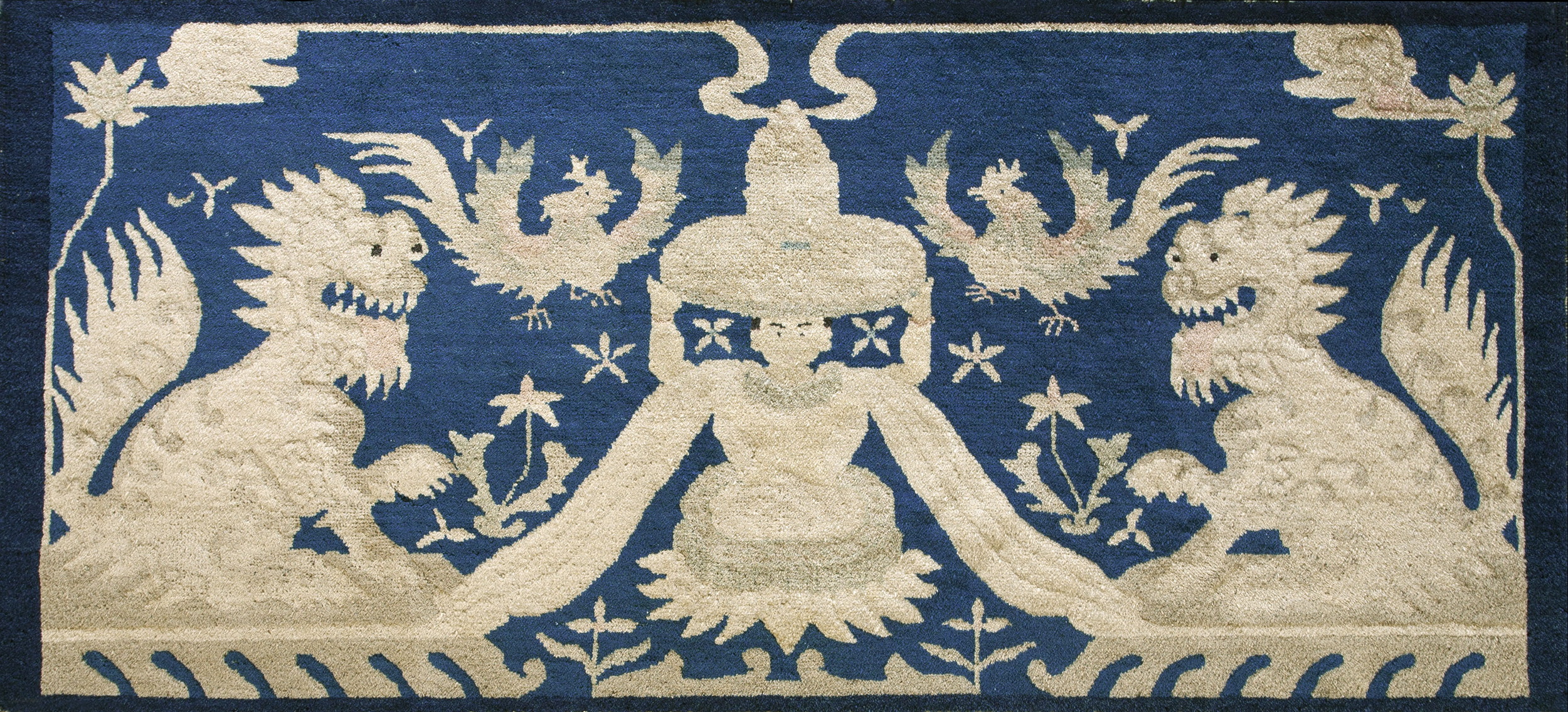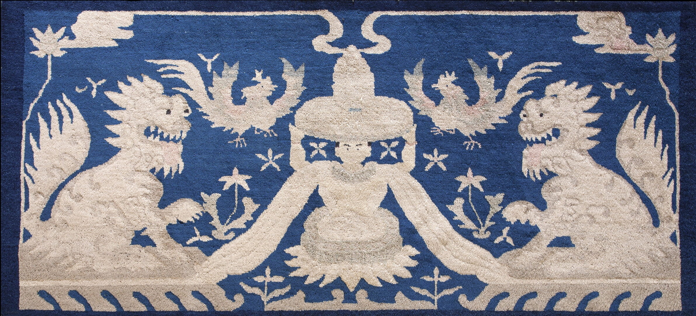 The composition is defined by the powerful contrast between the luminous ivory figures and the deep, saturated indigo field. This rich, highly desirable shade of blue provides a dramatic canvas for the mythological scene, placing it among the most compelling blue color rugs of the period.