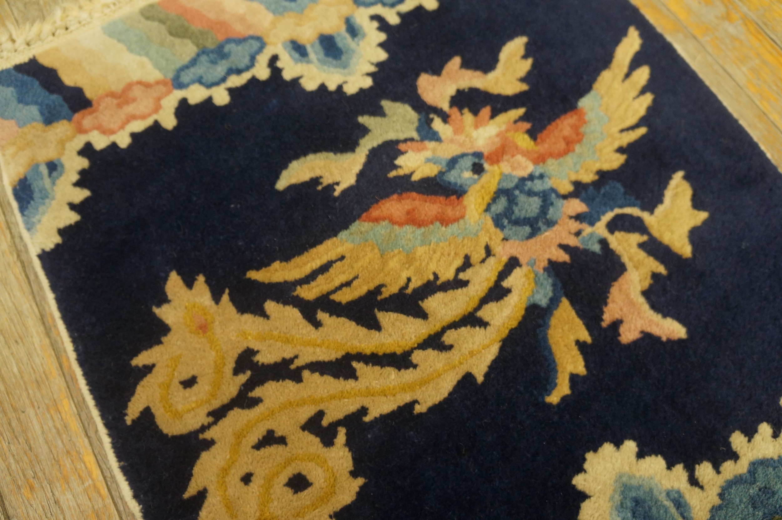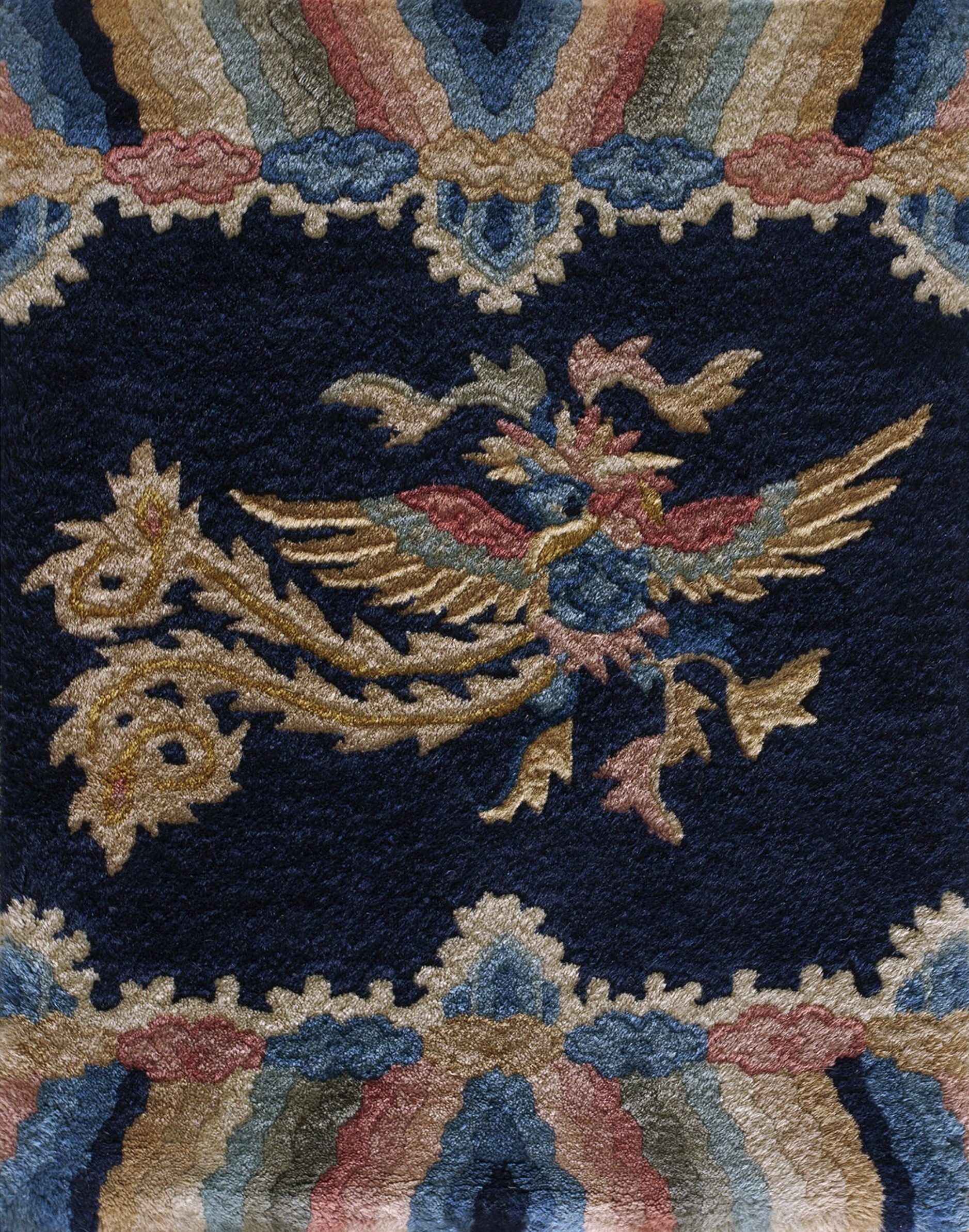 Characteristic of the Peking style from this era, the design employs highly stylized mythical creatures—likely a phoenix or dragon—interspersed with formalized cloud bands and scrolling foliage. The dense, plush pile enhances the three-dimensional quality of these traditional Chinese symbols, rendered with exceptional precision.