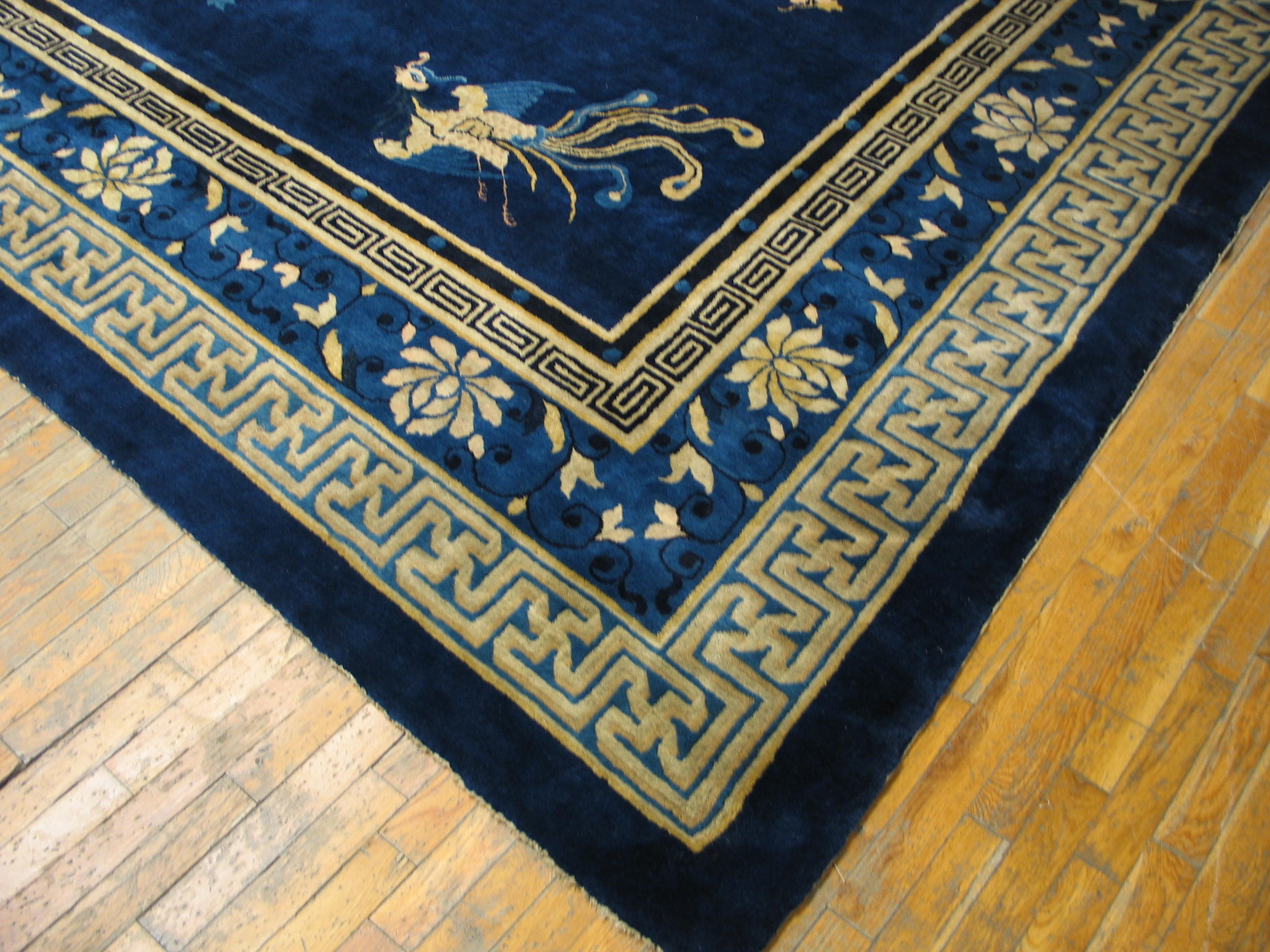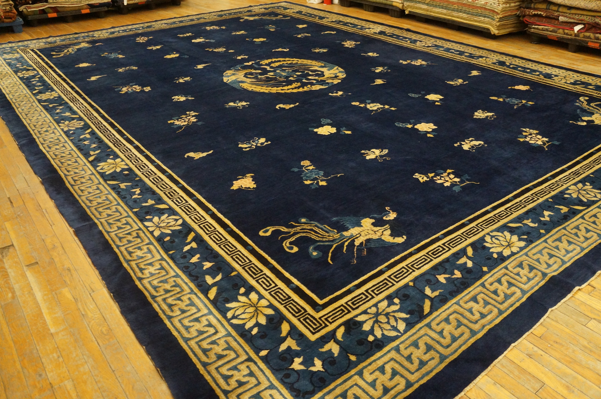 Antique Chinese – Peking Chinese Blue 1880s Blue Rug, Circa Date: 1880s. This magnificent example of late Qing Dynasty weaving represents the pinnacle of Chinese court textiles. Its provenance places it among the finest antique rugs produced during this period of artistic transition, characterized by a refined balance between imperial symbolism and open, expansive design fields.