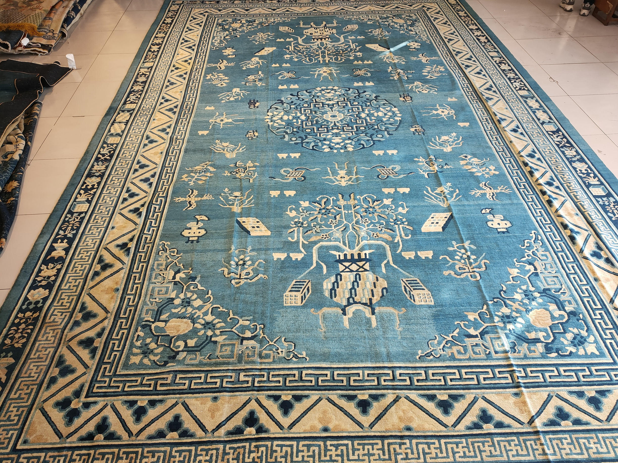 Characterized by an expansive, open field, the composition features a central, multi-layered medallion surrounded by scattered auspicious symbols, including stylized bats (symbolizing good fortune) and vases. Given its imposing scale, this piece functions as a monumental large oversized big rug, suitable for grand residential or institutional settings that require a commanding floor presence.