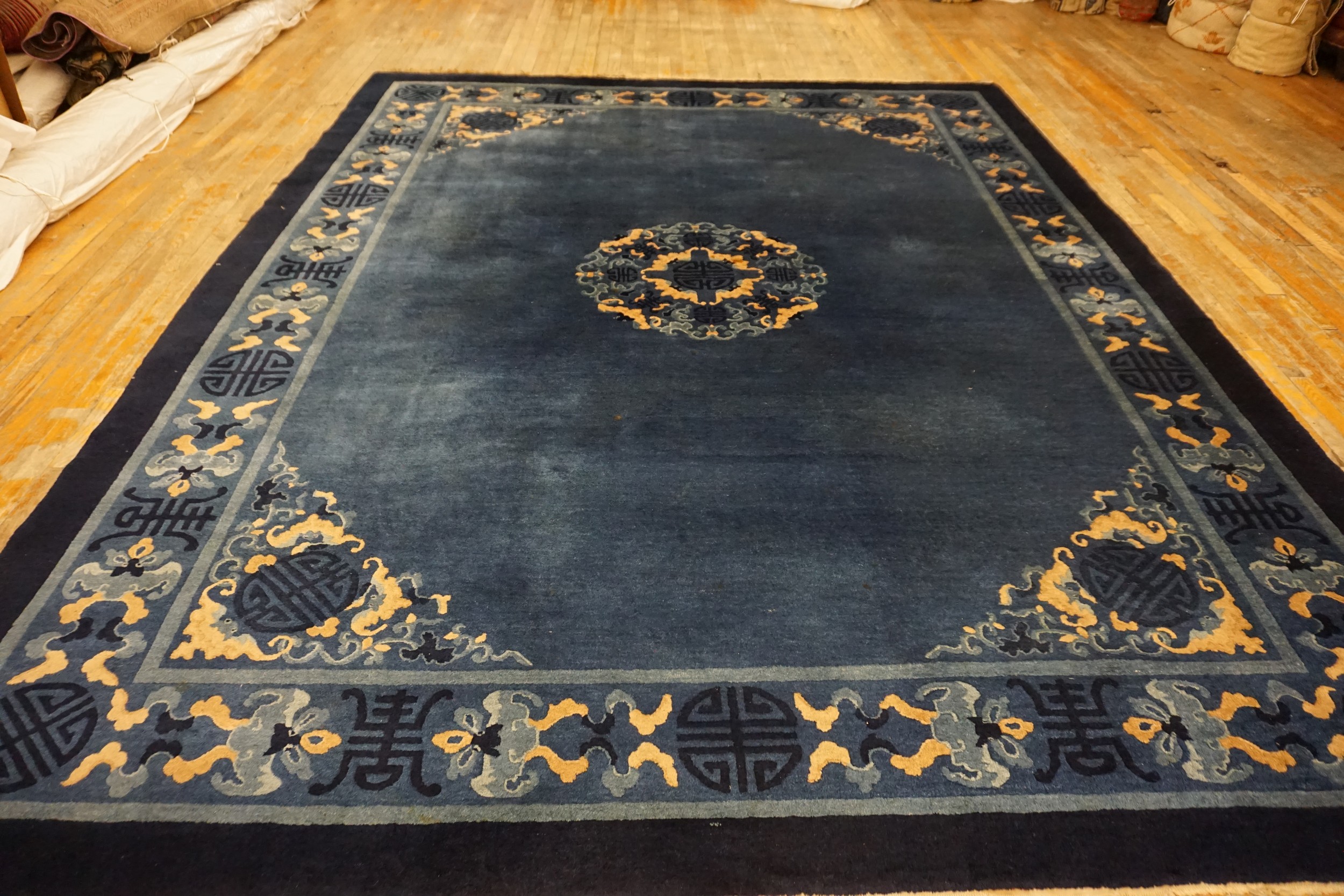 Antique Chinese – Peking Chinese Floral, Medallion Blue 1900s Blue Rug, Circa Date: 1900s. This exceptional example of early 20th-century Chinese weaving showcases the restrained elegance characteristic of the Peking style. The field is dominated by a rich, deeply saturated indigo, making it a striking piece among blue color rugs. The use of a monochrome ground allows the intricate border and central medallion to emerge with subtle definition.