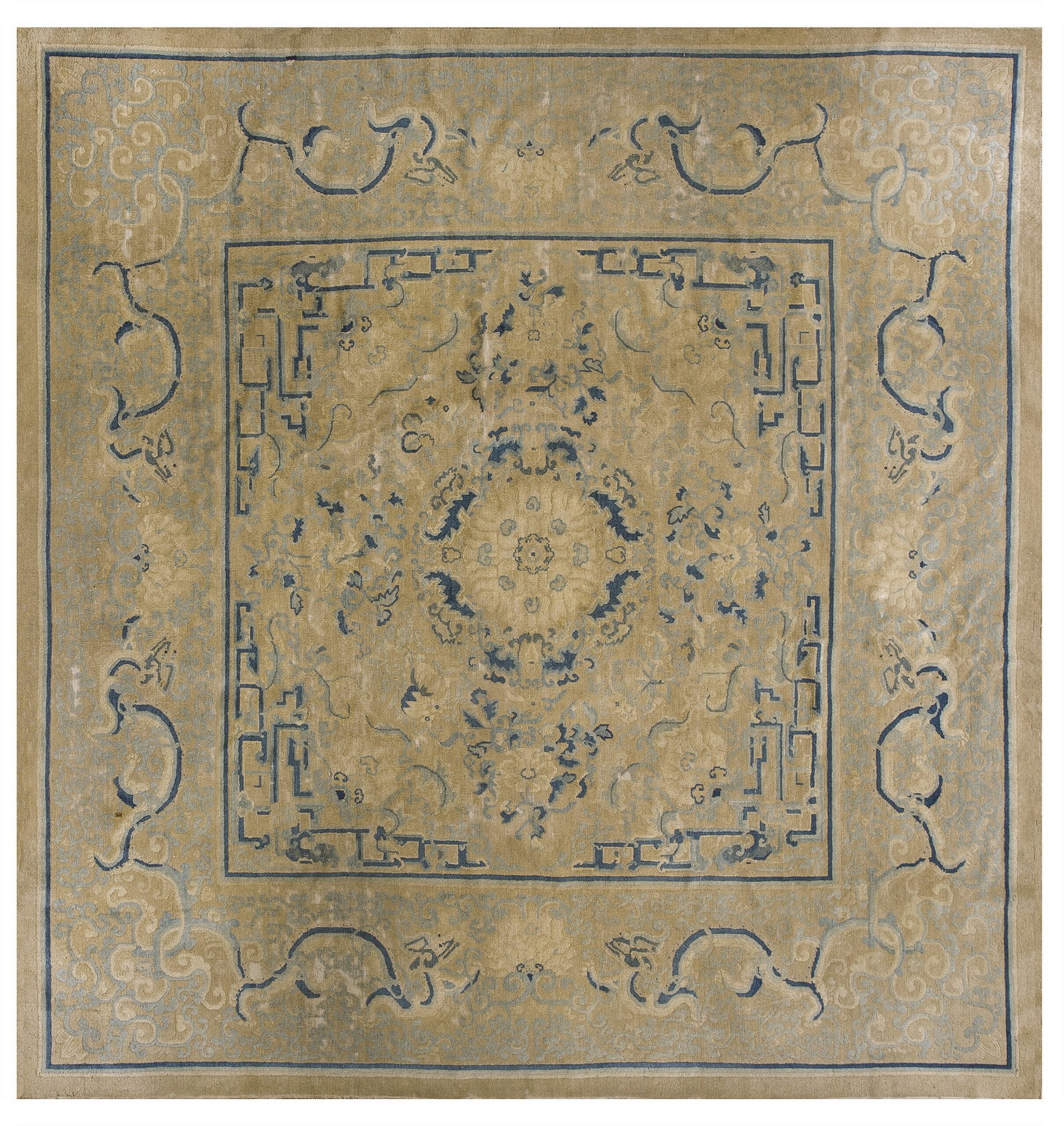 Characteristic of the finest Chinese court weavings, the design employs a highly architectural symmetry. The central medallion, surrounded by delicate floral sprays, is framed by a bold, angular key border. The spandrels feature elegant, sweeping scrollwork that balances the formality of the inner frame, resulting in a composition of quiet authority.