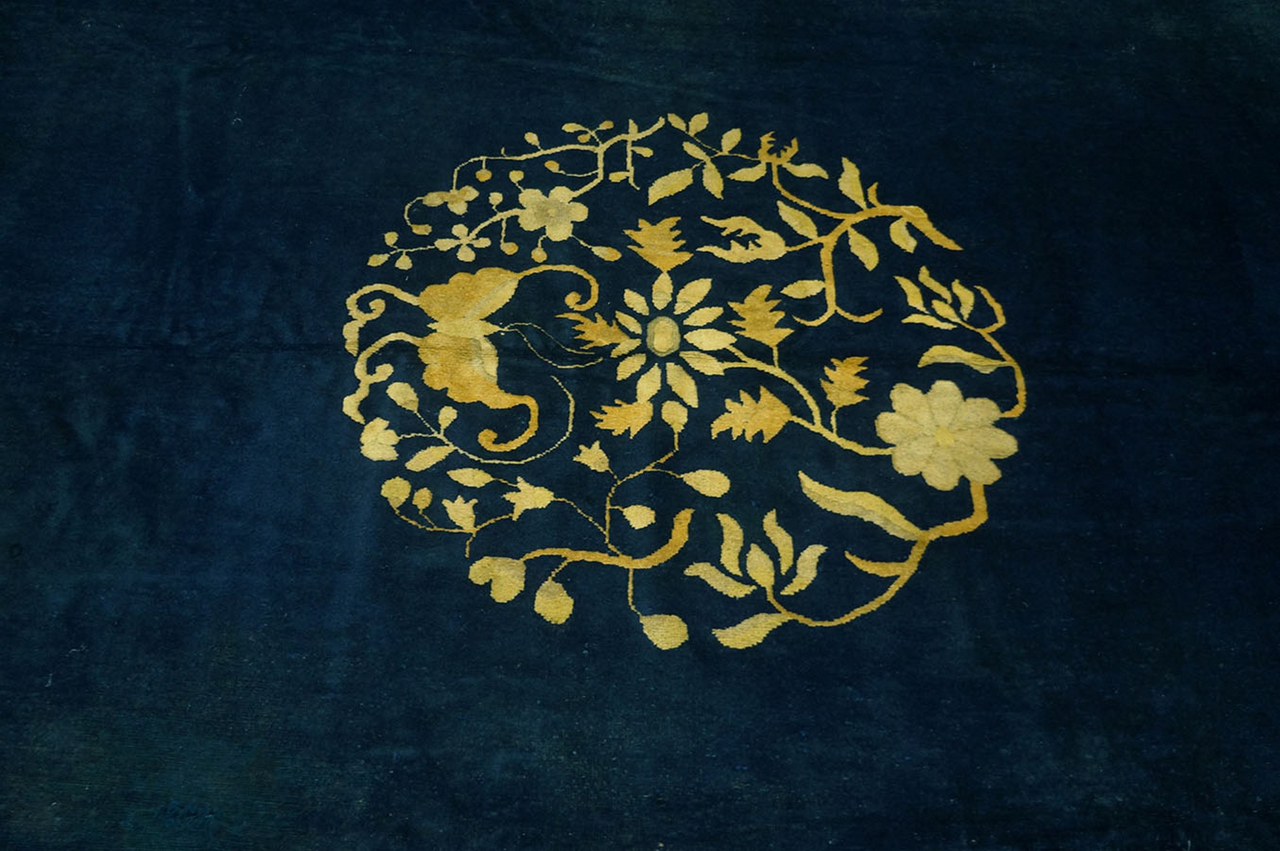 Wool Rectangle Antique 1890s Blue Hand Knotted Pile Rug, Circa Date: 1890s. This exceptional late Qing Dynasty textile exemplifies the refined elegance of Chinese court weaving, utilizing a vast, saturated field to emphasize the precision of its decorative elements. The composition relies on a striking contrast between the deep, velvety indigo ground and the luminous gold and camel tones of the motifs.