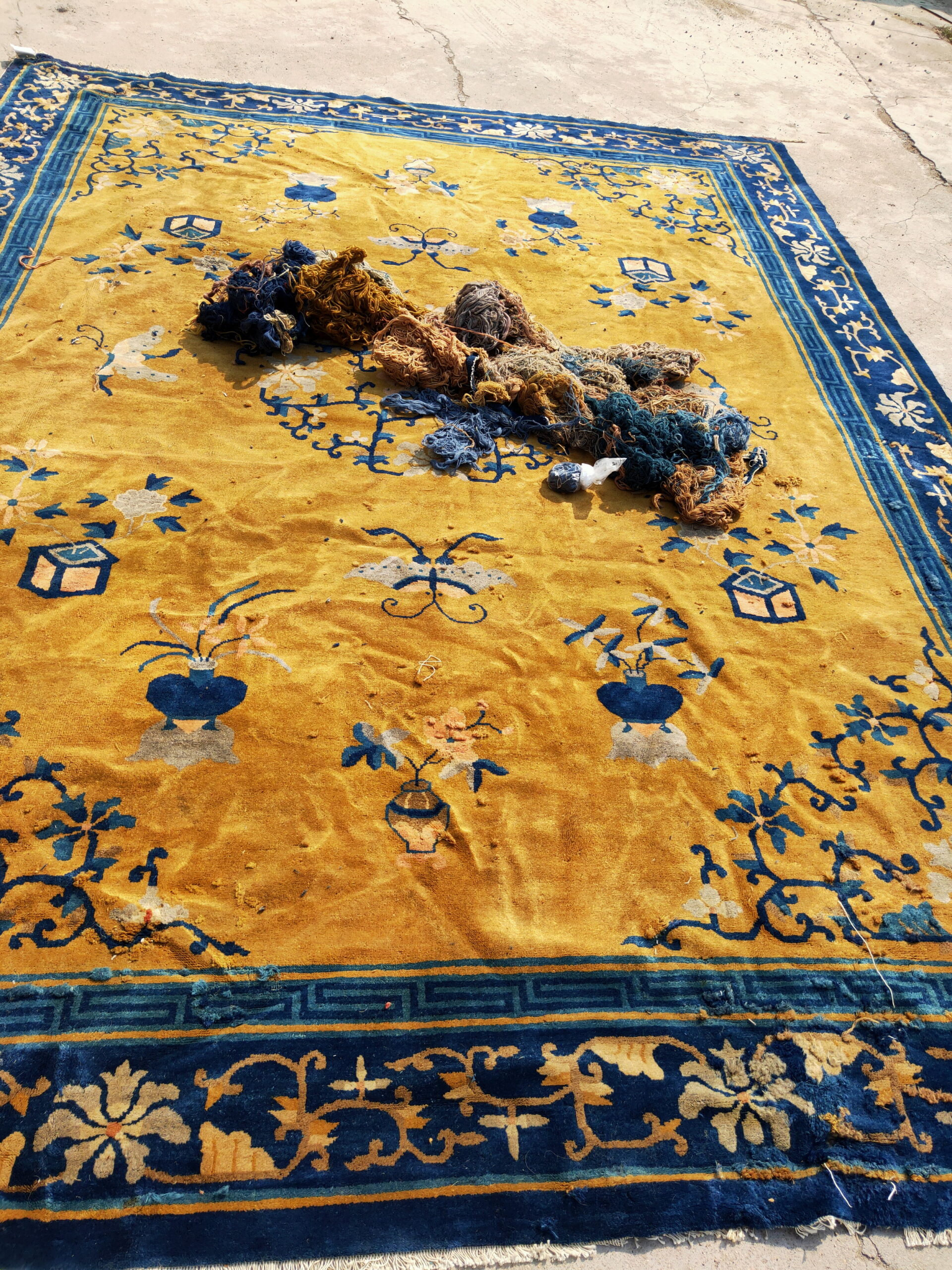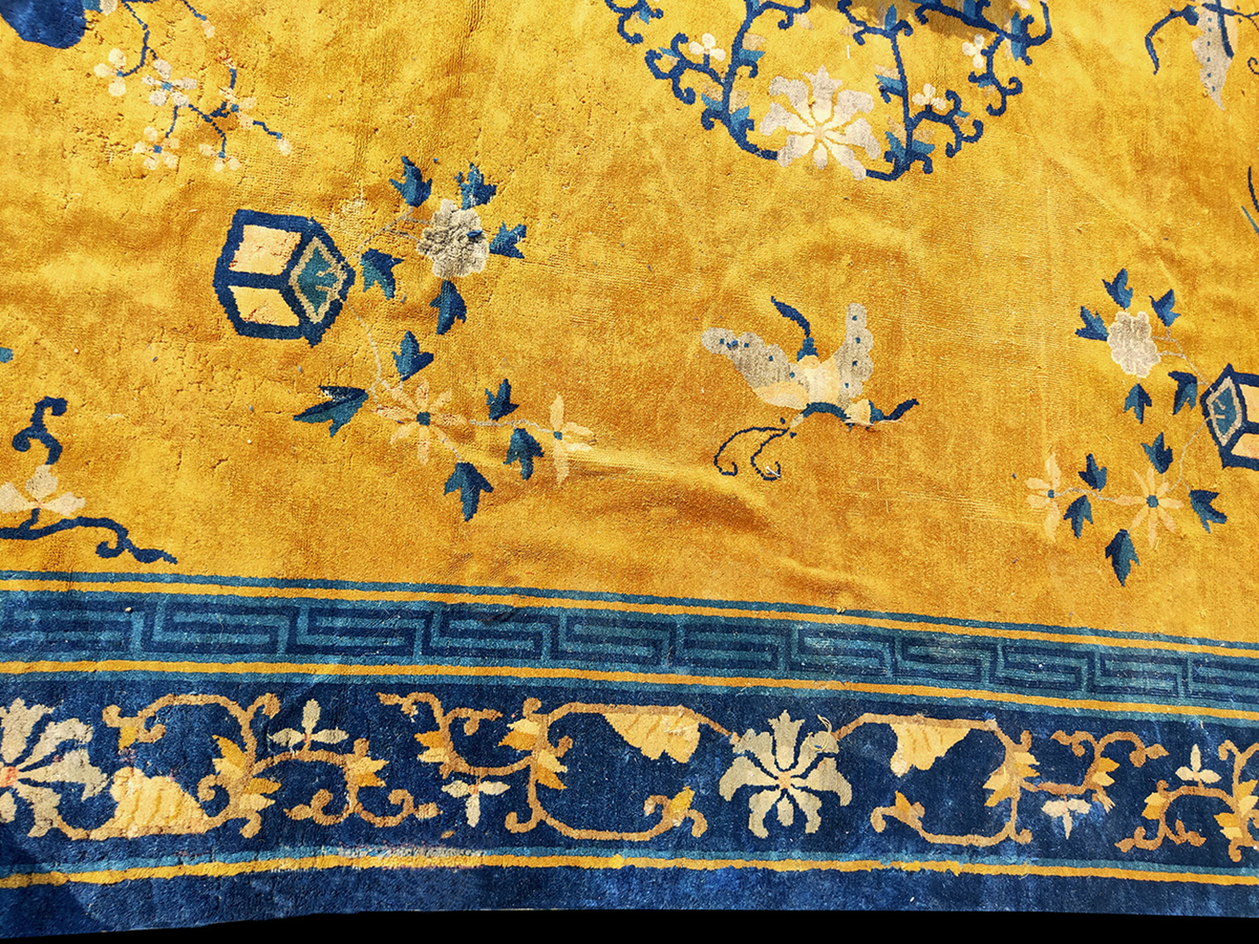 Antique Chinese – Peking Chinese Yellow 1890s Rug, Circa Date: 1890s. This exceptional late 19th-century Peking rug captivates with its brilliant, saturated golden field. The use of this specific hue places it among the most desirable yellow color rugs of the period, contrasting sharply with the deep indigo main border.