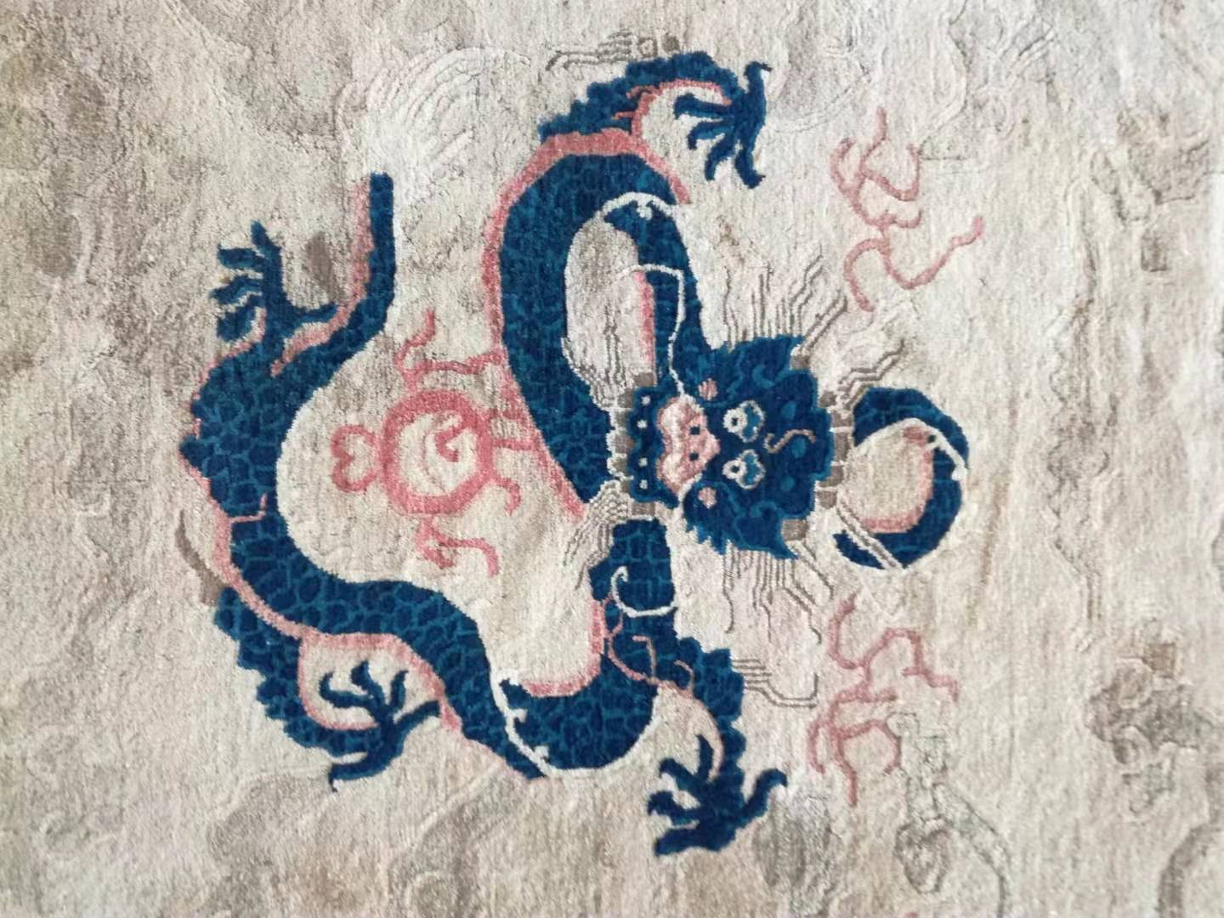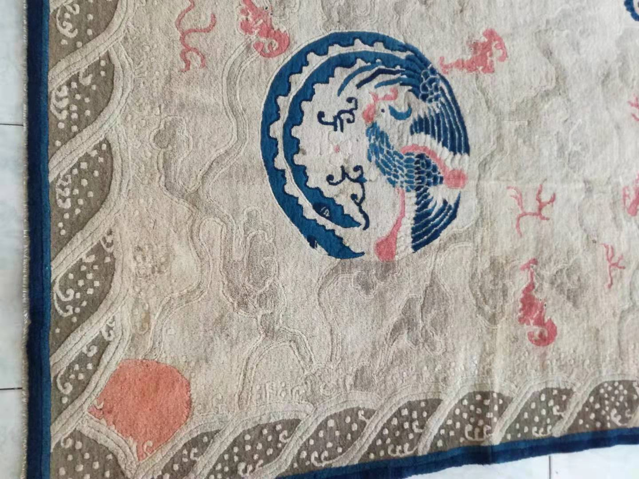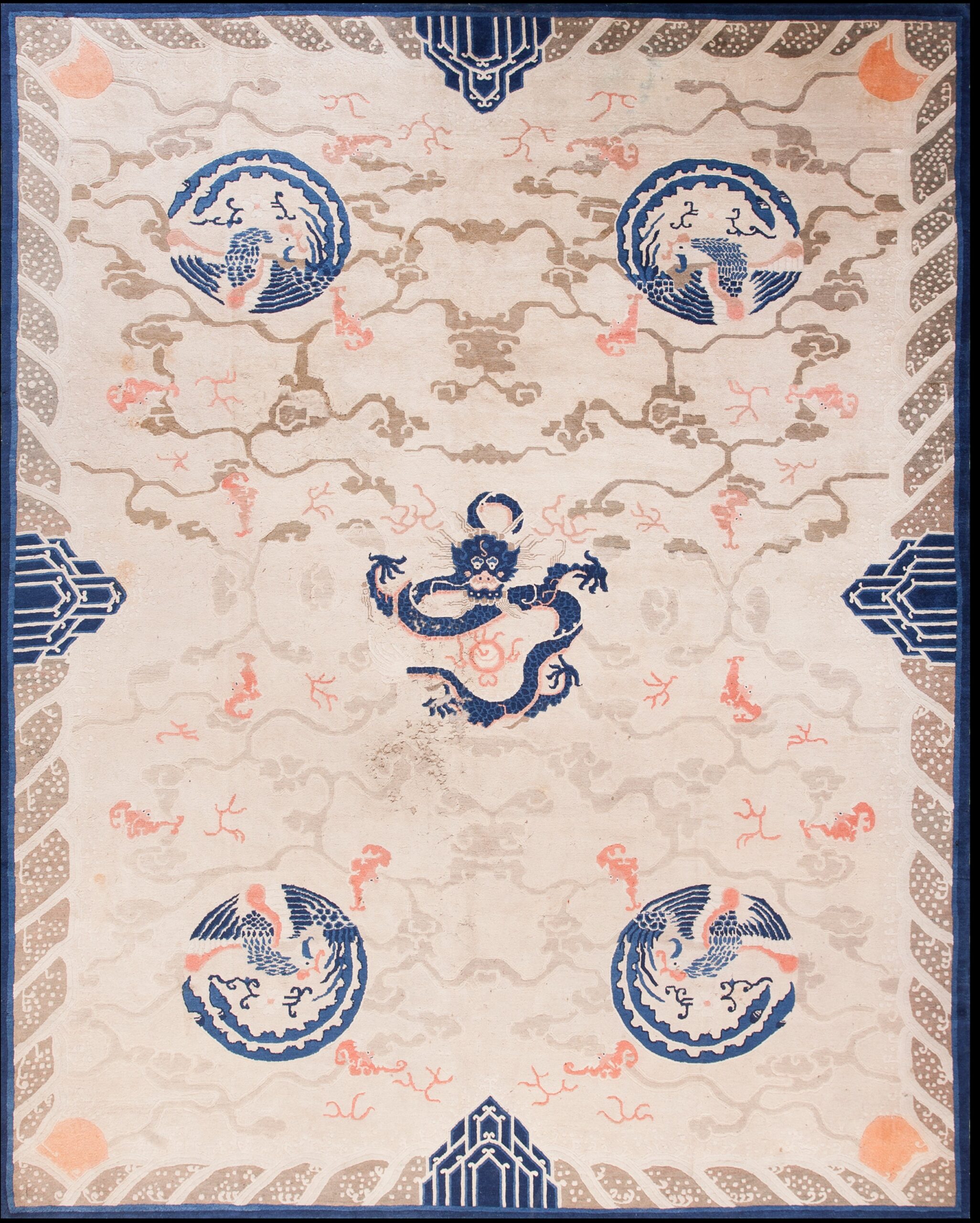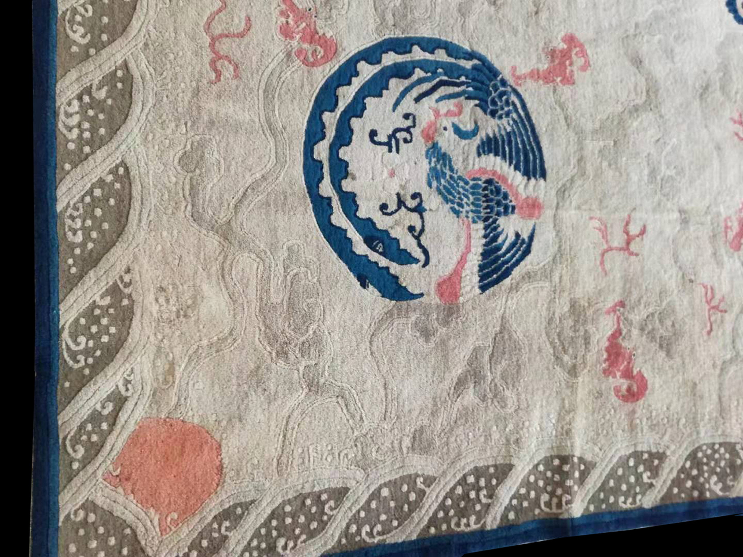 Traditional Chinese symbolism abounds, featuring the powerful central dragon surrounded by four circular phoenix motifs, often representing the Empress. While the overall composition is fluid and pictorial, the border elements, particularly the stylized waves and architectural details, introduce a strong, defined structure that borders on geometric rugs.