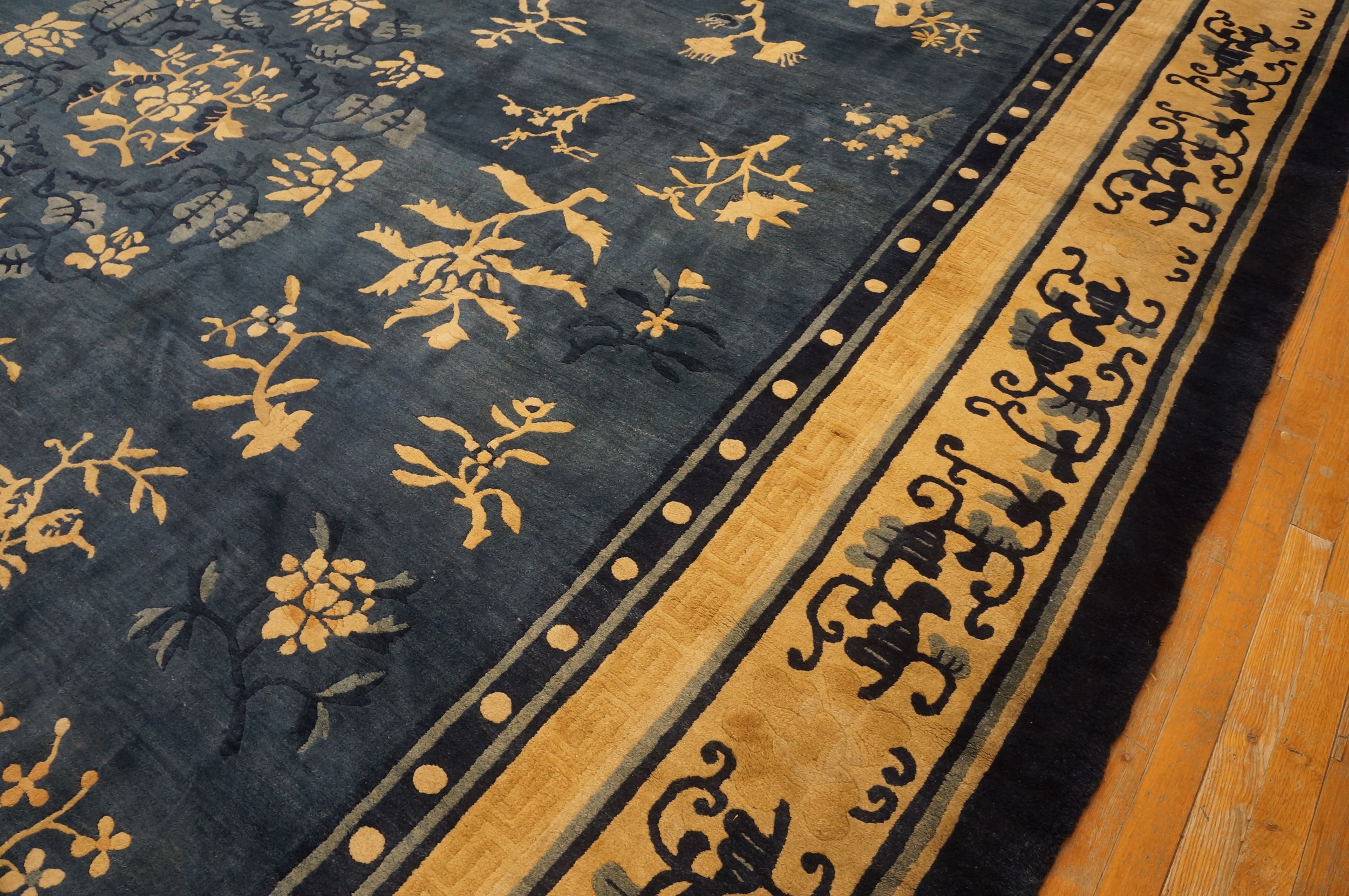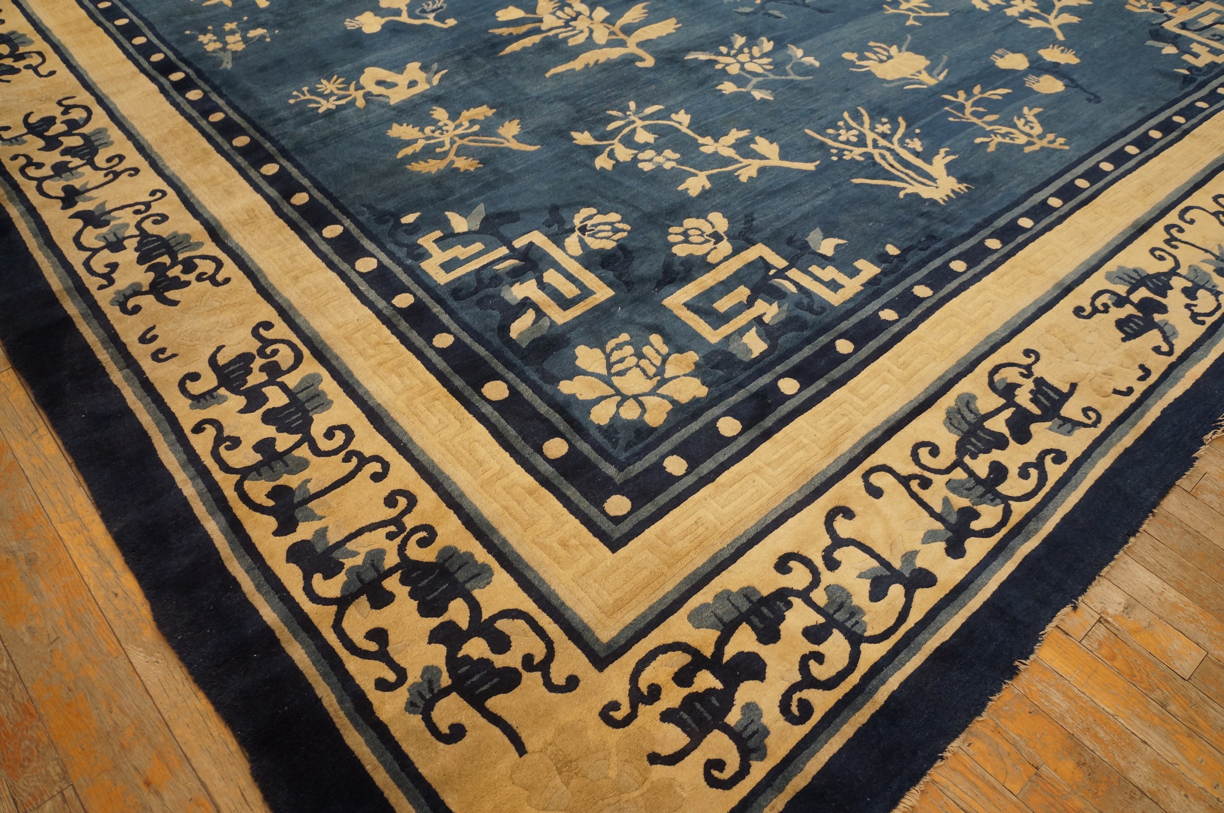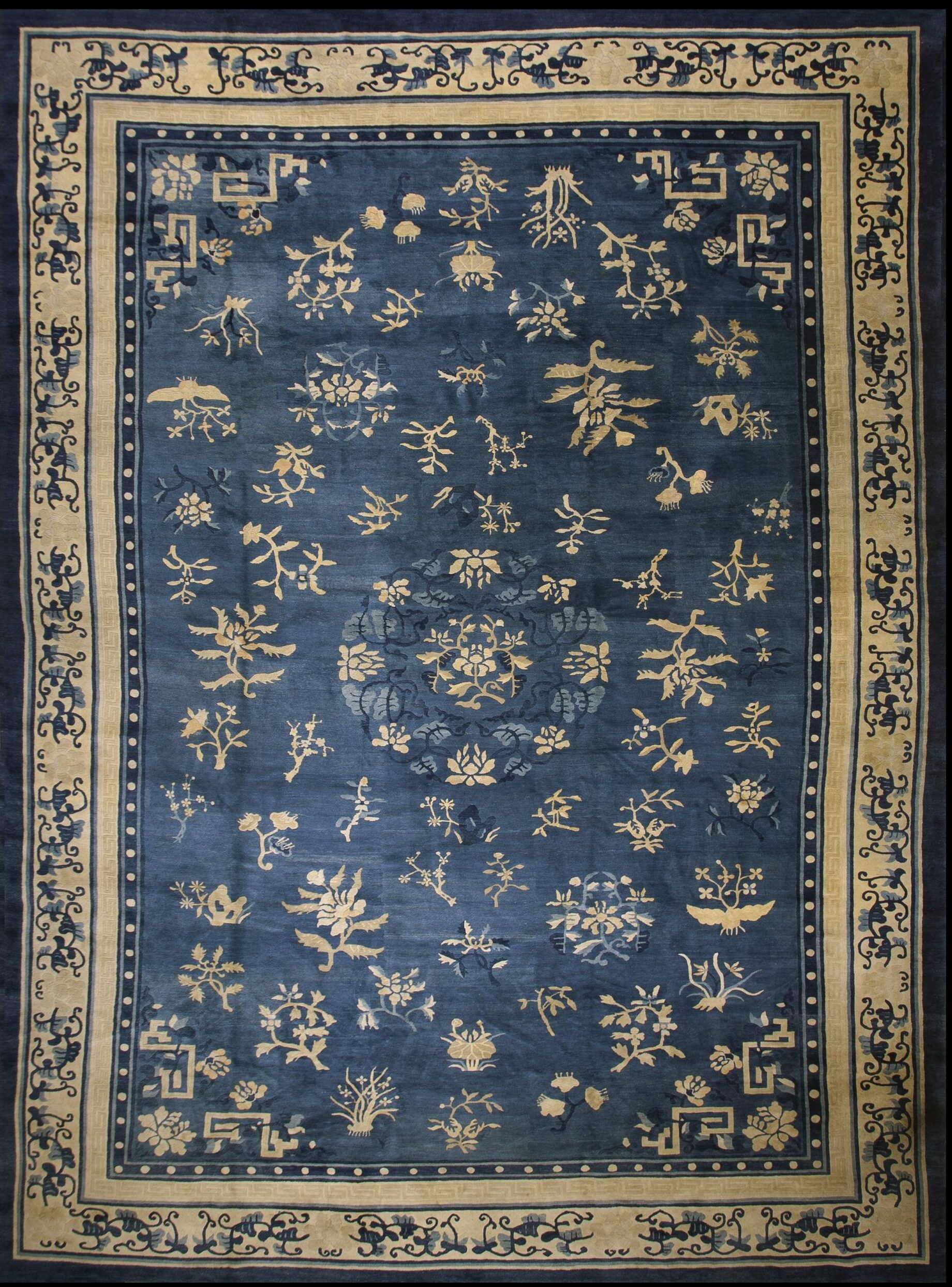 Antique Wool Hand Knotted Pile Blue 1880s Rug, Circa Date: 1880s. This exceptional example of late 19th-century weaving showcases the refined aesthetic of Chinese Peking design, characterized by its striking contrast and open composition. As a piece of history, it represents the finest traditions of antique rugs from this period.
