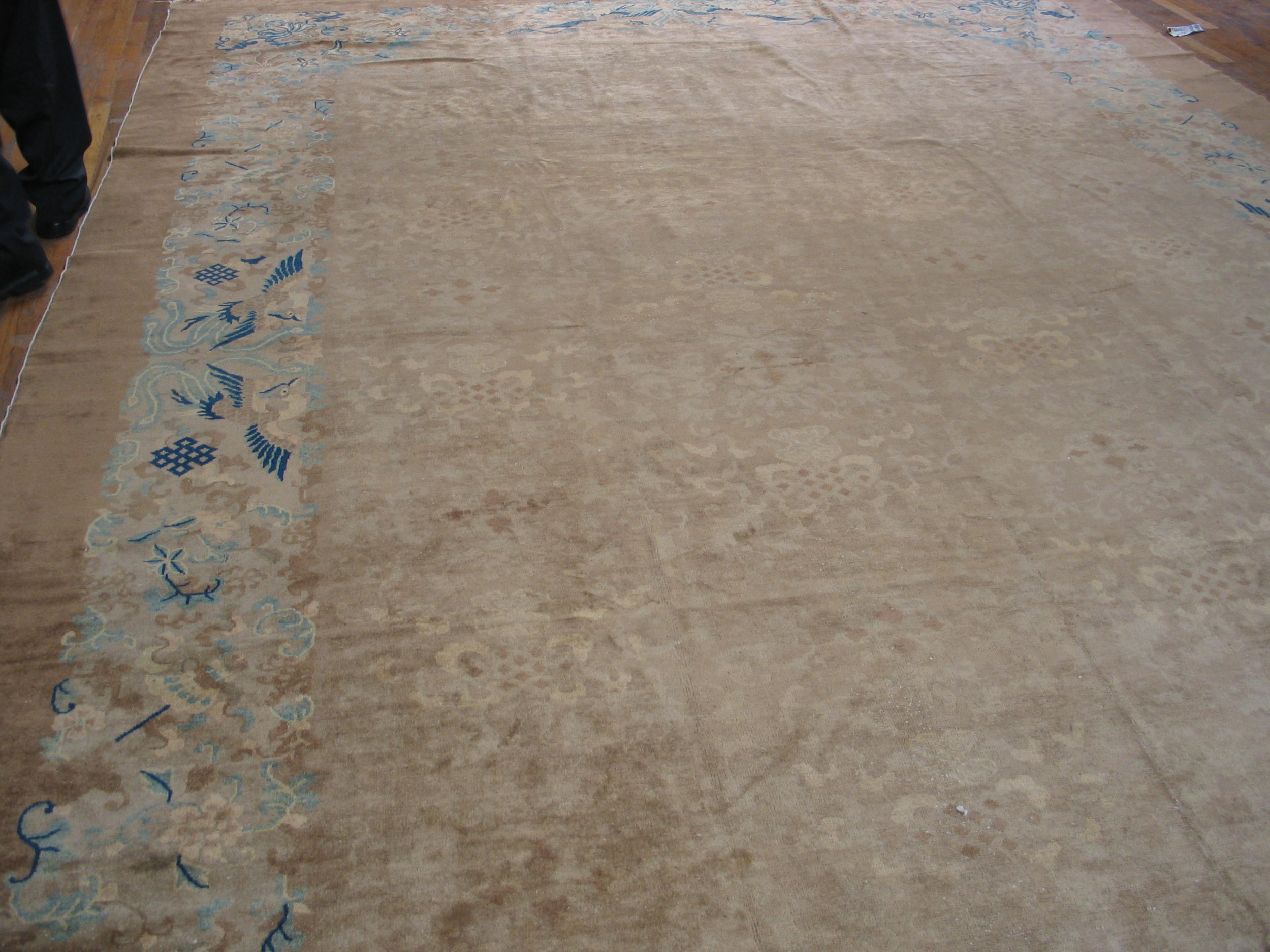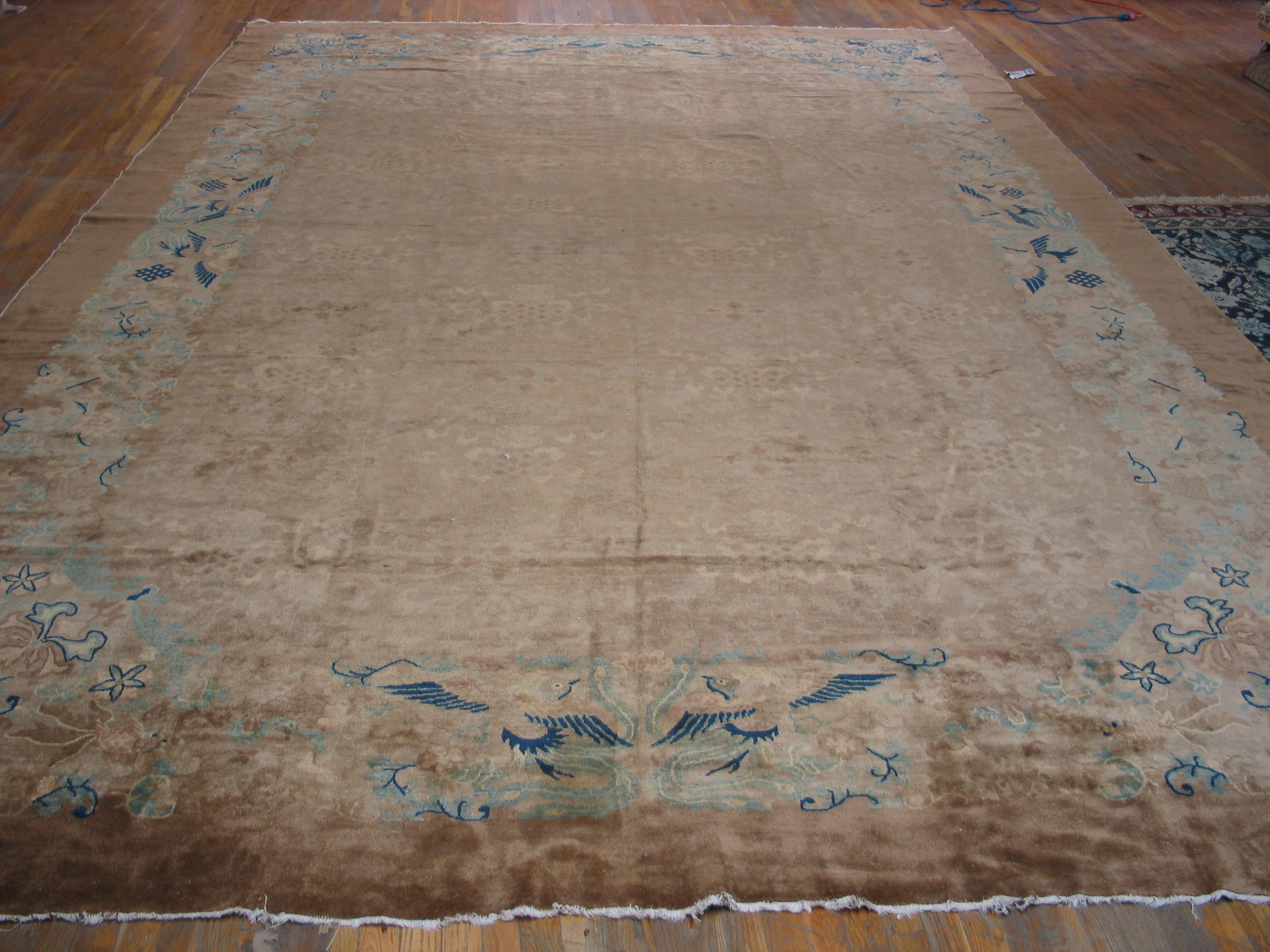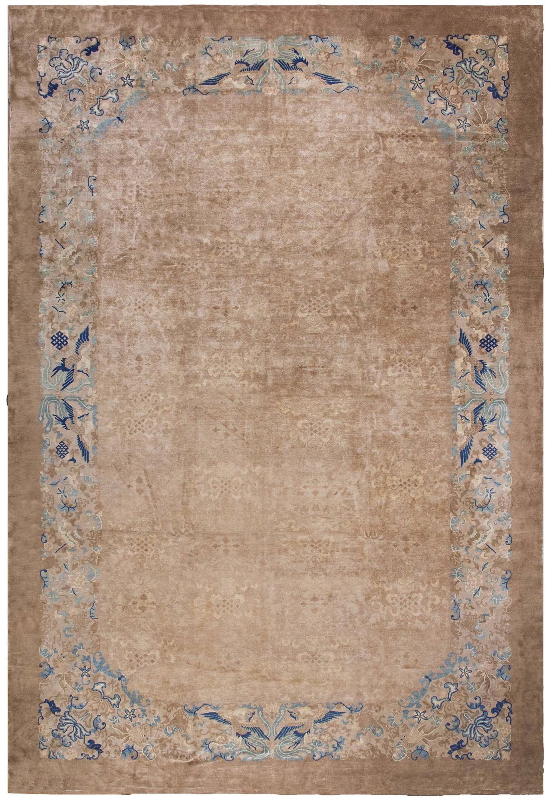 A striking contrast is introduced by the border, where stylized Chinese motifs—including elegant birds and blossoming vines—are rendered in vibrant shades of deep blue and pale aqua. This unexpected use of cool color against the warm ground elevates the rug from a simple floor covering to a refined piece of textile art, showcasing the master weaver’s skill in balancing restraint with unexpected detail.