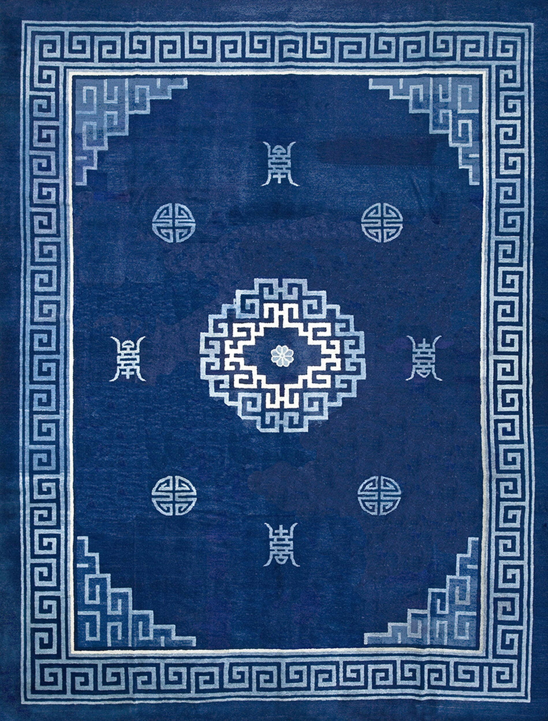 A sophisticated border system frames the central field, utilizing the Greek Key or Meander pattern in varying shades of light blue and white. Scattered throughout the field are stylized Shou symbols, representing longevity and good fortune, which subtly enhance the cultural depth of this exceptional piece.