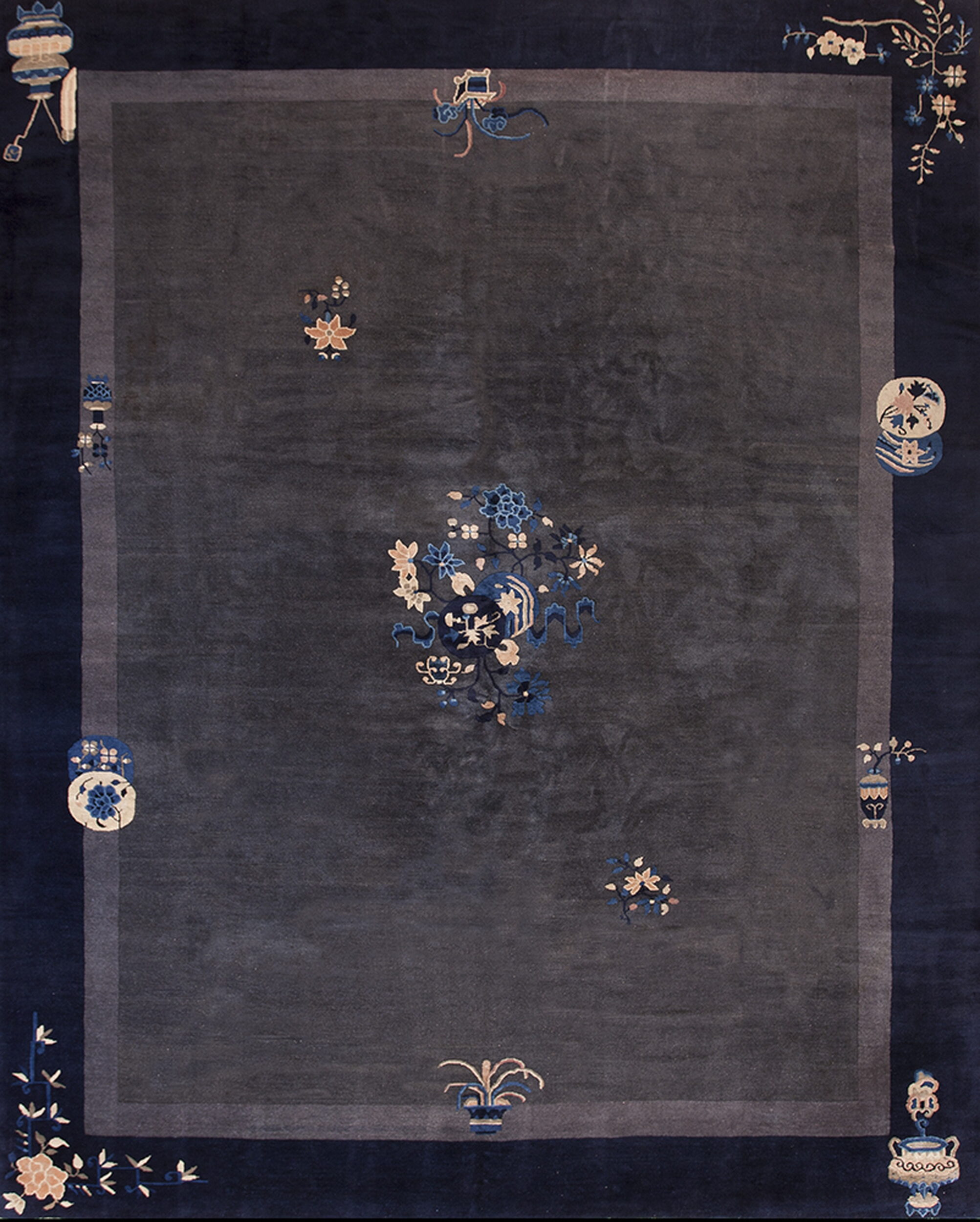 Centered within the expansive field is a beautifully composed floral medallion, rendered in soft blues, creams, and blush tones. The overall design features delicate, scattered floral rugs and symbolic Chinese objects, such as vases and lanterns, placed strategically near the border, lending a refined asymmetry to the composition.