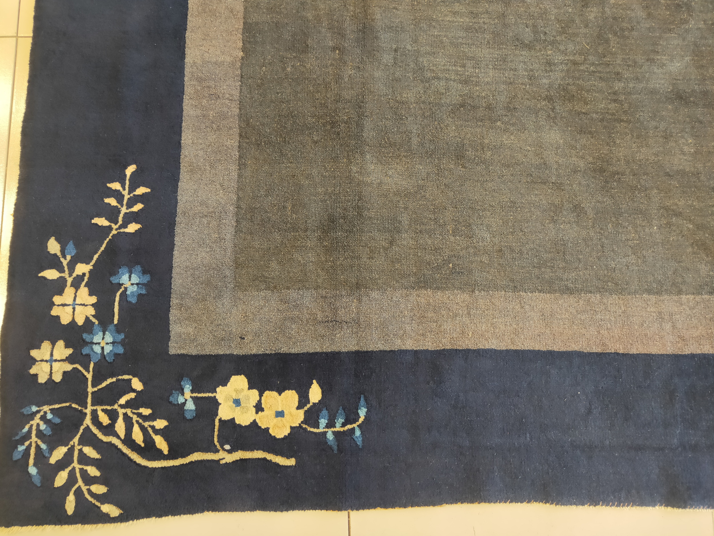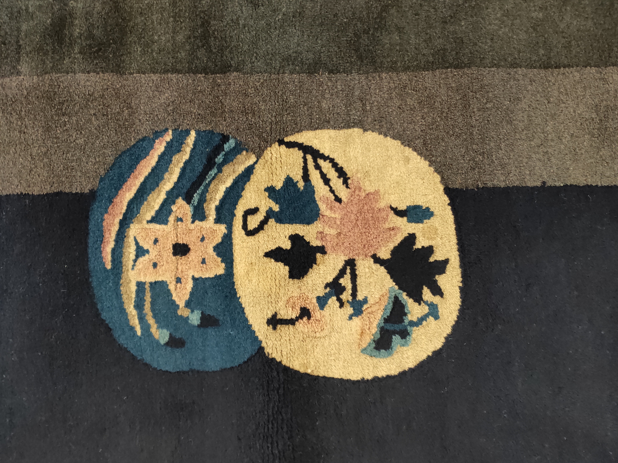 The commanding field is rendered in a deep, lustrous slate, providing a perfect backdrop for the sparse, elegant ornamentation. The use of a rich gray color is highly characteristic of the Art Deco influence beginning to permeate Chinese weaving traditions, moving away from traditional bright palettes toward more sophisticated, architectural tones.