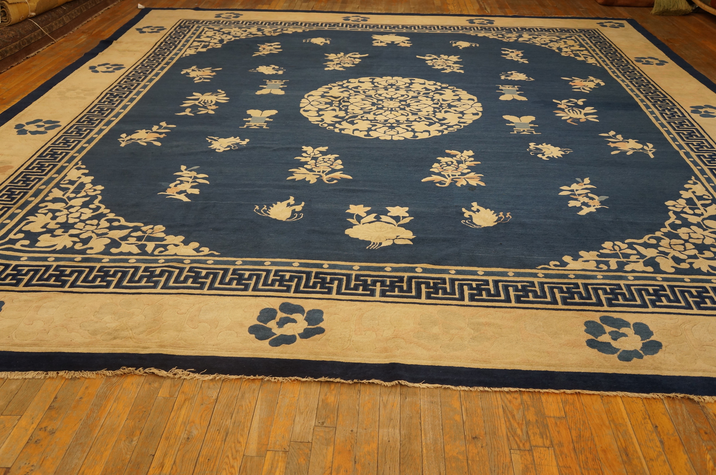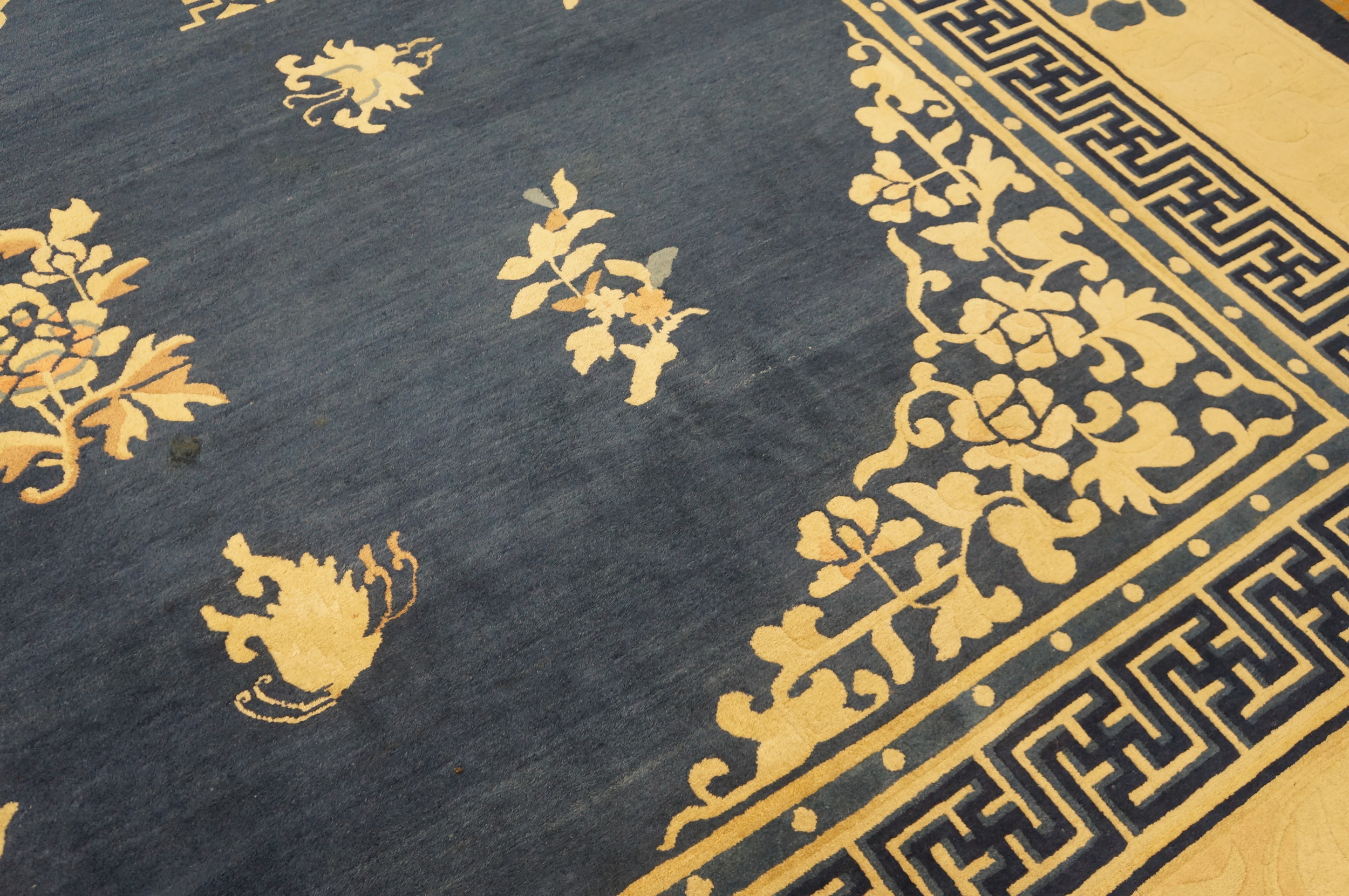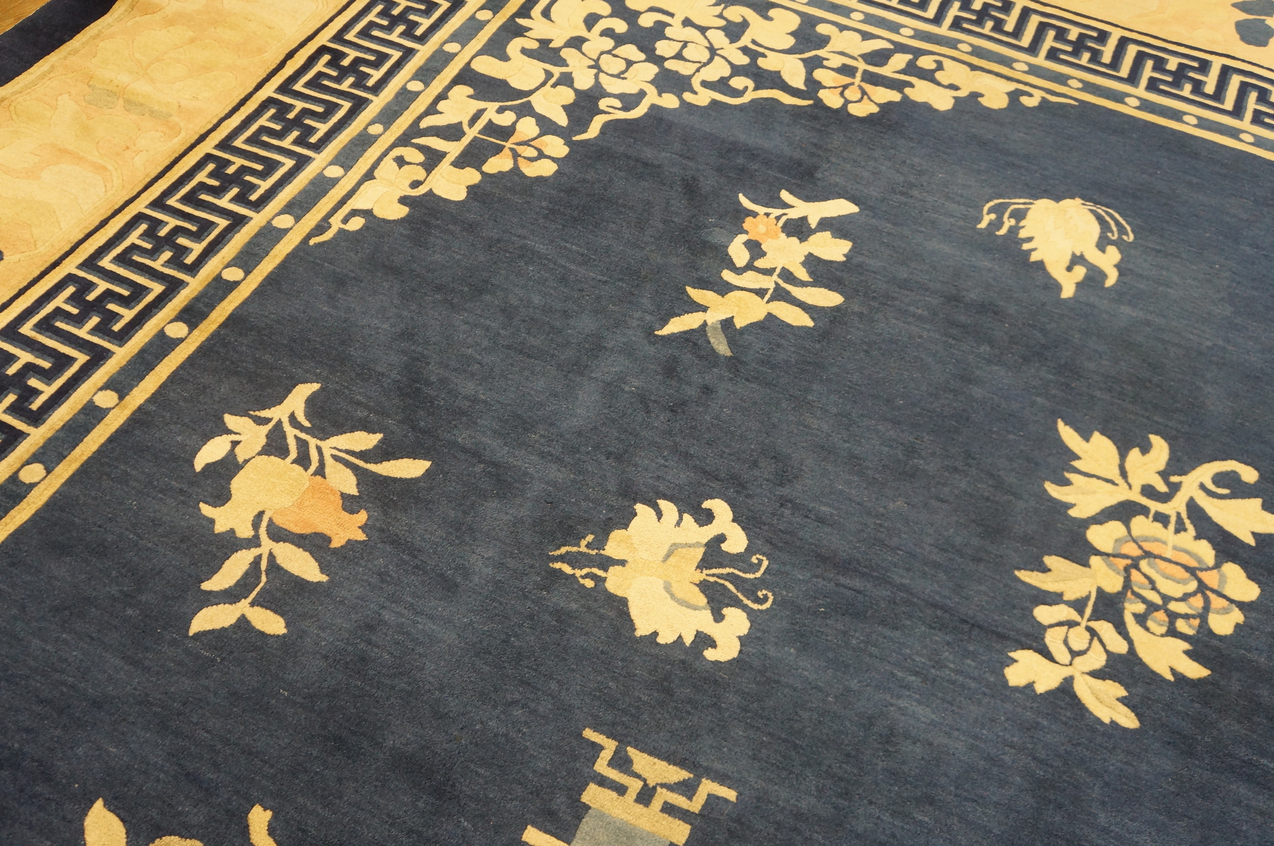 Large Rectangle 1880s Blue Wool Floral Medallion Antique Hand Knotted Pile Rug, Circa Date: 1880s. This exceptional piece, dating from the late 19th century, is a superb example of traditional Chinese weaving, likely originating from the Peking region. The robust construction confirms its status as an antique hand knotted pile rug of significant historical value and enduring quality.