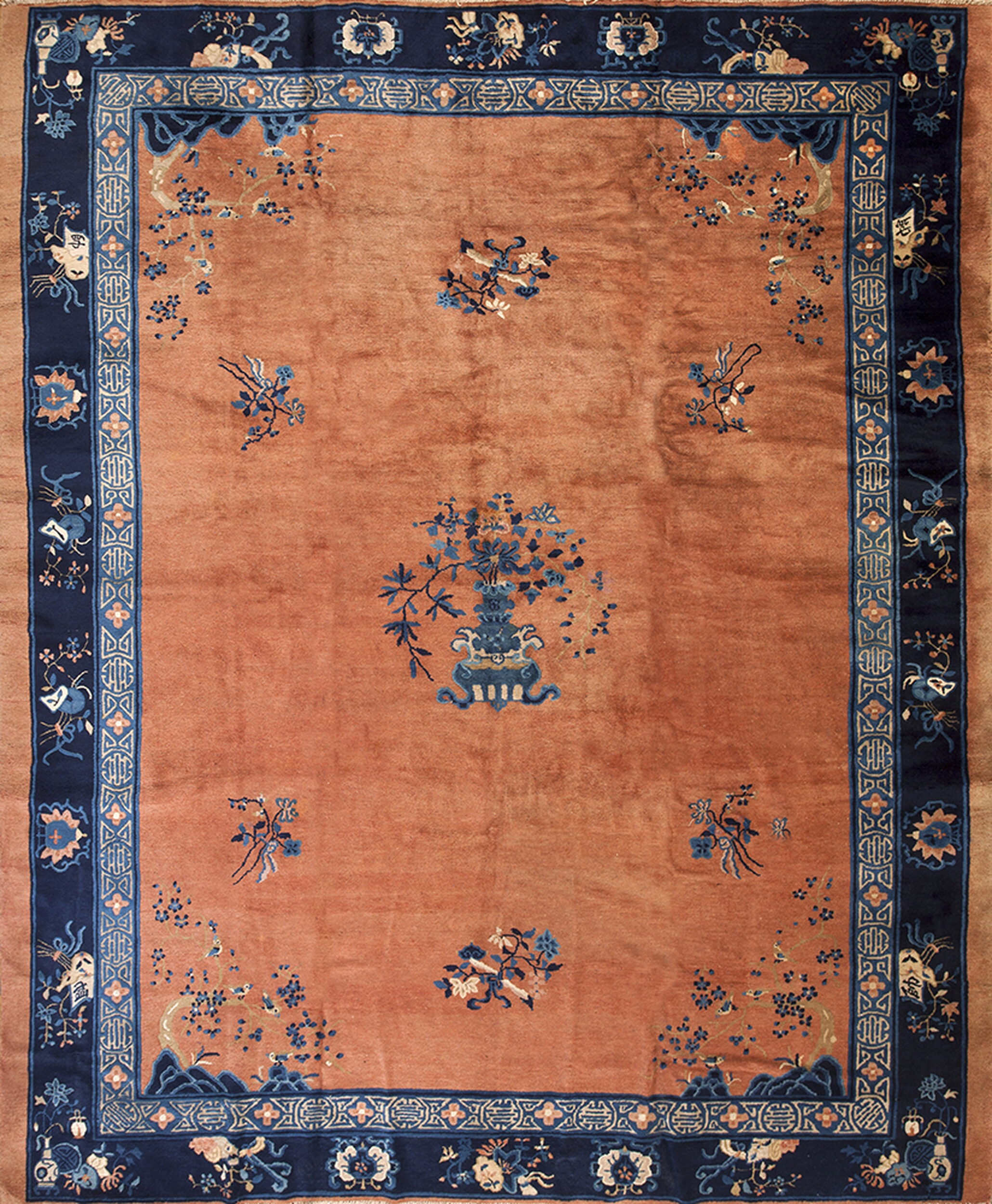 Antique Peking Chinese Floral Medallion Wool Hand Knotted Pile 1900s Rug, Country of Origin: China, Circa Date: 1900s. This magnificent example of Chinese rugs captures the restrained elegance typical of early 20th-century weaving. The field is dominated by a rich, soft terracotta hue, providing a warm contrast to the deep indigo border, a characteristic color pairing that defines the era’s aesthetic.
