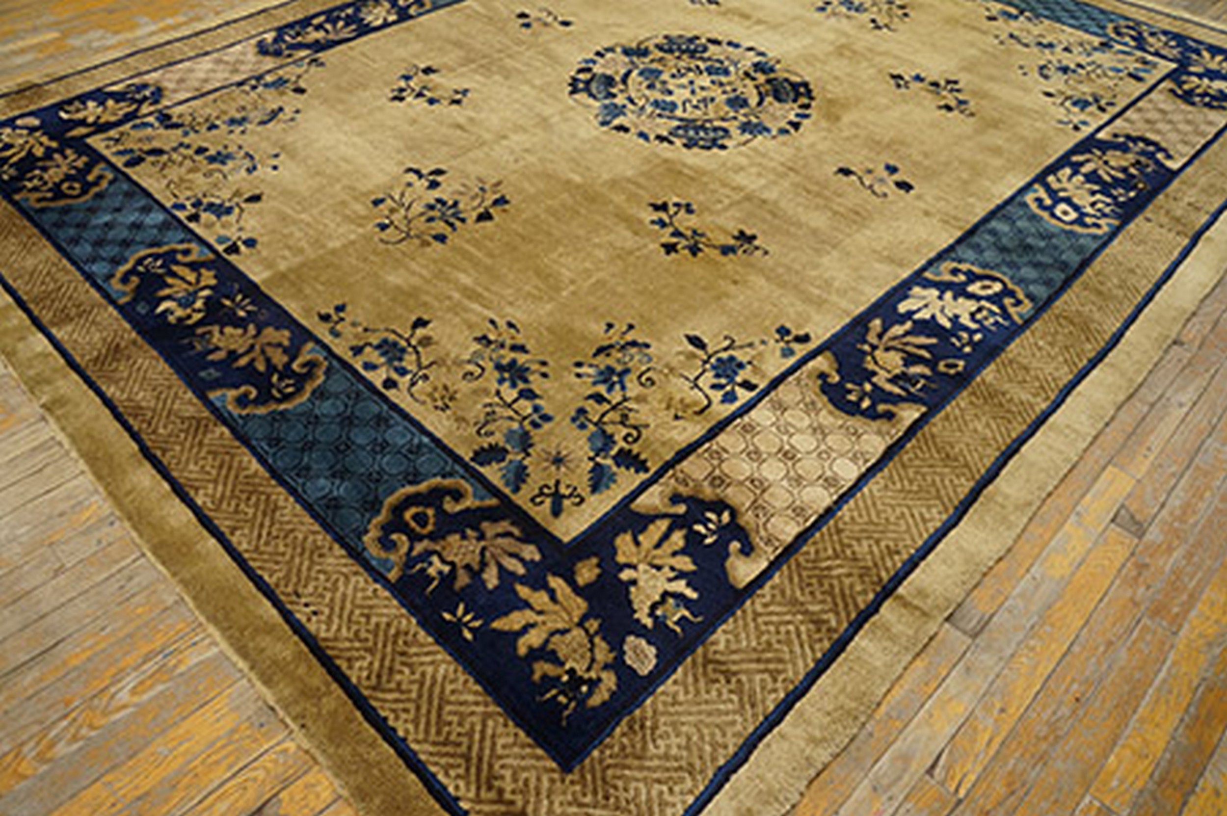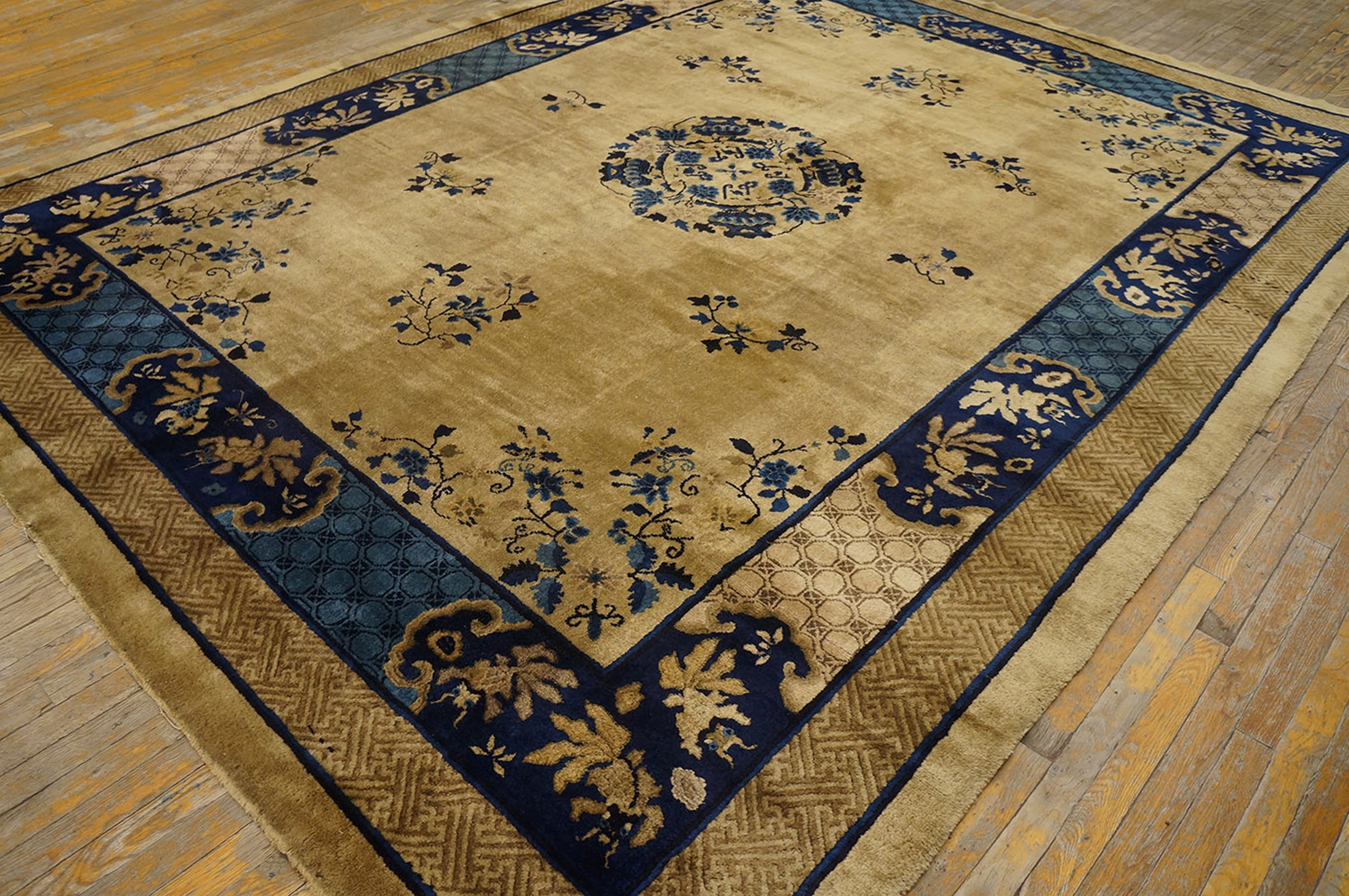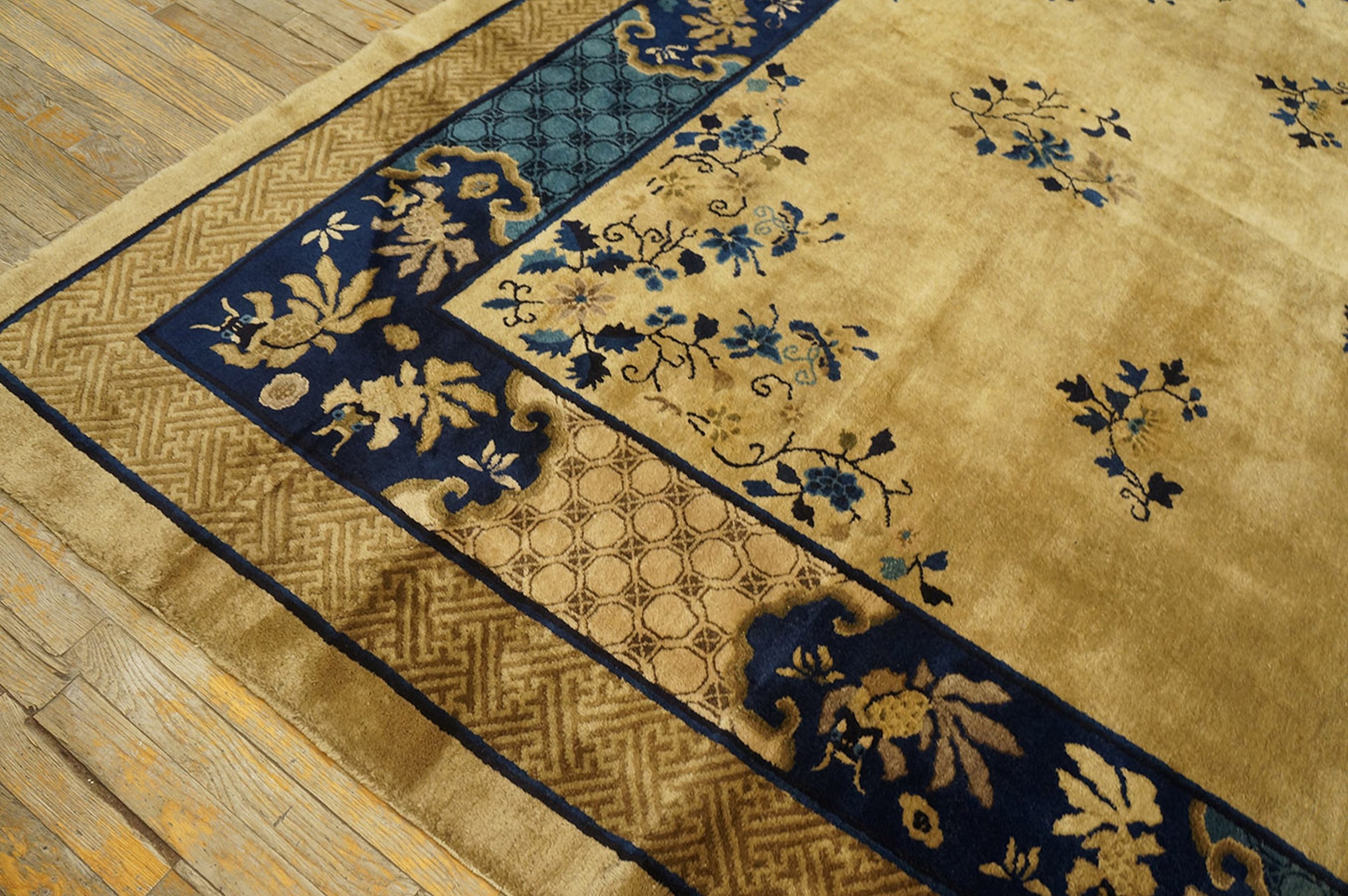 Hand Knotted Pile Ivory Beige Cream White Rectangle 1920s Wool Antique Rug, Circa Date: 1920s. This exquisite Chinese Peking rug captures the transitional elegance of the early 20th century, presenting a luminous field set against dramatic borders. The primary palette utilizes a sophisticated blend of ivory beige cream tones, providing a perfect canvas for the intricate detailing rendered in deep cobalt and contrasting teal blues.