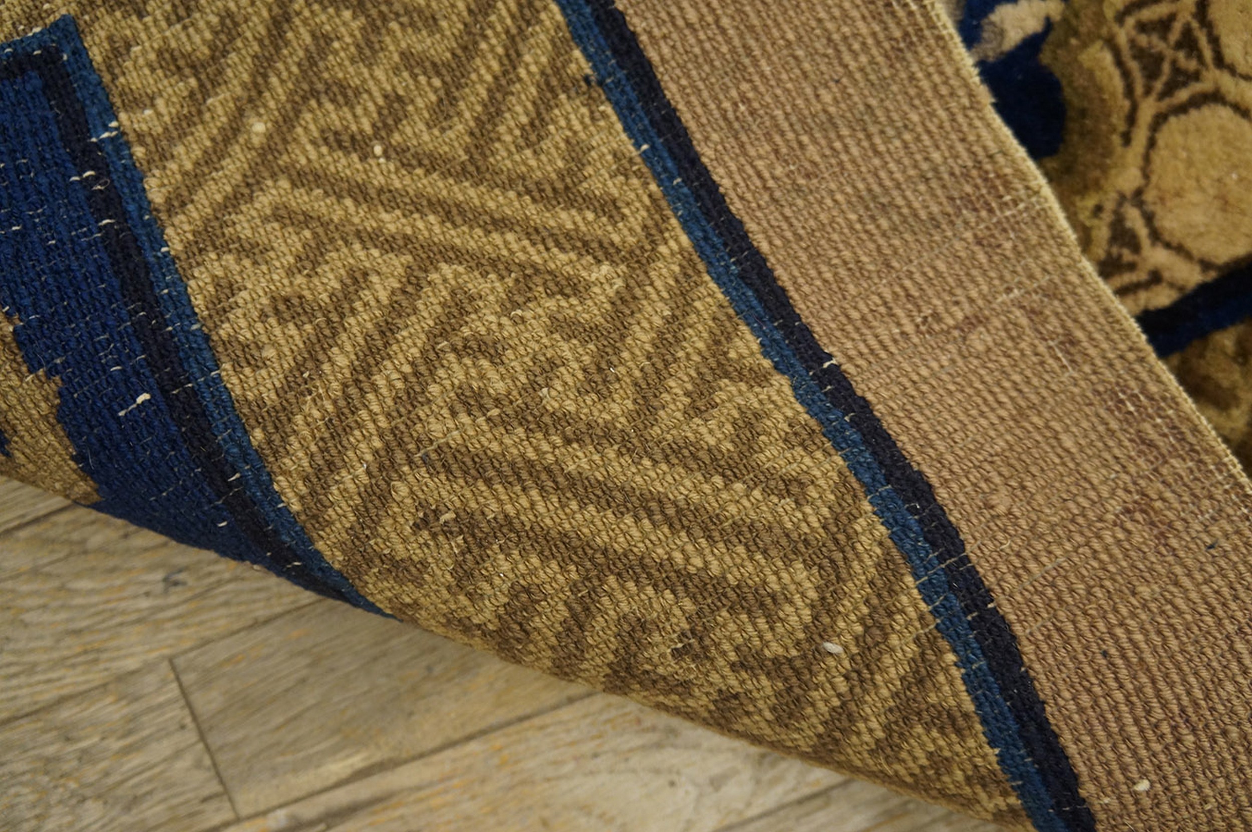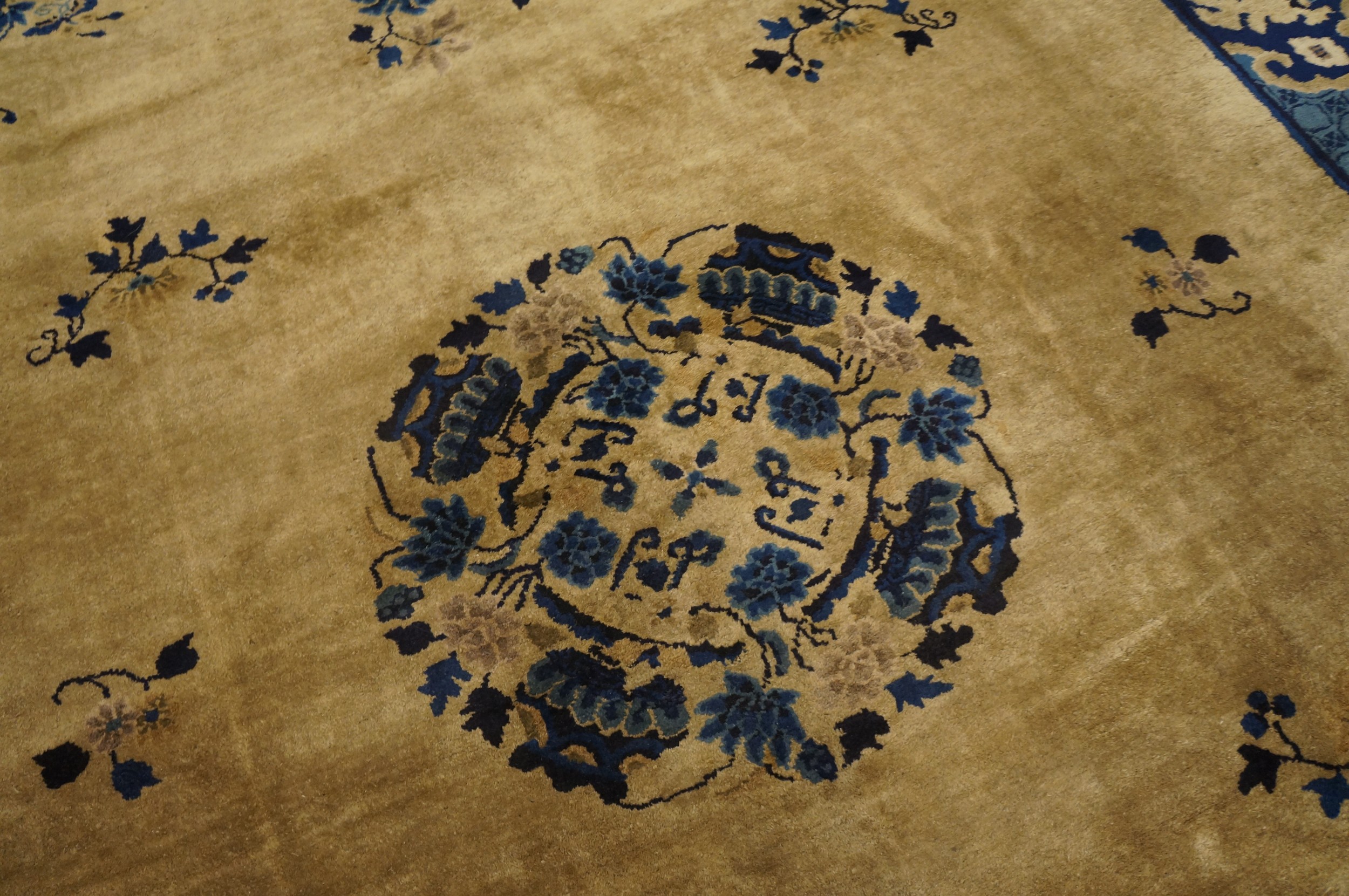 The expansive central field is deliberately open, allowing the luxurious sheen of the wool pile to dominate the composition. At its heart lies a beautifully rendered circular medallion, executed in varying shades of blue, surrounded by delicate, trailing vine work. Scattered blossoms extend gracefully toward the corners, embodying classic Chinese symbolism with a restrained, modern sensibility characteristic of the 1920s.
