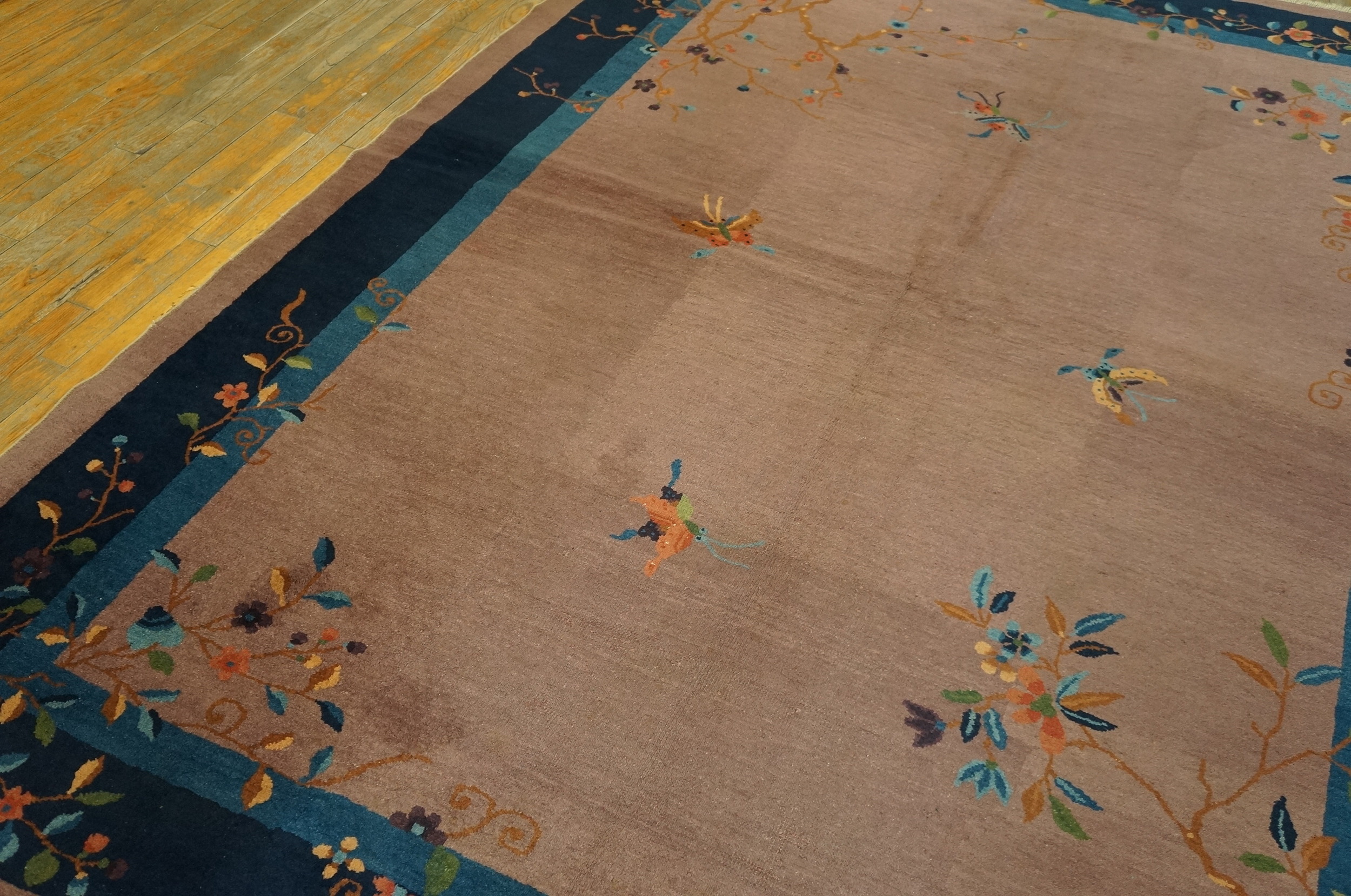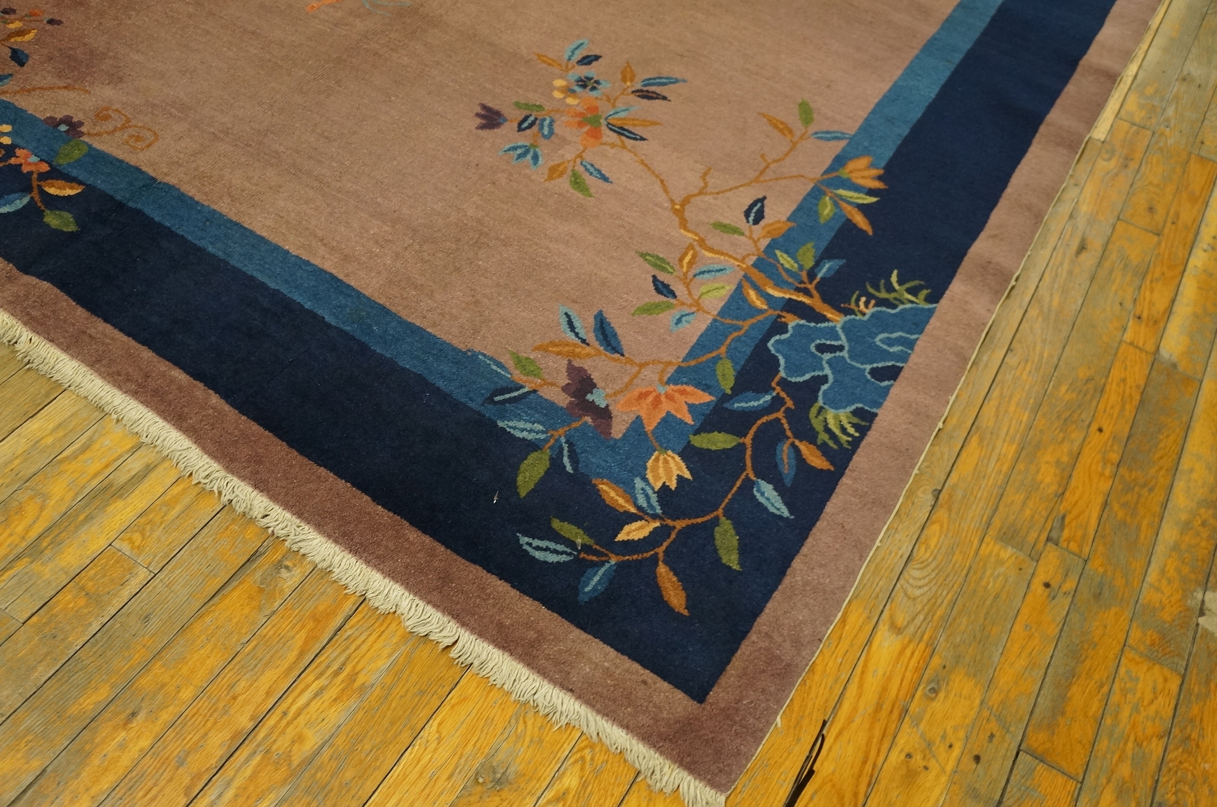 Rectangle Hand Knotted Pile Floral Antique Purple / Lavender Mauve Wool 1920s Rug, Circa Date: 1920s. This exceptional piece captures the distinctive aesthetic of early 20th-century Chinese weaving, characterized by its open field and restrained palette. The dominant hue is a sophisticated, dusty purple / lavender mauve, a color choice that speaks to the transitional period between traditional Chinese palettes and the Art Deco influences arriving from the West.