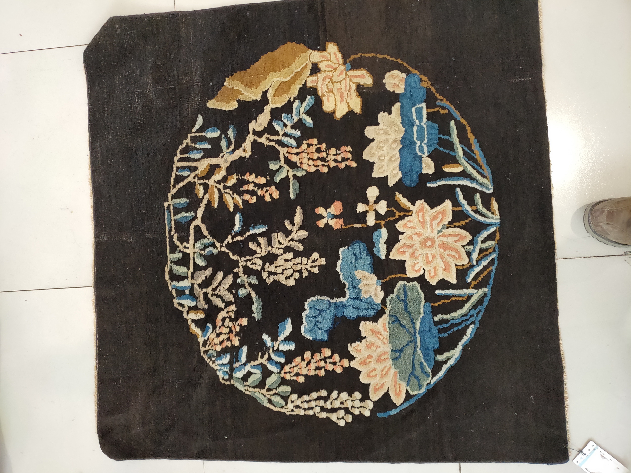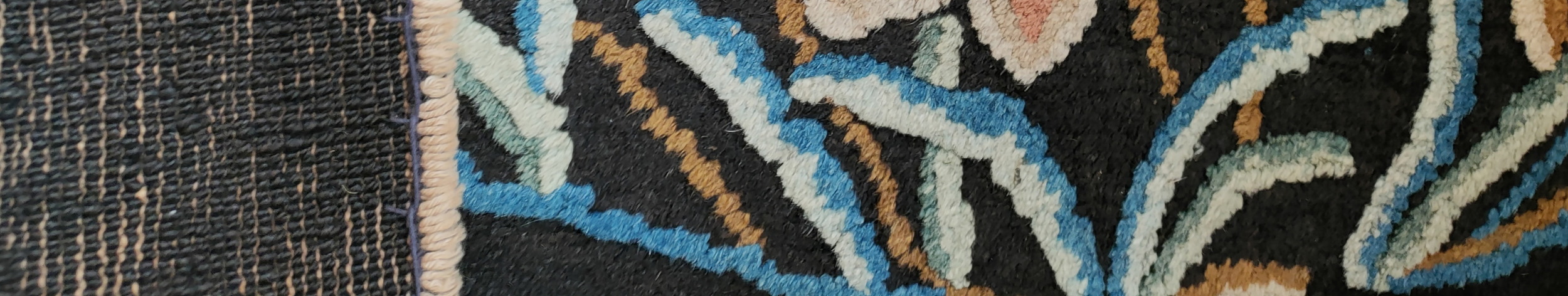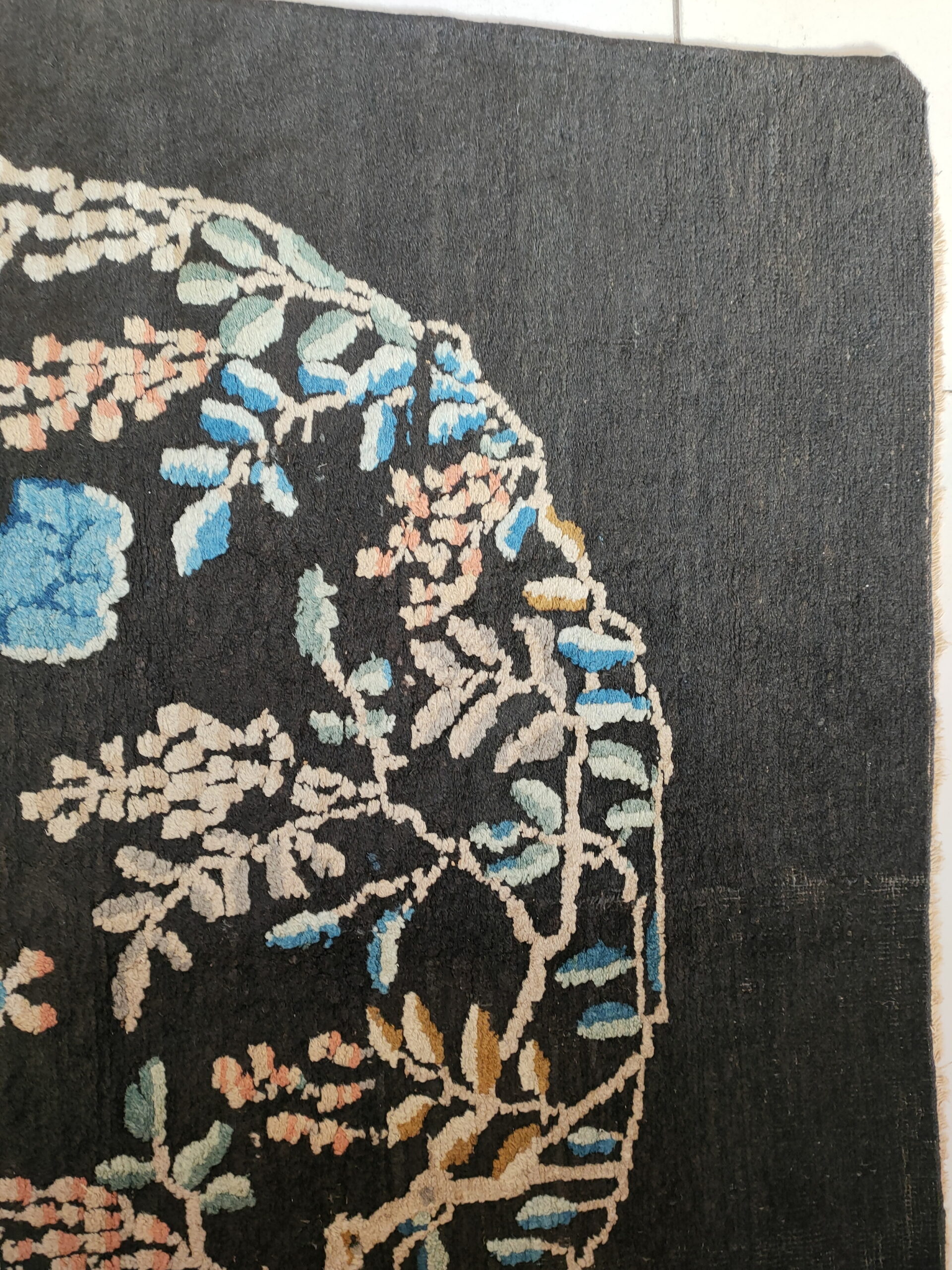 The dramatic ground color, a rich, deep black, provides a powerful backdrop that allows the delicate palette of the design to flourish. This sophisticated use of contrast is typical of fine peking rugs from this period. The central medallion features stylized lotus blossoms and trailing wisteria rendered in soft blues, creams, and pale pinks, creating a stunning visual tension against the deep black color rugs.