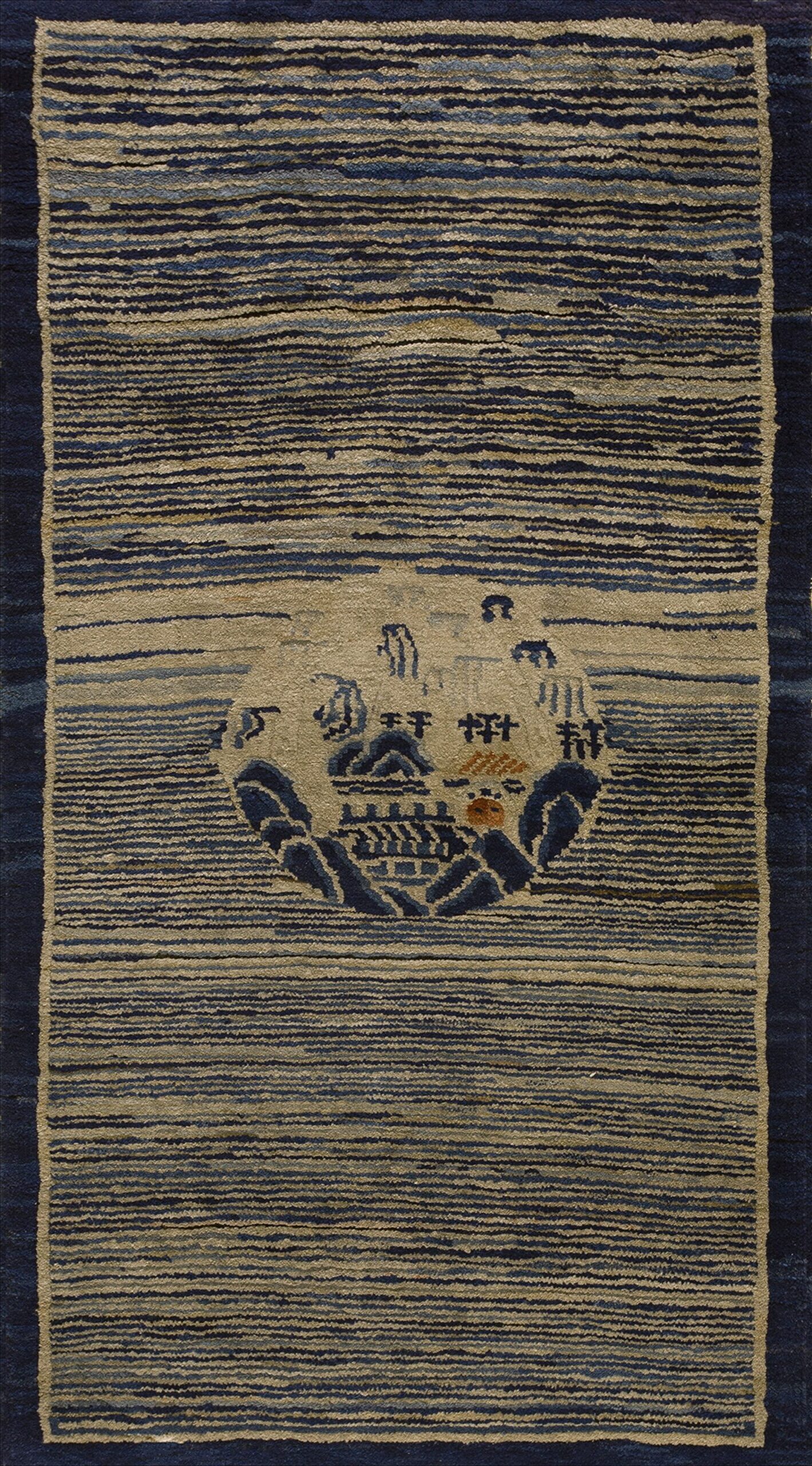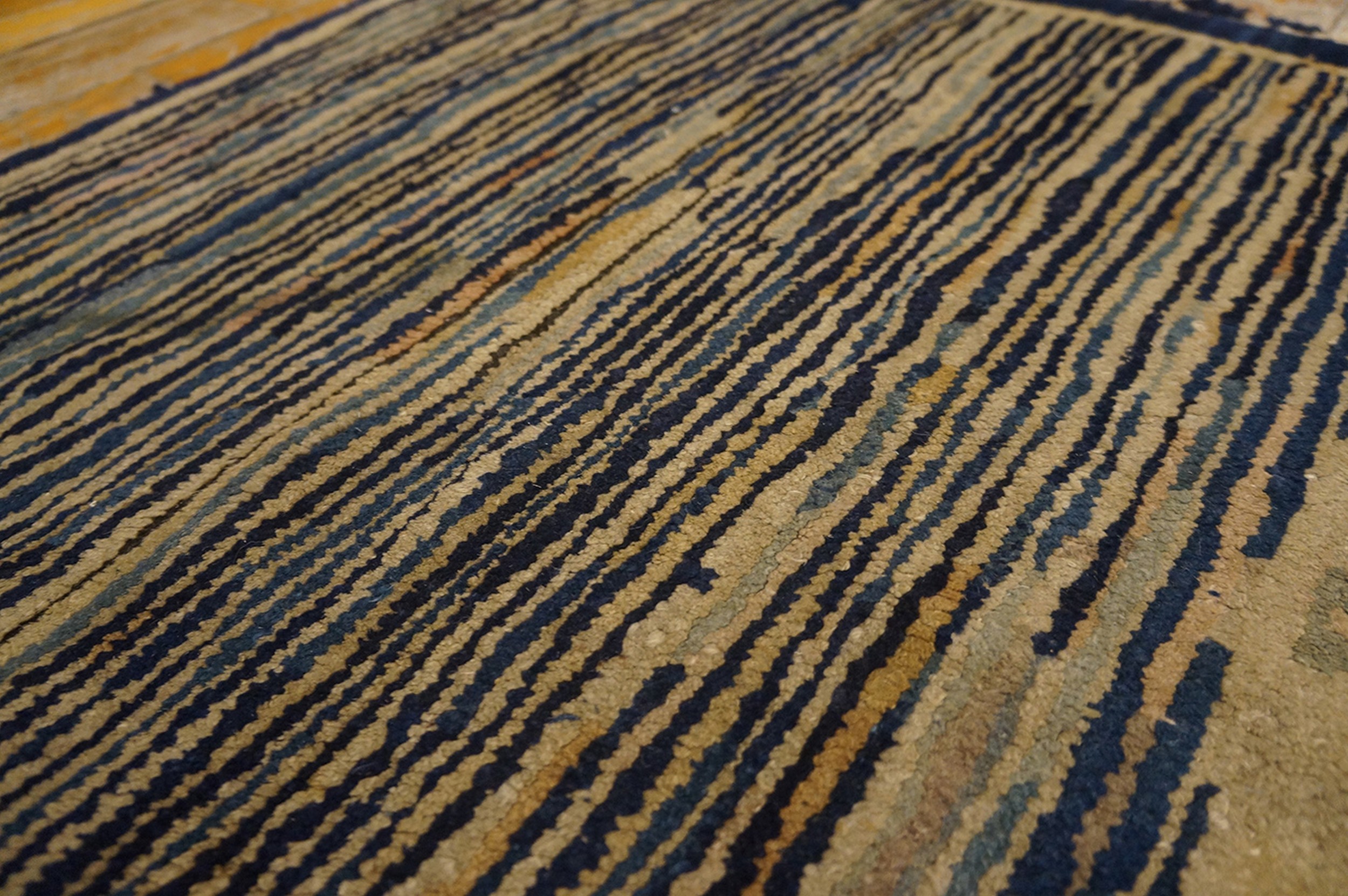 Antique Chinese – Peking Small Scatter Size Wool Multicolor Rug, Circa Date: 1900s. This exceptional Peking weaving captures the transitional aesthetic of early 20th-century Chinese textile art. The design is dominated by a striated field of alternating navy and taupe bands, creating a powerful, almost kinetic visual texture, making it a compelling example among antique rugs.