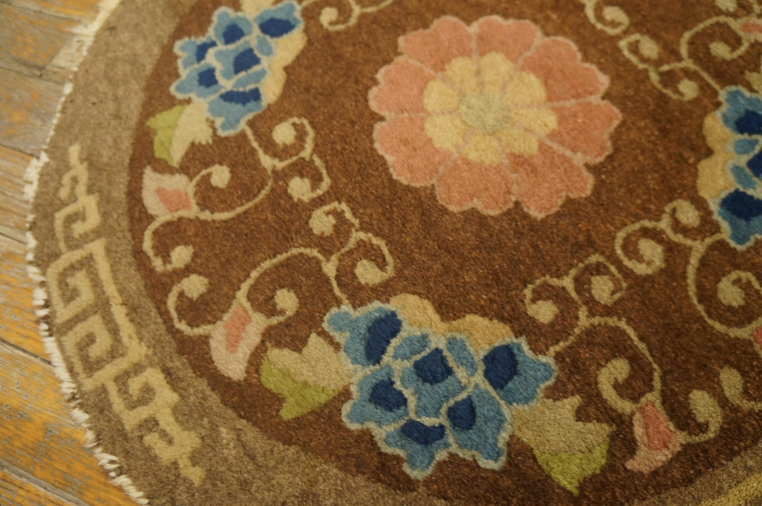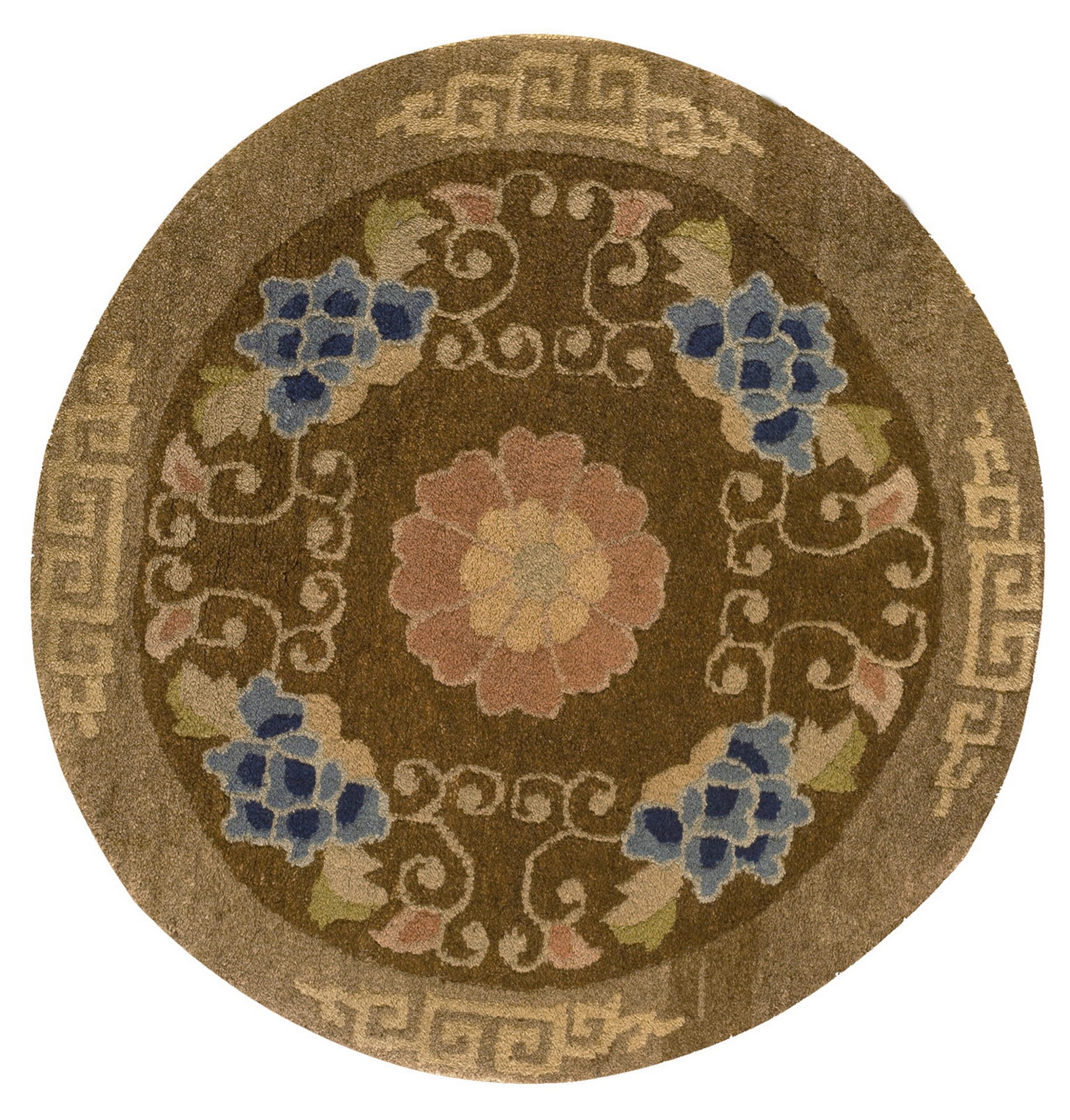 Antique Peking Small Scatter Size Wool Brown, Camel Rug, Circa Date: 1920s. This exceptional circular piece, originating from the sophisticated weaving traditions of Peking, presents a highly refined aesthetic. Its unusual round format and classic Chinese motifs make it a highly desirable example among antique rugs.