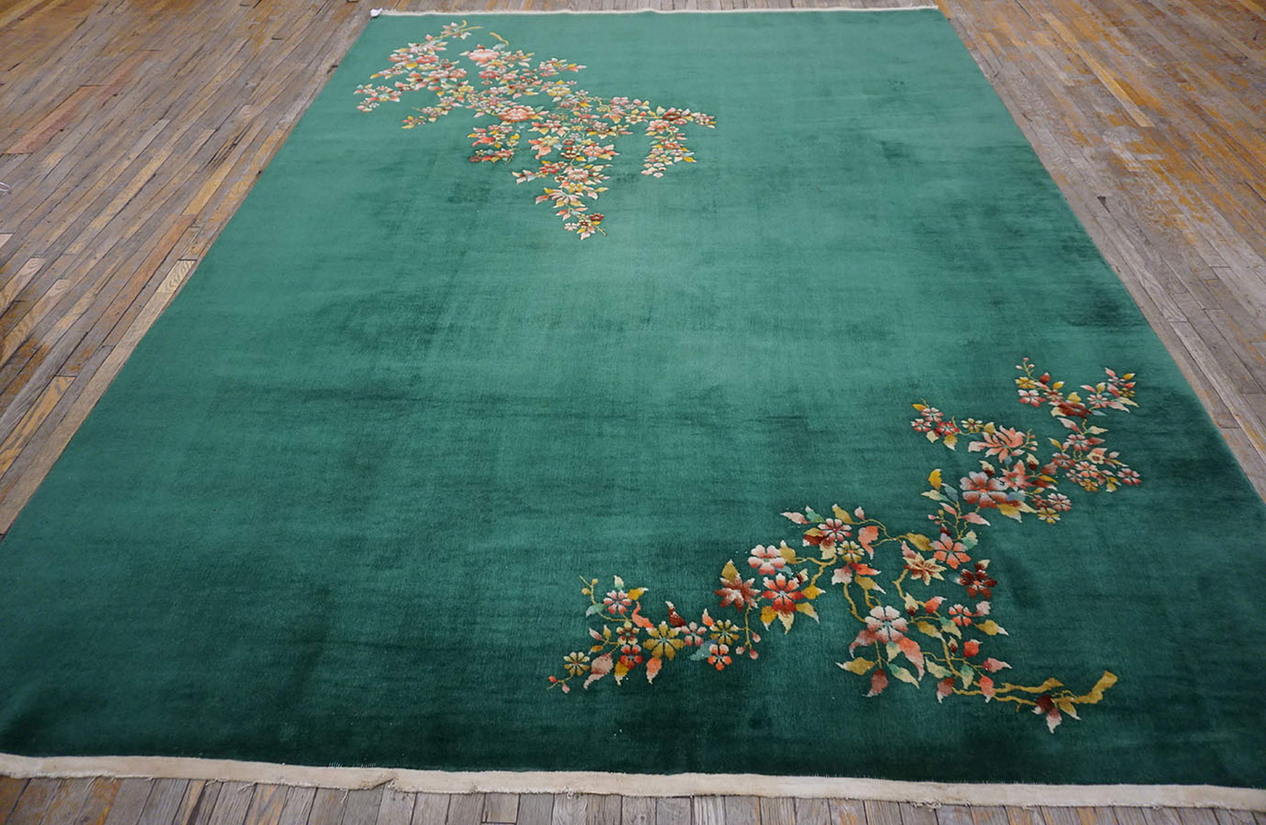 The defining characteristic of this carpet is its dramatic, saturated field of deep teal wool, which provides a plush, velvety backdrop. This bold use of color and expansive negative space is a hallmark of the Chinese Art Deco rugs movement, popularized by designers like Walter Nichols. The palette is rich yet restrained, perfectly capturing the sophisticated glamour of the 1930s era.