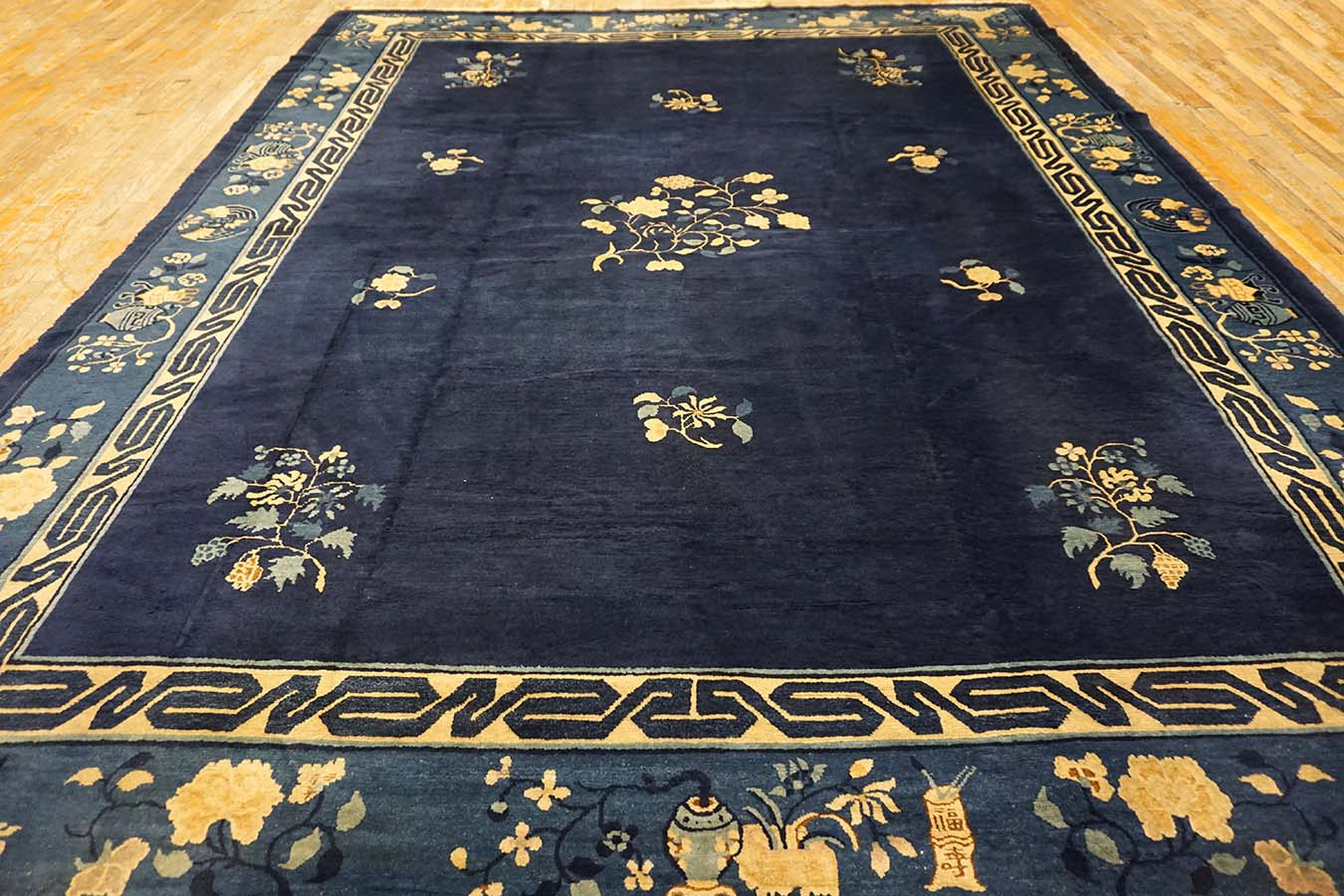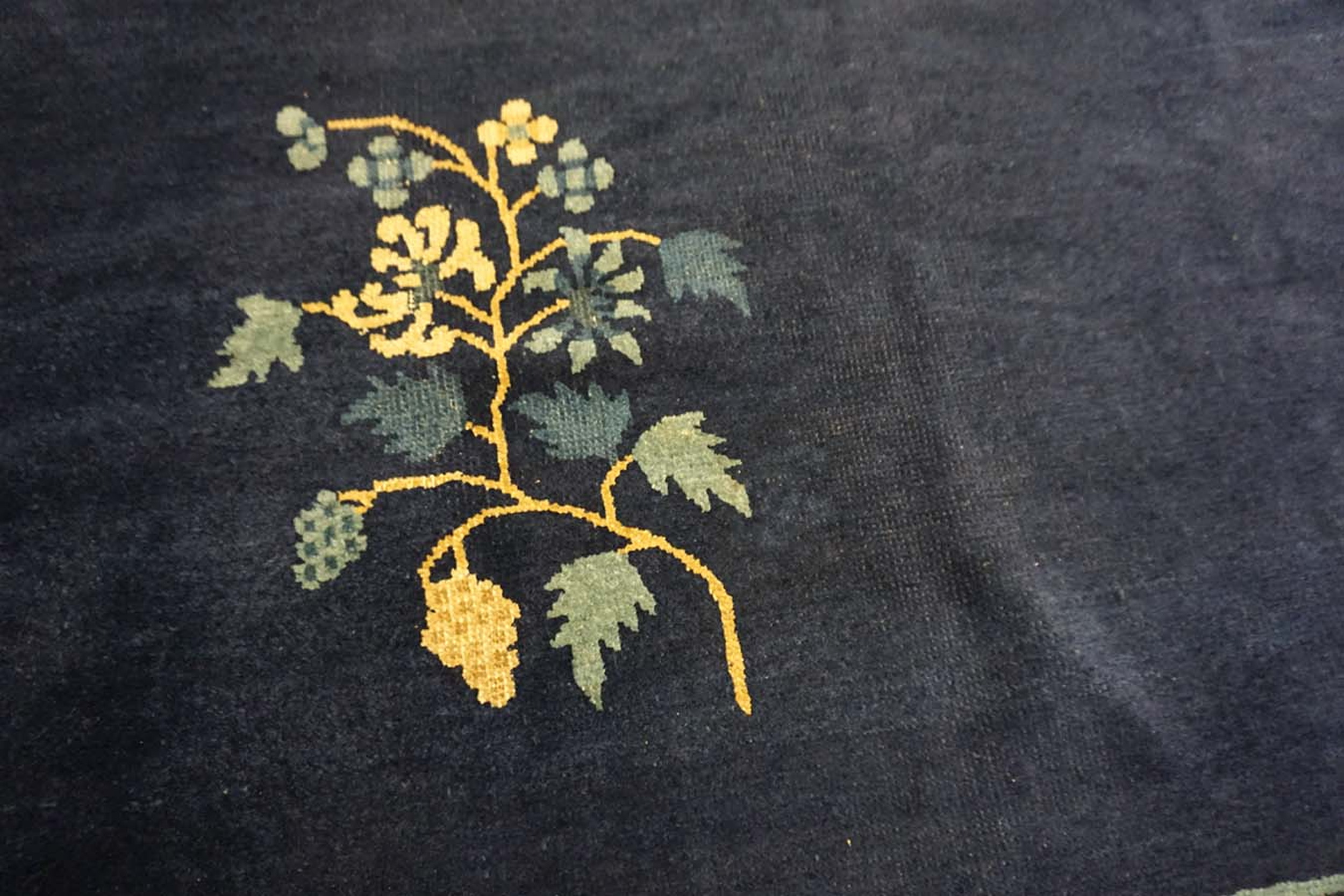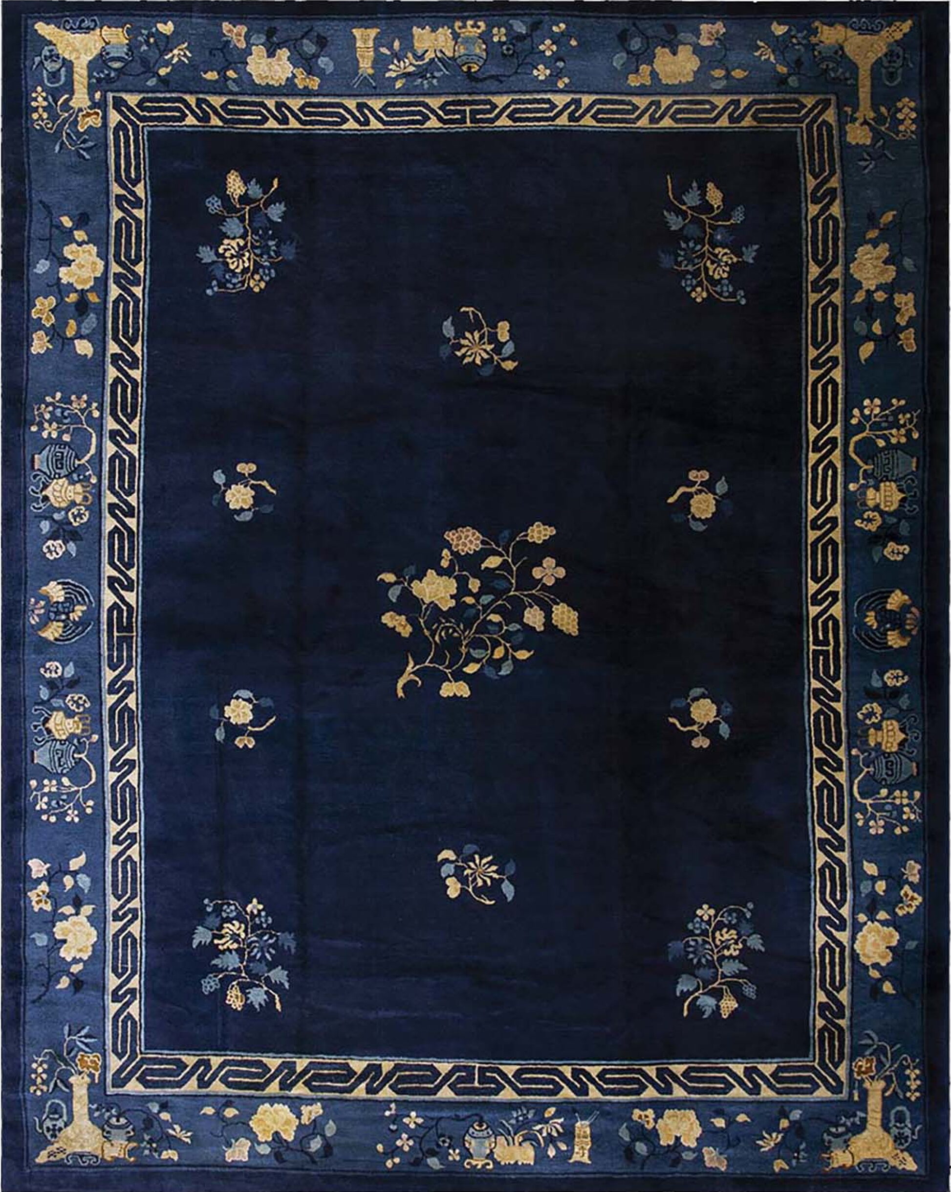 The commanding field is rendered in a rich, almost midnight indigo, providing a dramatic and sophisticated backdrop for the scattered motifs. This specific shade common among blue color rugs was highly favored in Chinese export pieces during the Republic era, lending the composition profound depth and reserved elegance.