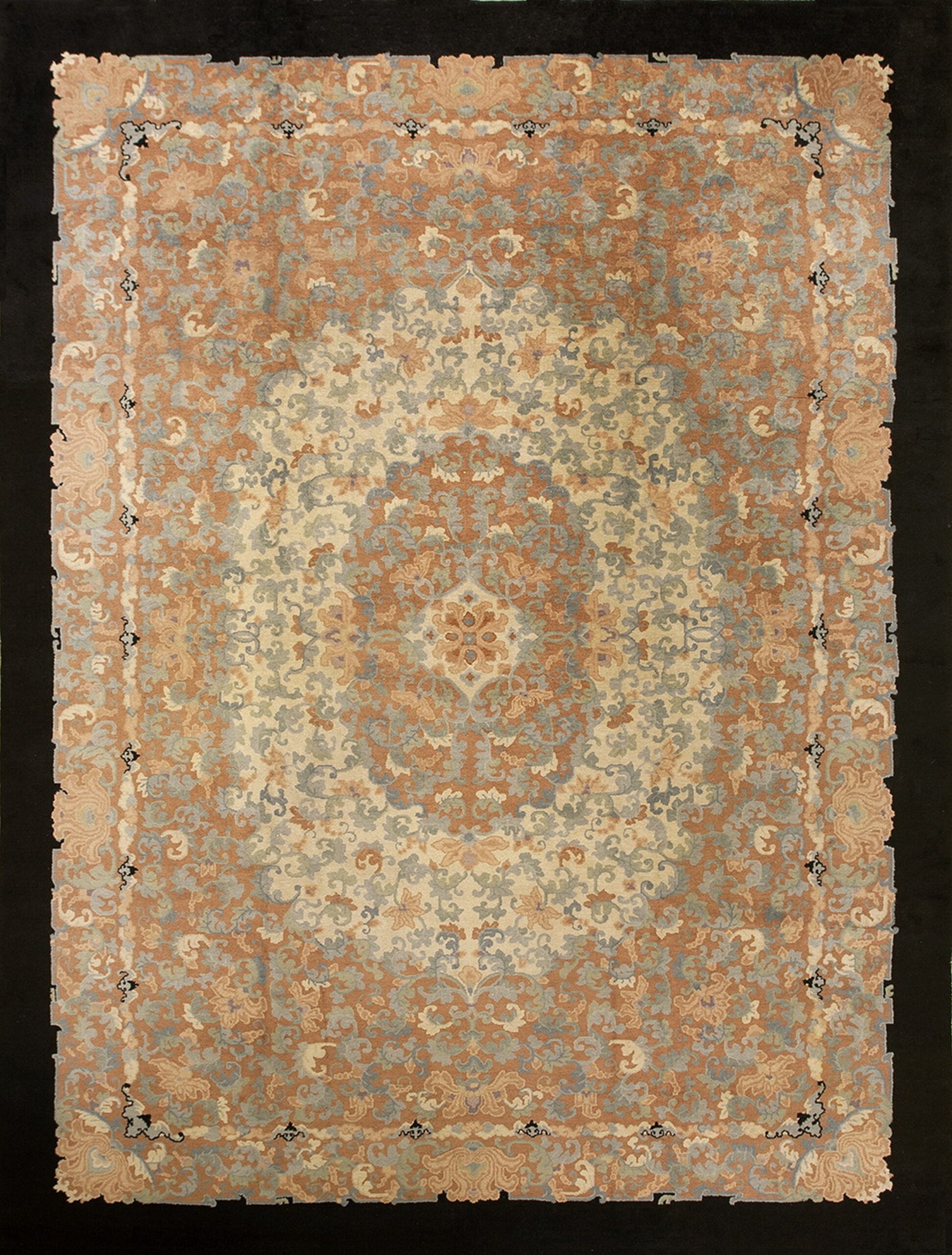The palette is a masterful blend of warm and cool tones, featuring soft terracotta, muted sage, and pale ivory ground colors. These gentle hues are dramatically framed by a wide, solid black color rugs border, a striking contrast that emphasizes the central field’s intricate detail and the rug’s overall presence.
