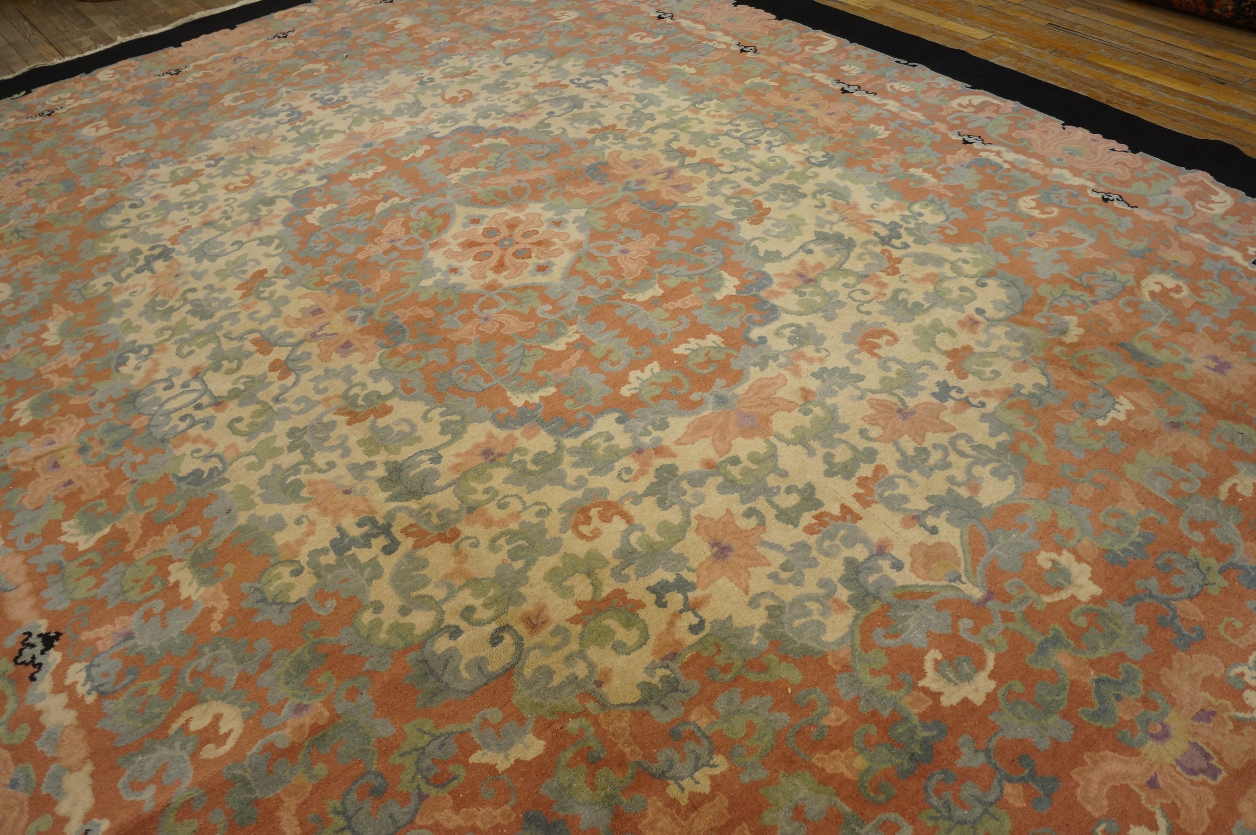 Antique Chinese Room Size Wool Black, Ivory Beige Cream White Rug, Circa Date: 1920s. This exceptional example of early 20th-century Chinese weaving presents a luxurious wool pile and a sophisticated all-over design. Its substantial dimensions classify it as a true room size rugs, making it ideal for anchoring a major living space or dining area with historical elegance.
