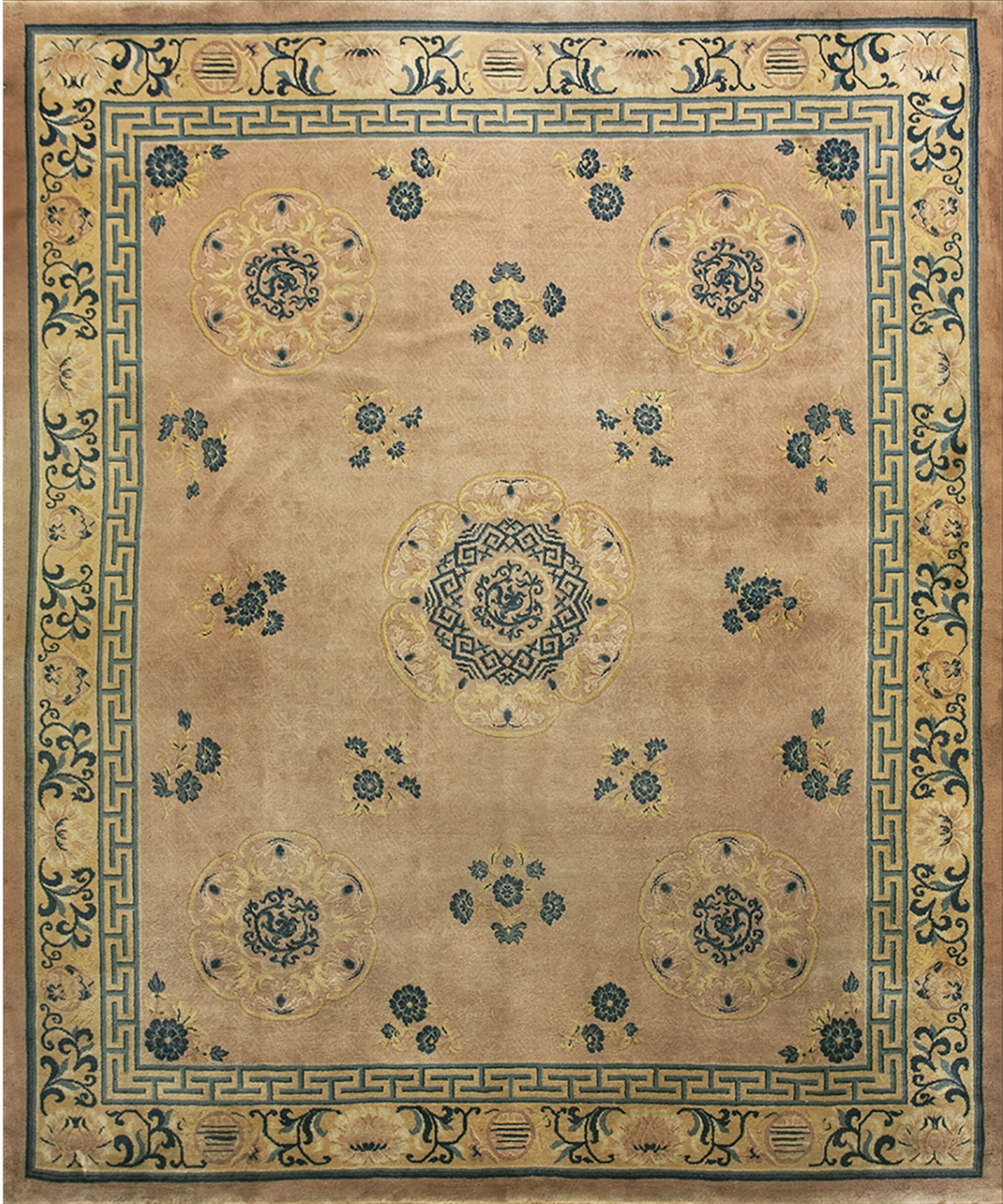 Antique Chinese Room Size Wool Dusty Rug, Circa Date: 1900s. This exceptional example of early 20th-century Chinese weaving presents a sophisticated, muted palette characteristic of the period. Its generous proportions classify it as a true room size rugs, ideal for anchoring a formal living space or grand dining area.