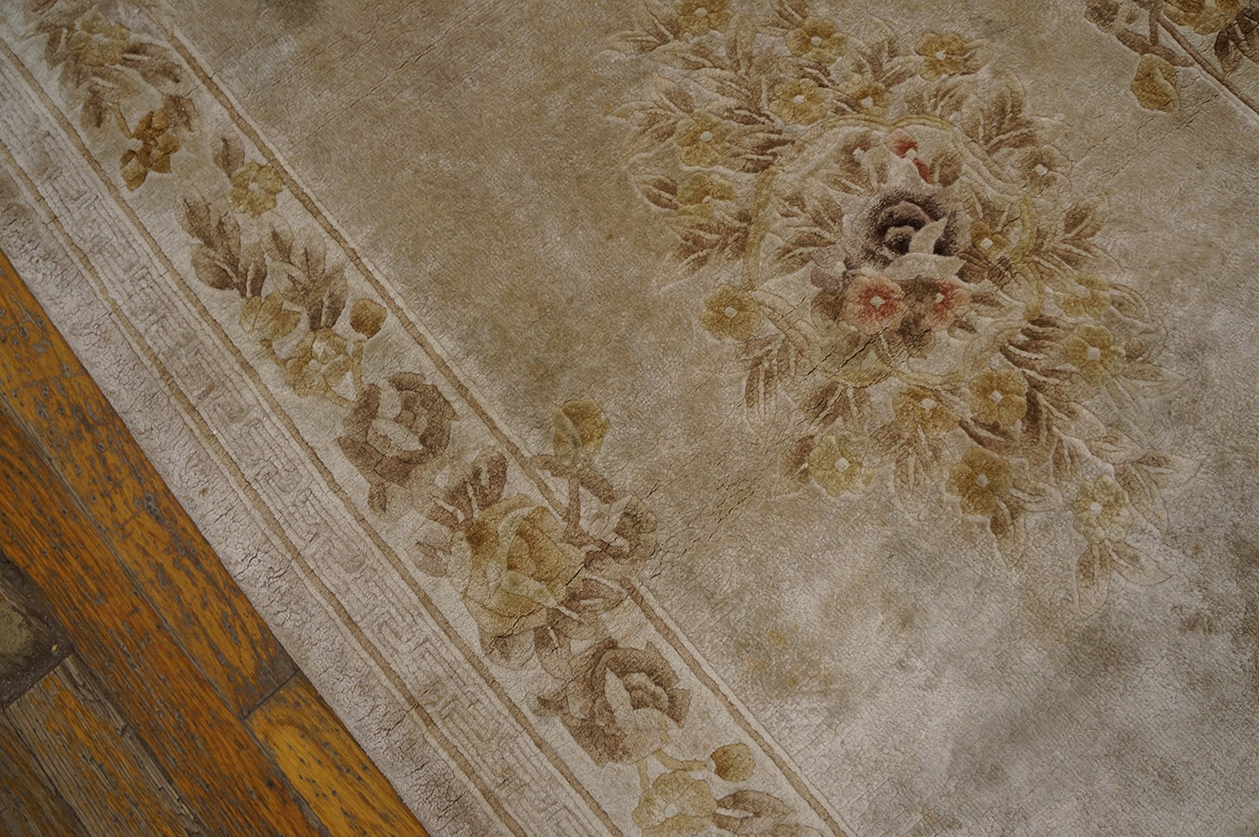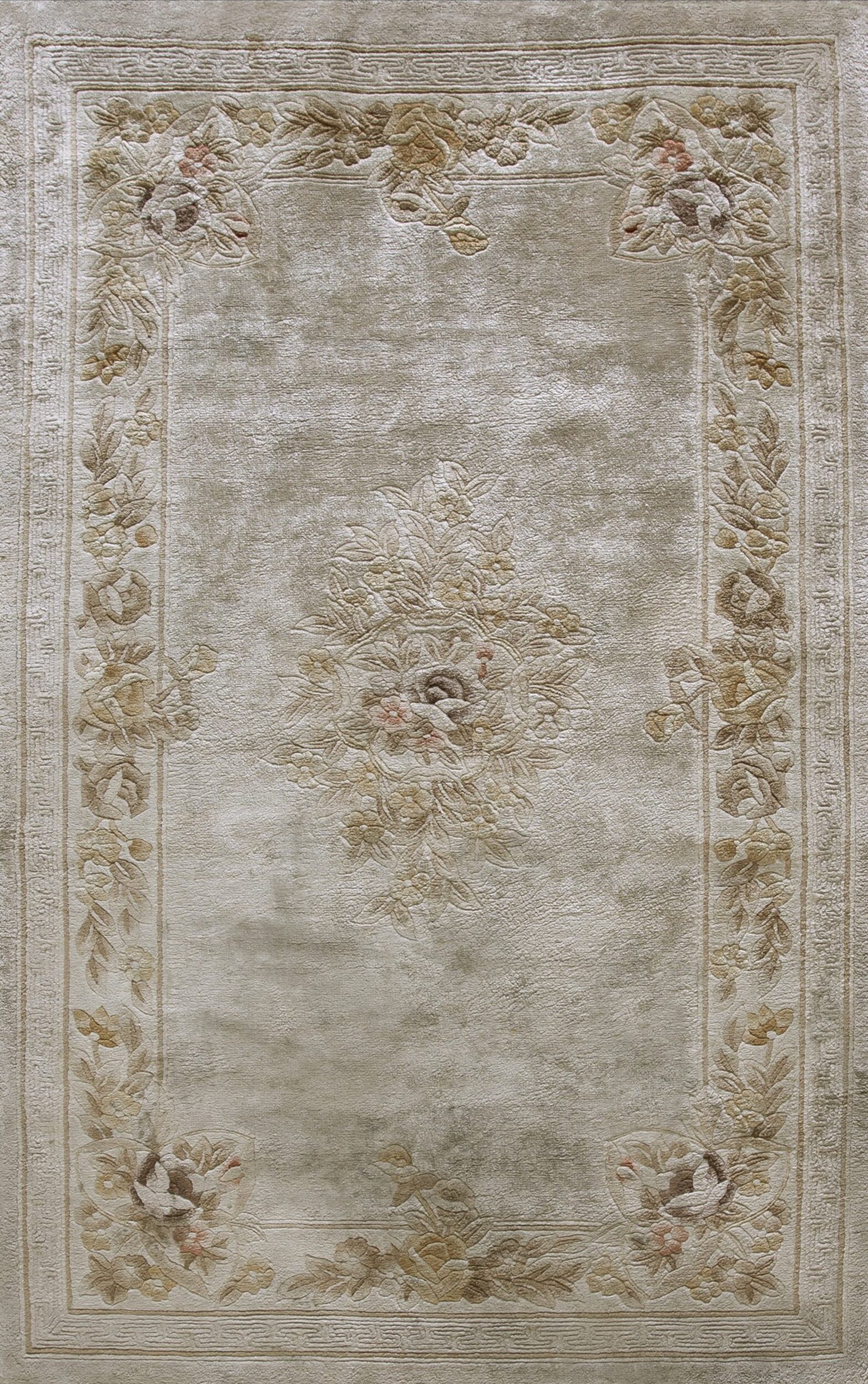 The design features an allover floral pattern, intricately rendered with a high-low pile technique that gives the motifs an embossed, sculptural quality. A central bouquet anchors the composition, surrounded by delicate vines and blossoms that extend into the main border. This technique is characteristic of high-quality Chinese weaving from this era.