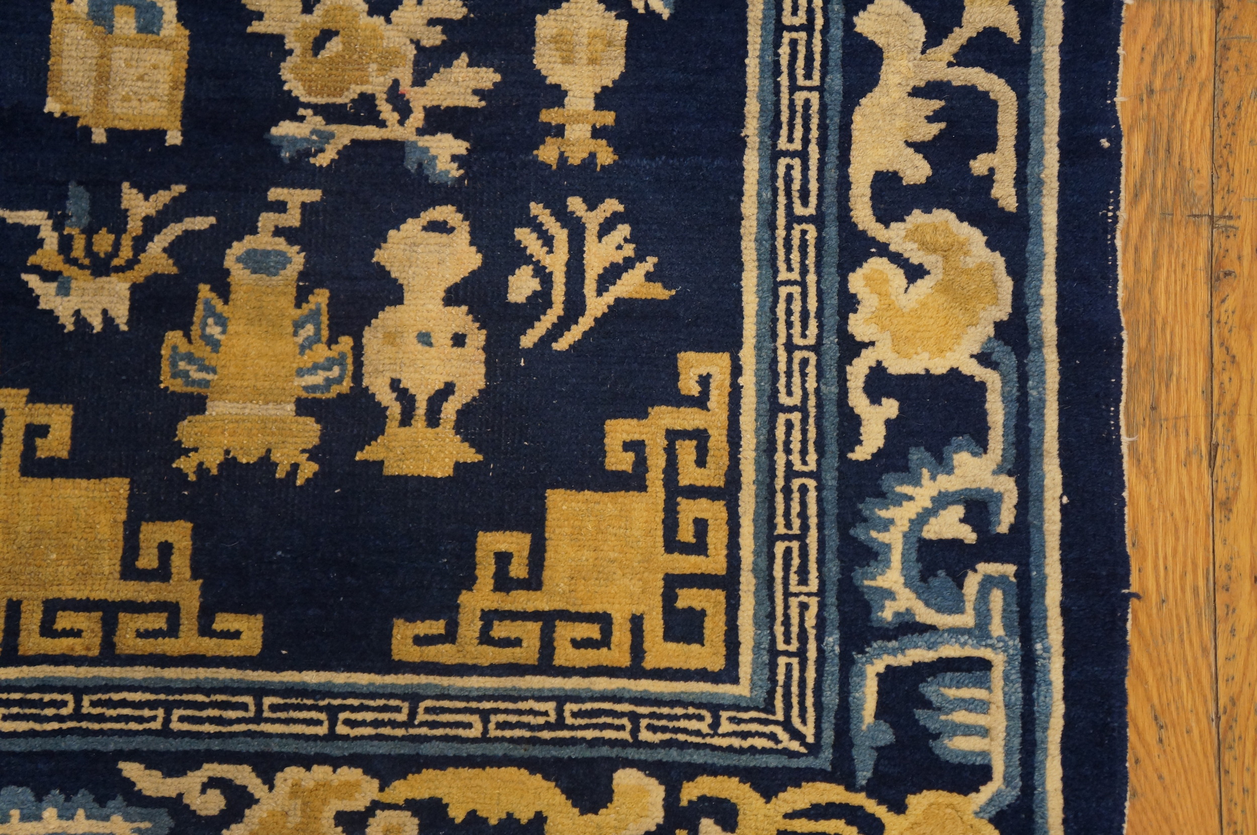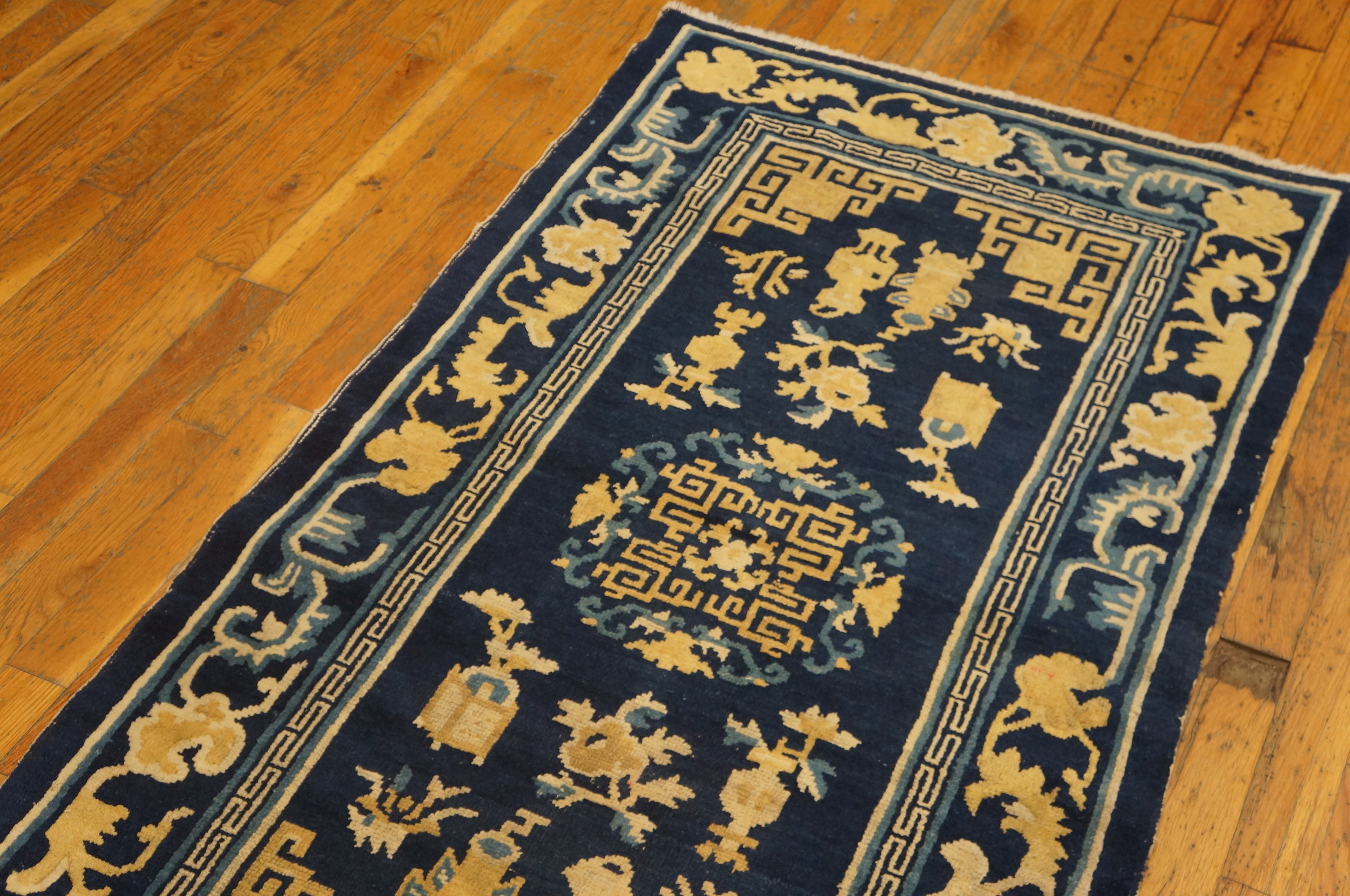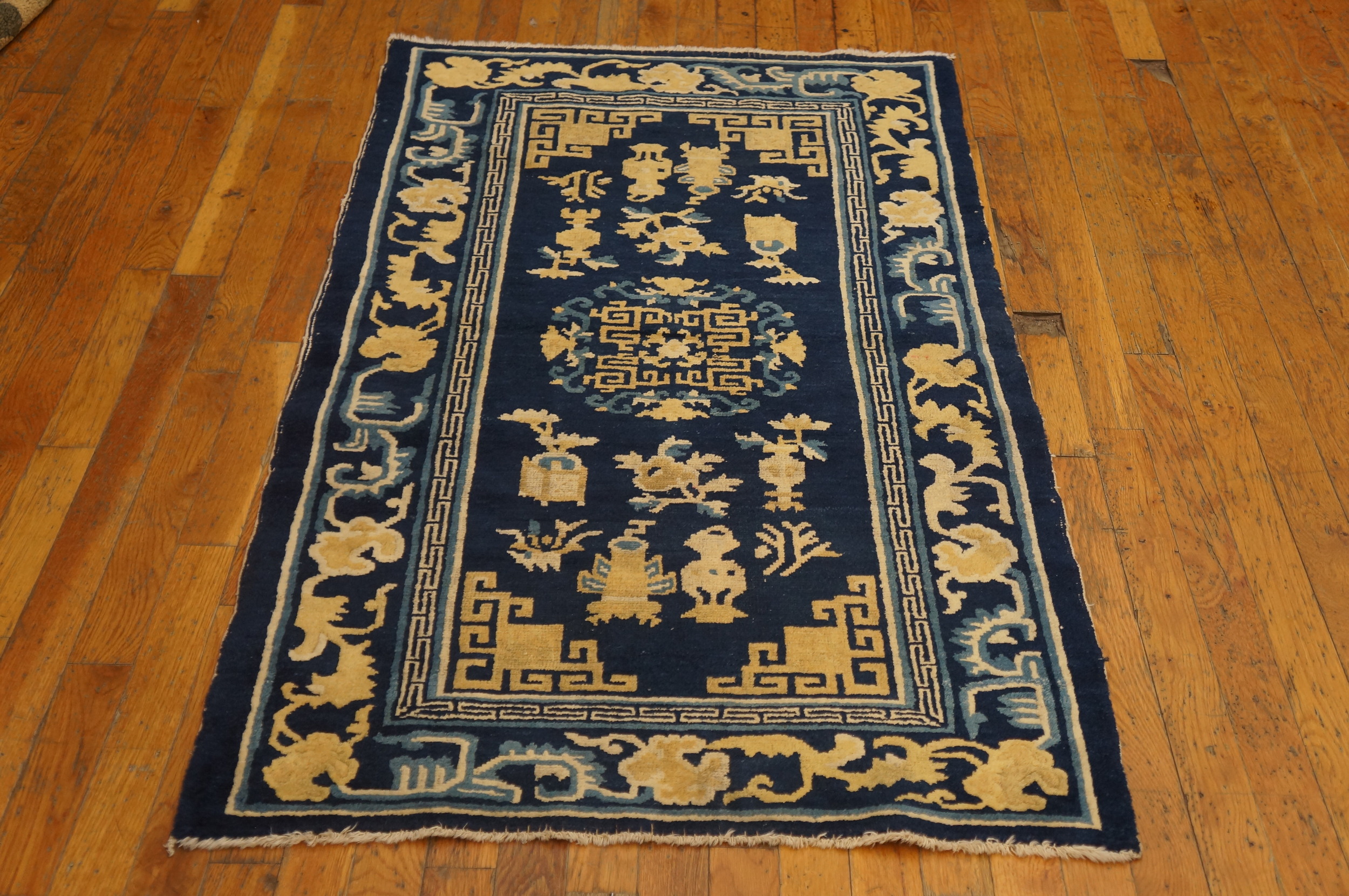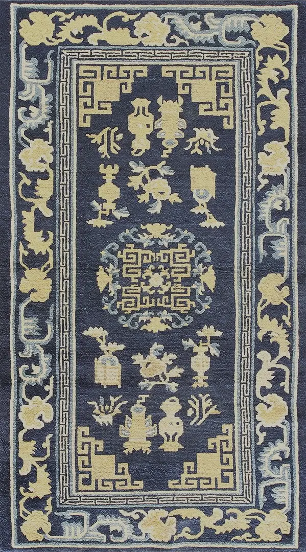Originating from the renowned weaving centers of Northern China, this piece exemplifies the sophisticated design language of the period. The field is populated with traditional Chinese symbols—vases, auspicious objects, and stylized flora—rendered in a bold, graphic style. As a genuine example of antique rugs, its condition and clarity of design are remarkable for a piece well over a century old.