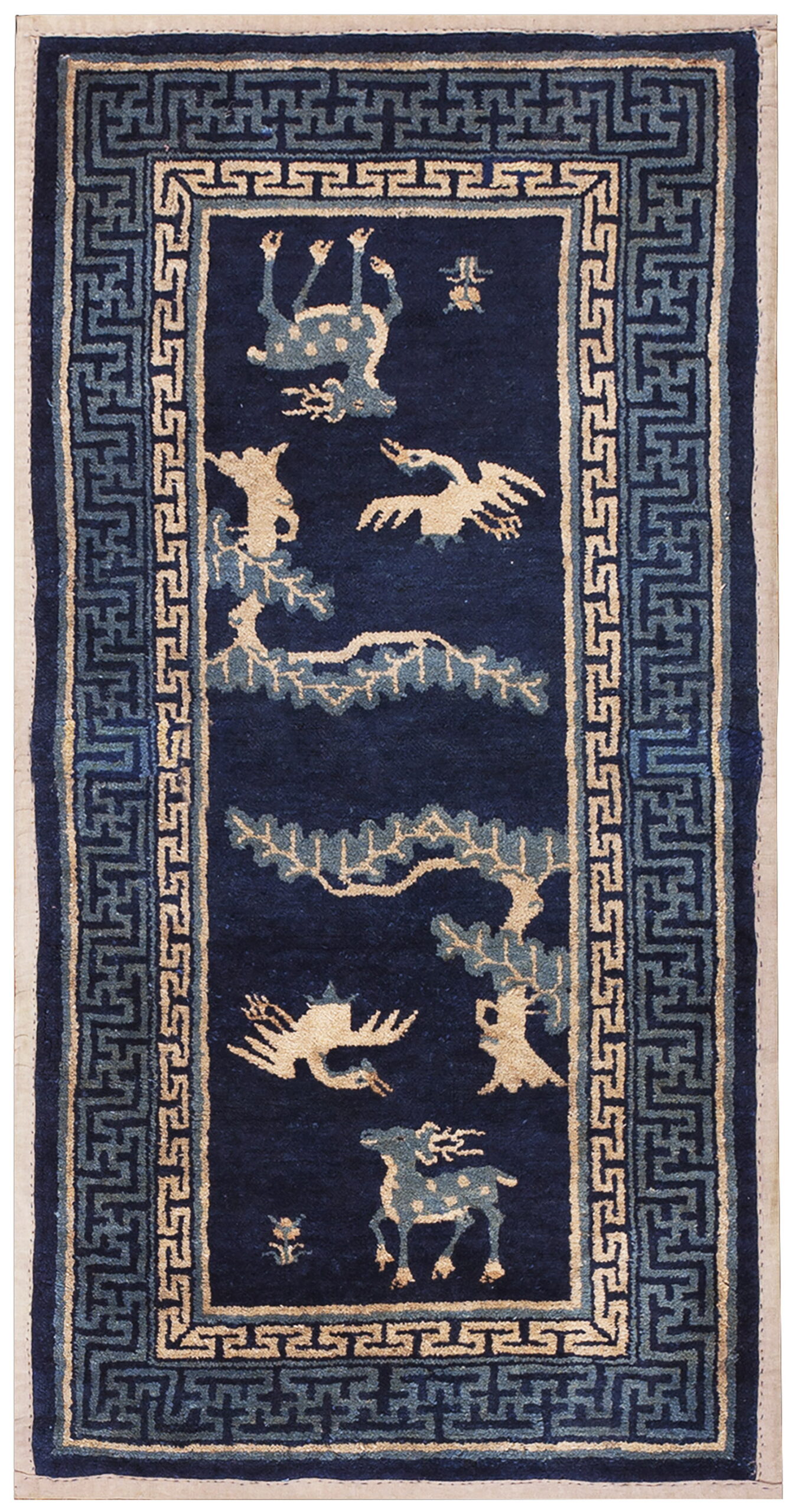 The deeply saturated indigo field provides a dramatic backdrop for the stylized fauna and flora. Rendered in contrasting cream and pale cerulean, the symbolic imagery—including deer, cranes, and pine trees—is often associated with longevity and prosperity. These are traditional floral rugs motifs interpreted through an East Asian lens.